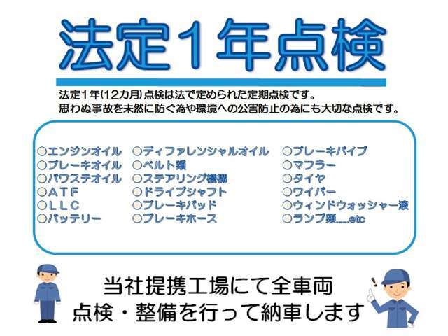 法定整備 | 法定整備付 法定12ヶ月点検付※貨物など一部車両は6ヶ月点検 ☆安心の法定1年点検☆ 全車両、提携工場にて法定1年点検・整備の作業を行ってからの納車になります。※こちらの料金などもすべて総額表示に入っておりますので追加費用は頂きません。 |