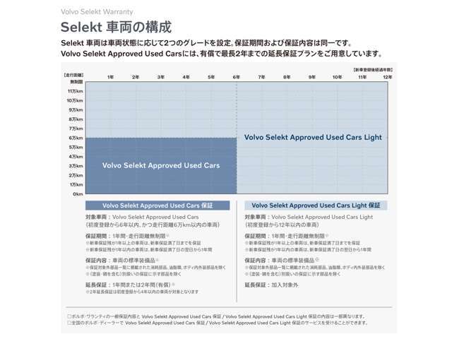 法定整備 | 法定整備付 法定12ヶ月点検付※貨物など一部車両は6ヶ月点検 ◆SELEKT認定中古車整備付◆正規認定中古車の安心感、確かなクオリティをお約束。車両の事前整備を行い、グッドコンディションとしたものだけを、VOLVO SELEKT APPROVED CARとしています。 |
