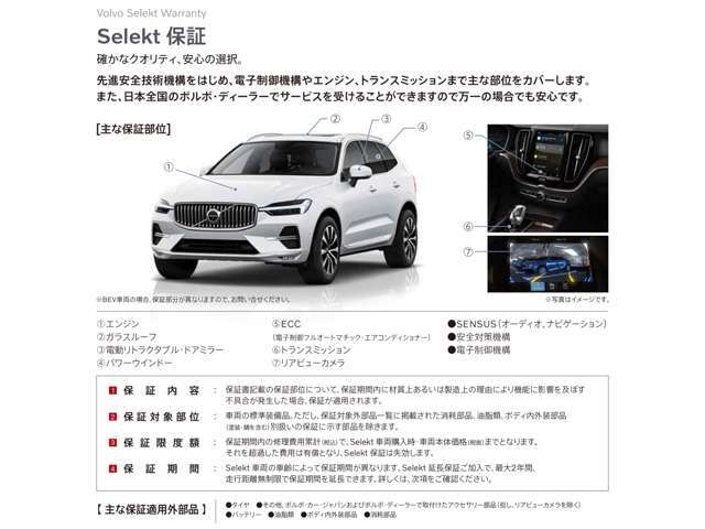 法定整備 | 法定整備付 法定12ヶ月点検付※貨物など一部車両は6ヶ月点検 ◆SELEKT認定中古車整備付◆正規認定中古車の安心感、確かなクオリティをお約束。車両の事前整備を行い、グッドコンディションとしたものだけを、VOLVO SELEKT APPROVED CARとしています。 |
