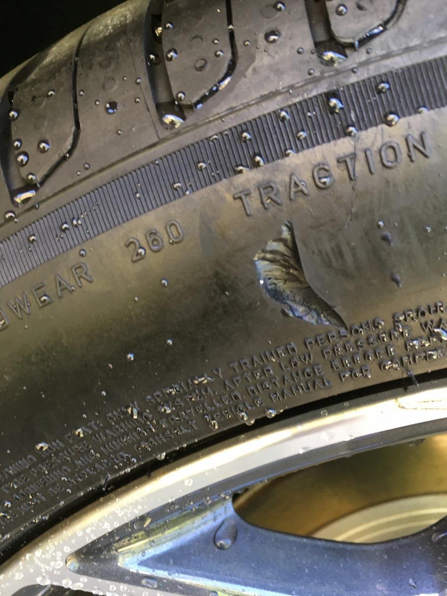 ◇むき出しのボルトにひっかけてタイヤのサイドウォールとホイールにガリ傷が。ホイールは我慢してタイヤはBMWのタイヤパンク保障でタダで交換してもらいました。