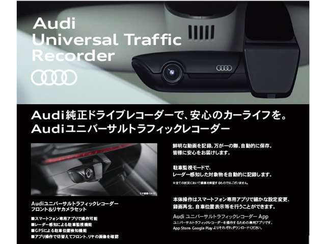 補足 | - | - | Audi専用に開発された、スタイリッシュなデザイン。スマートフォンの専用アプリを操作して、録画等の情報を確認出来ます。※Apple、Android端末に対応。【フロント・リヤ・取付工賃含む】 |