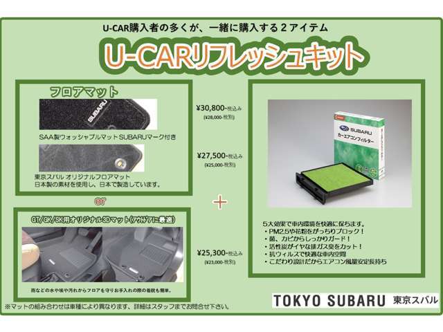 補足 | - | 快適空間に必須!お客様からのご要望の多いフロアマット・エアコンフィルターをSETにしたお買い得なパッケージとなります! | 新品マット・エアコンフィルターをセットにしたU-CARリフレッシュキットと人気純正ボディコーティング『SUBARUダイヤモンドKeePer』をセットにした人気プランです! |