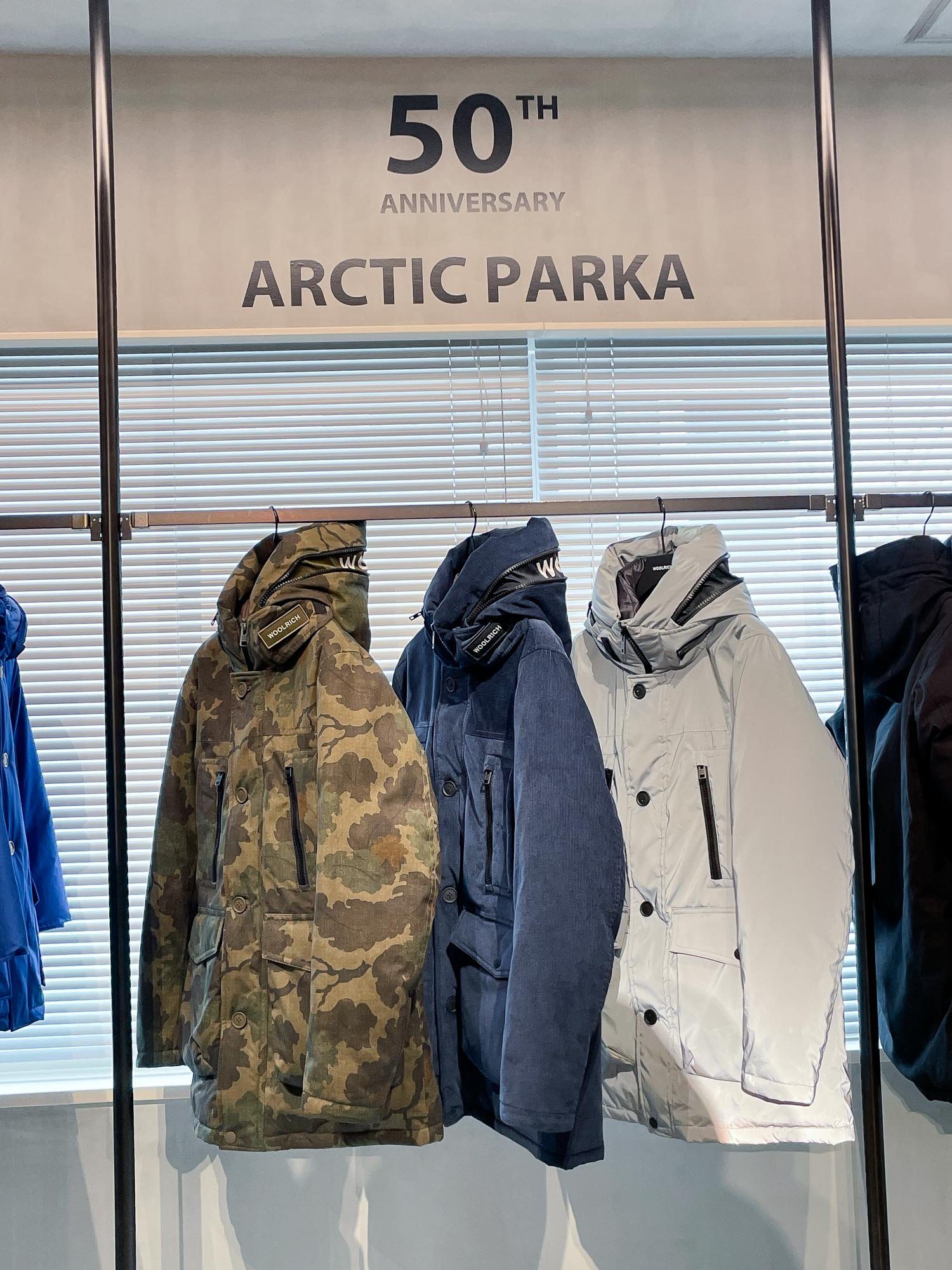 「ウールリッチ(WOOLRICH)」は、ブランドを代表する「アークティックパーカ(ARCTIC PARKA)」が誕生から50周年を迎えることを記念したアニバーサリーモデルを製作。同ブランドはアメリカ東海岸でスタートしており、「ザ・ノース・フェイス(THE NORTH FACE)」や「アークテリクス(ARC'TERYX)」といった高みを目指すクライミングなどをルーツに持つ西海岸やカナダのブランドに比べ、低層の山が多い東海岸の特徴から狩猟やロングトレイルがブランドのベースとなっている。そのため、ウールリッチのアイテムは荷物や装飾品を減らした「長時間快適であること」を基盤とした服作りが多く、クリーンな“落ち着いた”デザインに仕上げられている。そうした背景から40~50代を中心に支持を集めていたが、人と被らないアイテムを求める20~30代の購買数も増えているという。アークティックパーカのアニバーサリーモデルでは、ジップやマジックテープでブランドロゴが見え隠れする仕様を採用した。一部の20~30代からは「ロゴを目立たせたい場面もある」という需要もあるためロゴ入りのアイテムも製作はするが、今後もブランドのベースにある落ち着いたデザインを維持していく方針だ。