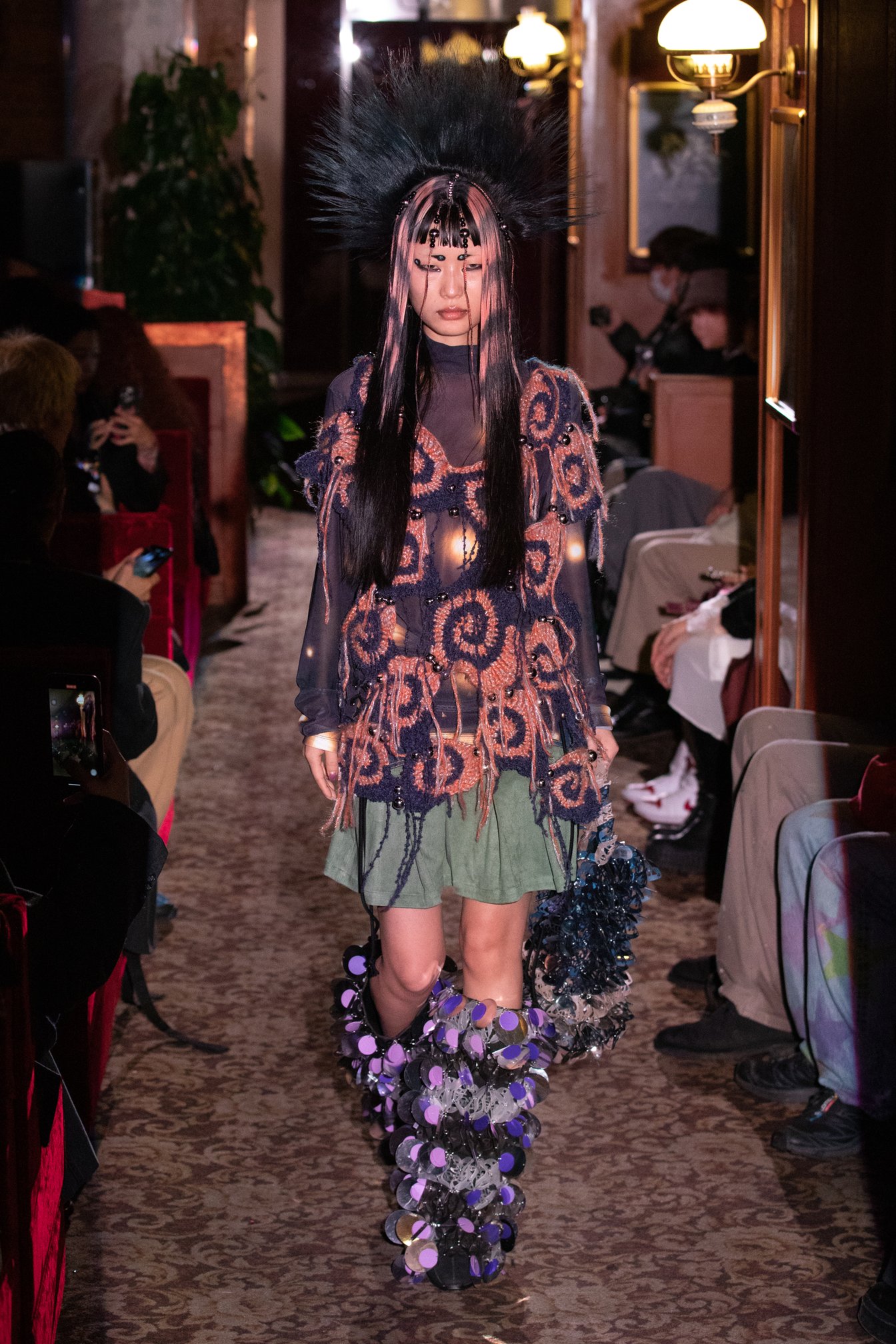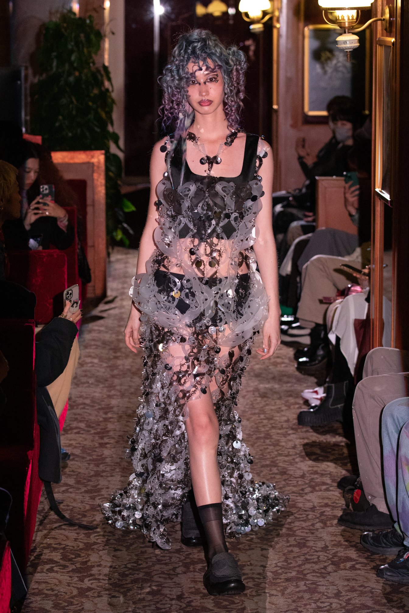 初日に渋谷から離れ、新宿の珈琲西武で初めて東京でのショーを発表したのは、上海ブランド「ユェチ・チ(YUEQI QI)」。コロナ直前の2019年冬に上海ファッションウィーク中に実施される若手輩出プラットフォーム「LABELHOOD」で、代表のTasha Liu氏に「このあと、インスタレーション発表するブランドは面白いから」とオススメされて観たのが、まさにユェチ・チだった。(文:Yoshiko Kurata)