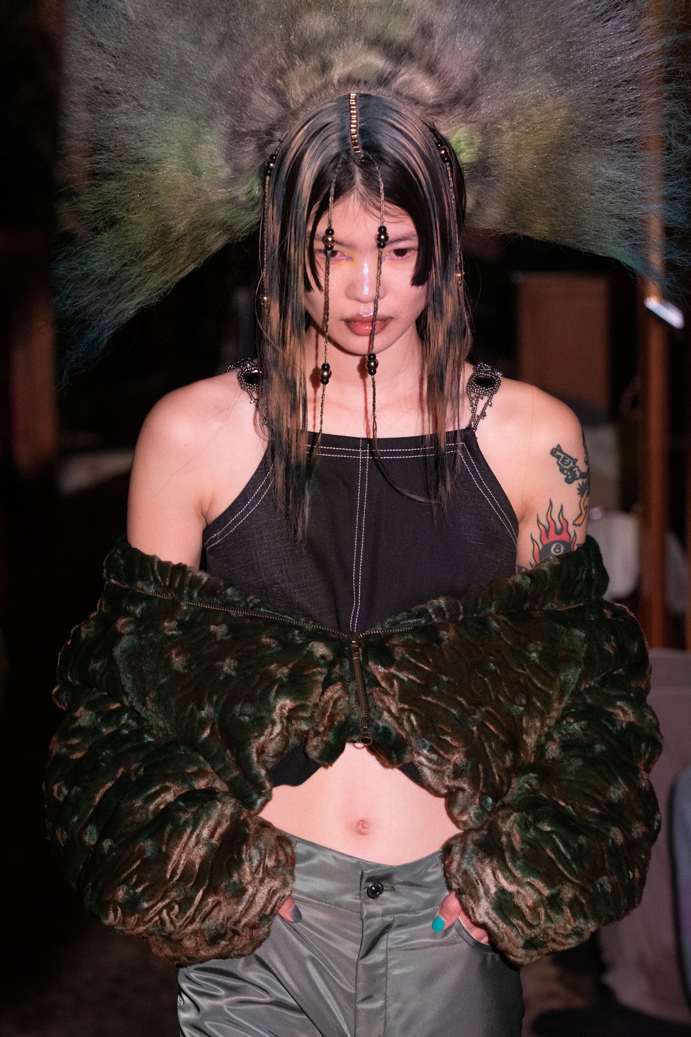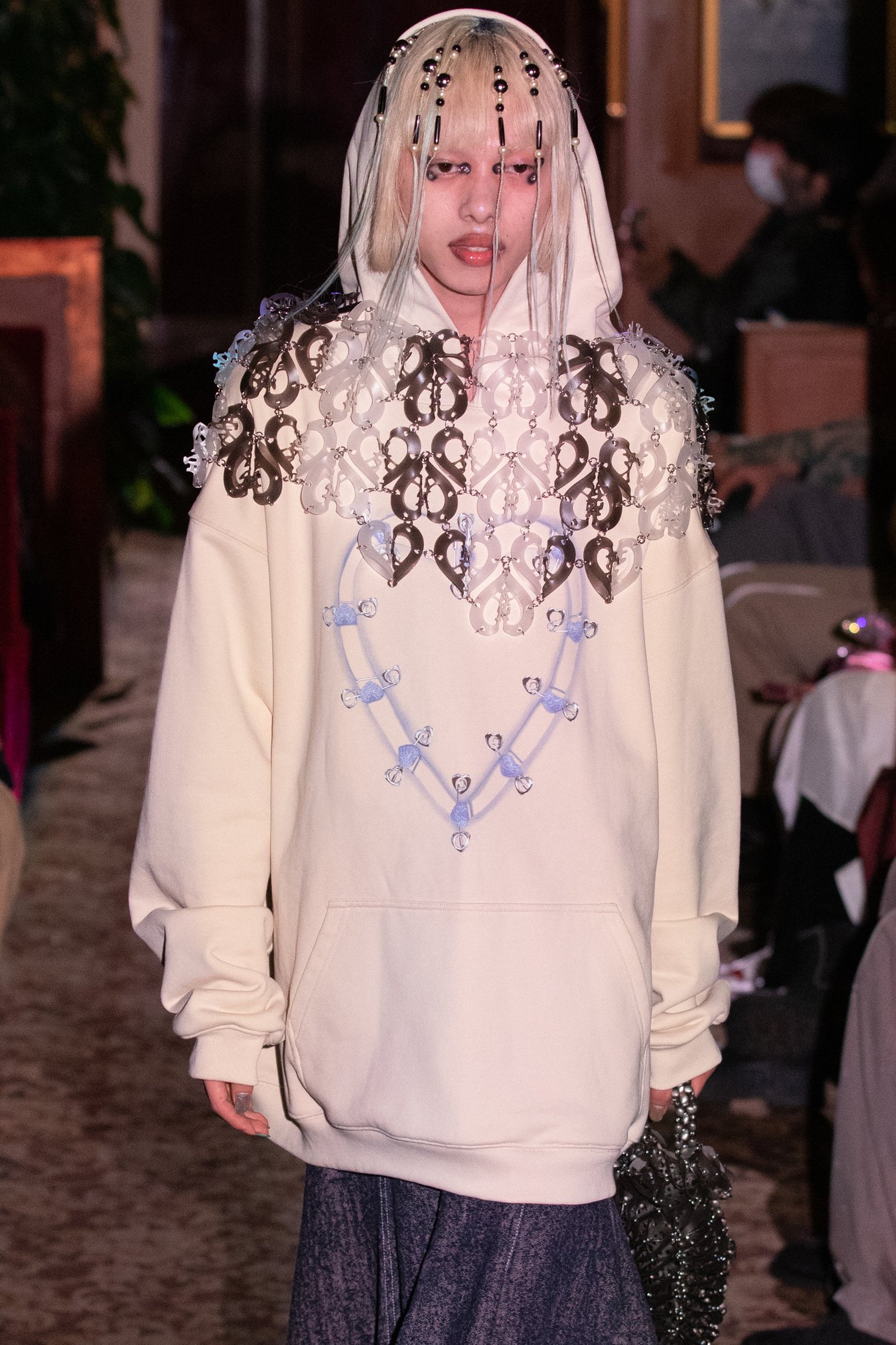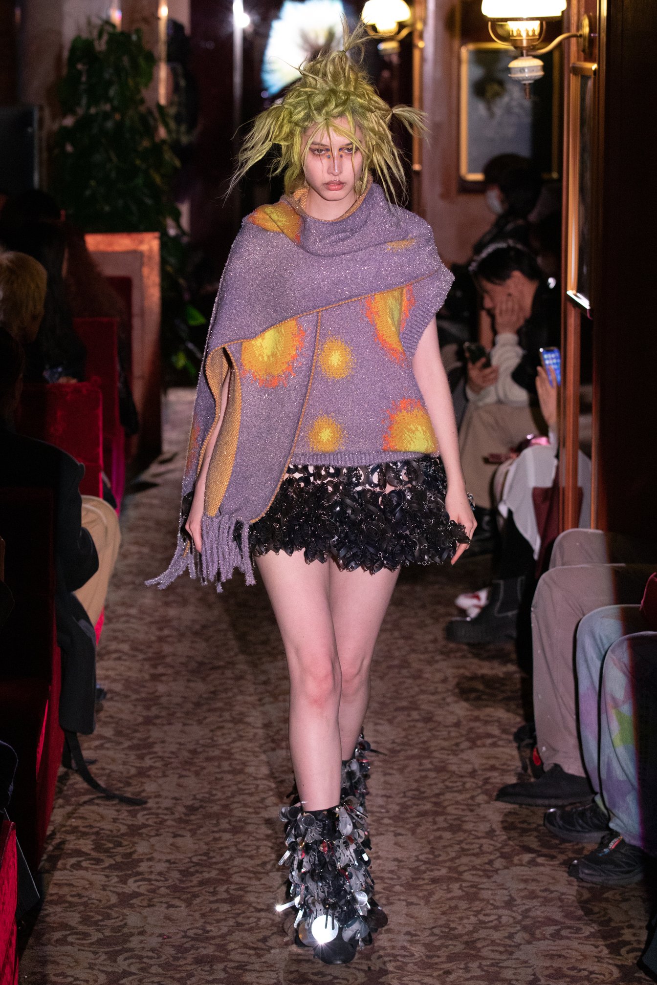 「過去 / 現在」とつぶやくBGMの中、シャラシャラとゆっくりと音を立てて歩くスパンコールブーツ。グリッターが施されたメイクと21AWから共にするヘアデザイナー・Tomohiro Konoによるヘア、ビーズネットや太陽系の柄がプリントされたアイテムなどをまとったモデルが登場するたびに、会場中に光が乱反射し、時空の一瞬に解き放たれたような感覚になる。デビュー当時に感じたわかりやすい「中国ブランドらしさ」は徐々に薄まっているものの、中国に脈々と残る歴史と近年の未来志向な発展を肌で感じるYueqi氏だからこそ、いままで積み上げてきたクラフトマンシップへの重きを忘れることなく未来へと前進できる力強さを感じた。