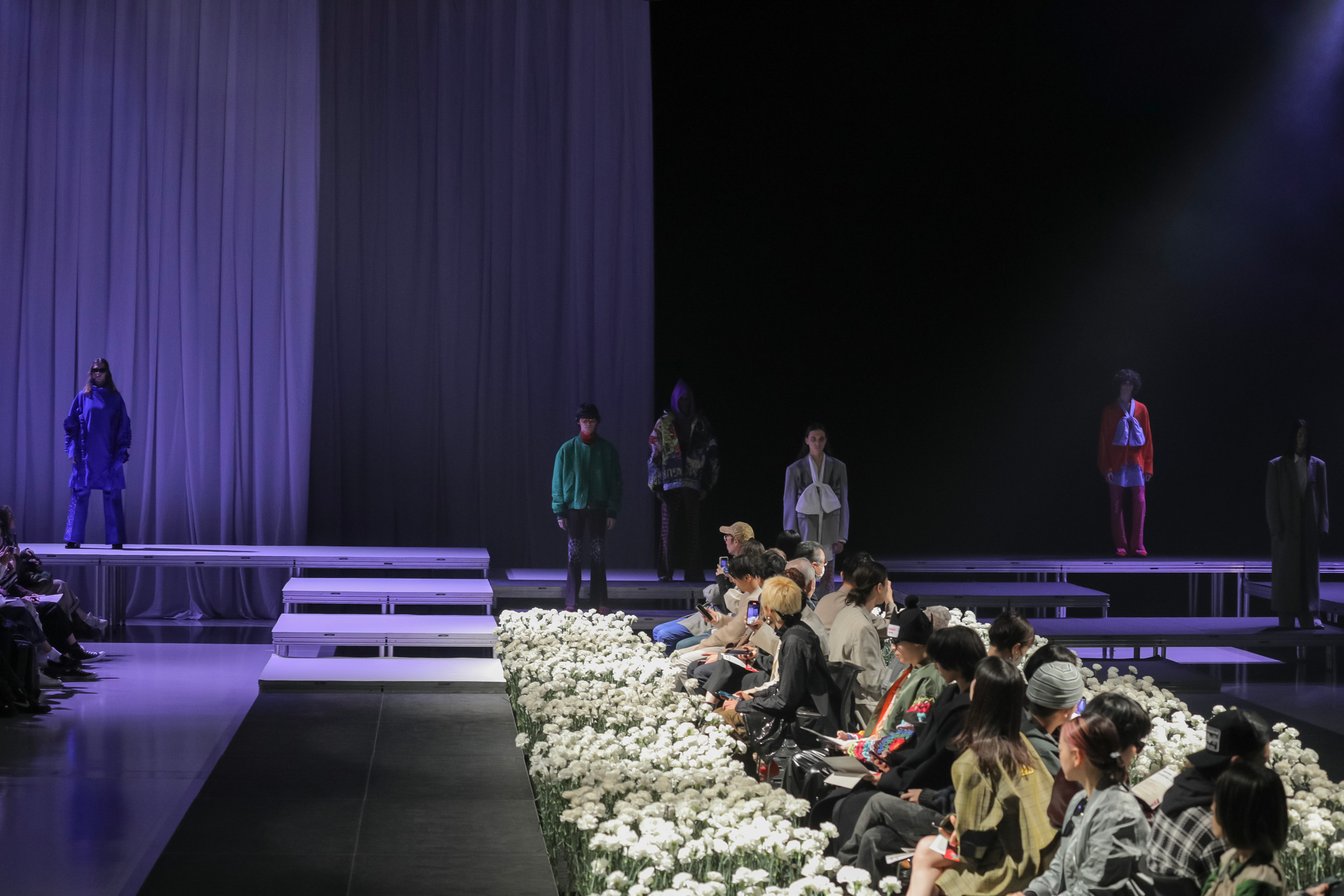 その言葉のとおり、まさに会場でショー後に自由に配布された白色のカーネーションは、社会的に価値がなくなったとされるフラワーロスをフラワーアーティスト・Hikaru Seinoとの協業でスポットライトを当てなおす試みだった。