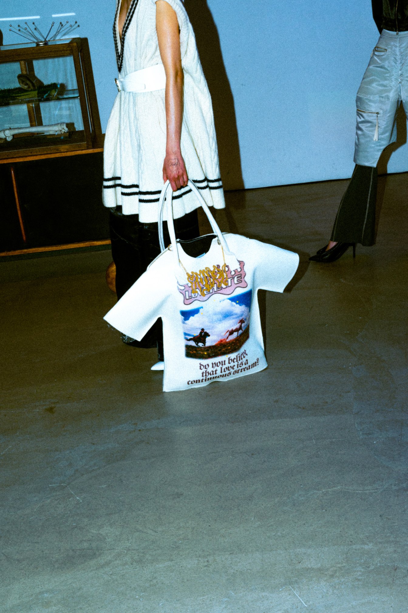 それら生活空間と調和するモチーフとは別に、今回のキービジュアルにも使われたバンドTシャツを意識したというグラフィックデザインが具体的なモチーフとして登場。しかし大野氏の「Tシャツは作らない」というこだわりにより、本来の目的とは思わぬ形で、鞄に落とし込まれた。これまで素材への探究心からはじまり、人間に/女性に着させるにはという考えから機能美と建築的な造形美を両立させてきた彼の着眼点からは意外な選び方になったように感じたが、これもまた棚に置かれているがらくた、と同じく価値を失った平凡だけれど、どこか愛おしいものとして研究対象に入ったようだった。