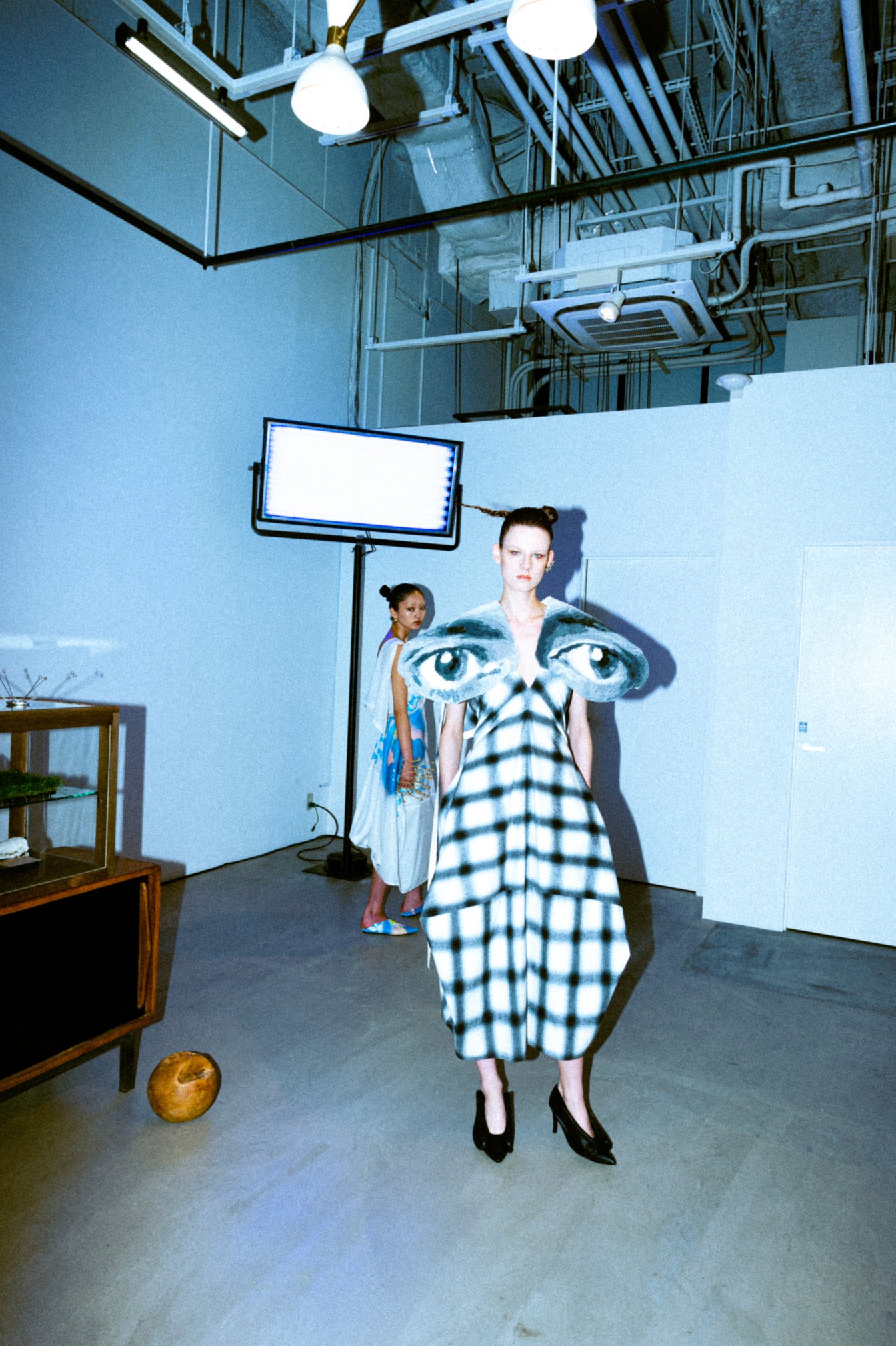 前回のショーを見ていない限り、なんとも今回の発表を単体に捉えるのは違うように感じつつも向かったシンプルな会場は、自然光が降りそそぎ、段差もなくフラットにモデルが立ち並ぶ。 通りすがりの通行人が「マネキンなんじゃない」とつぶやくほどに、モデルが周辺に置かれているインテリアや家具と同化しているようだった。前日の電車に揺られながら、大野氏の住まいがアトリエ兼の住居として使っているため生活にメリハリがなくなっていることを話したのだが、ある意味、クリエイションと日常がシームレスに繋がっているライフスタイルだからこそ、今回の空間がつくりあげられたのだと腑に落ちた。棚に置かれているのは、実際にアトリエで飾られているがらくたから価値のあるものまで ー 目の形をしたオブジェ、フランスパンのおもちゃ、シルバーのプロダクトなど ー さまざまに優劣なく並ぶ。