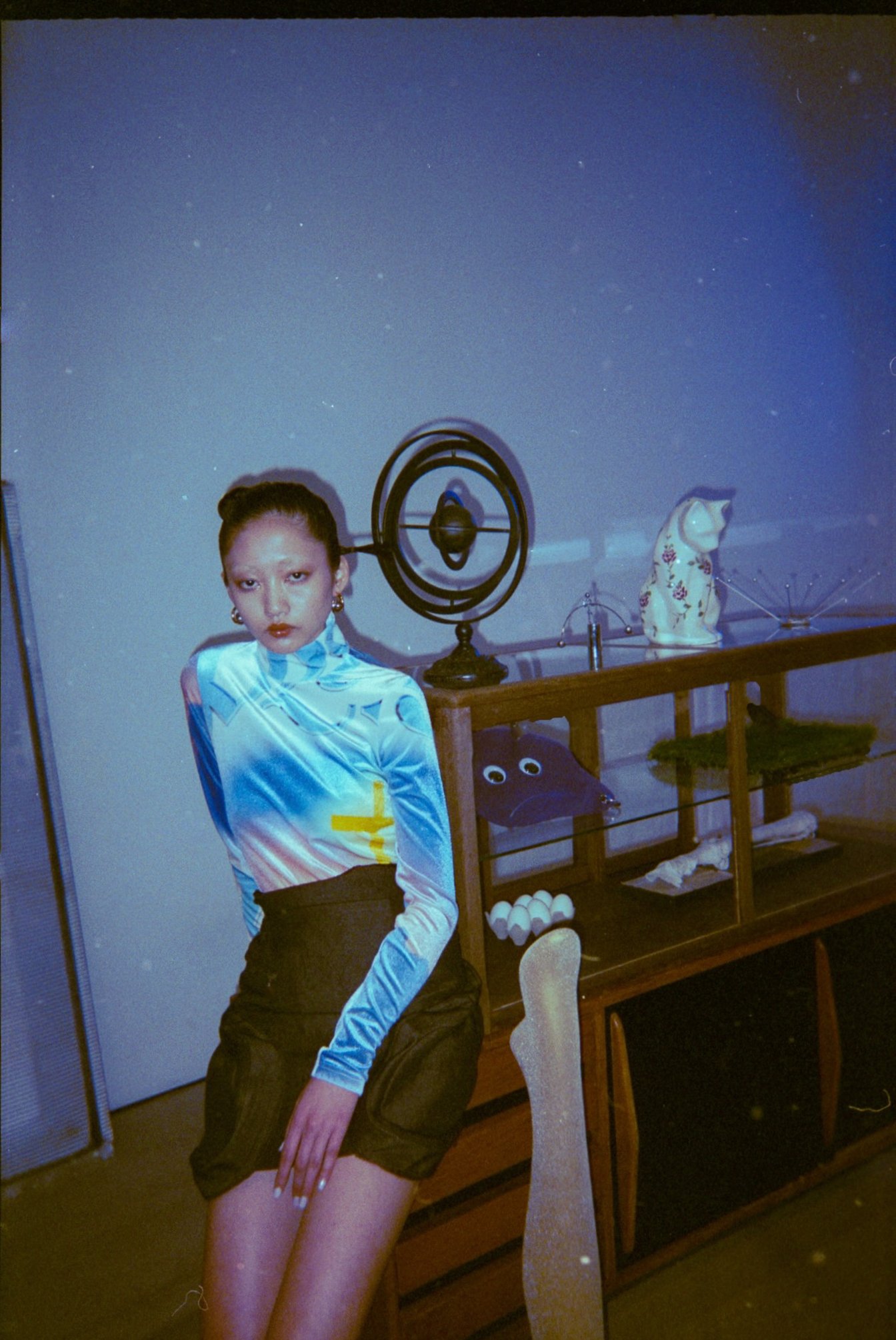 そんな急激な成長を遂げたユェチ・チの東京での初めてのファッションショーは、前回のシーズンから興味の矛先を向ける「宇宙」を感じさせる眩い光が55年の歴史を持つ喫茶店を強く照らし、わたしたちを過去でも現在でも未来でもない時空へと誘う。