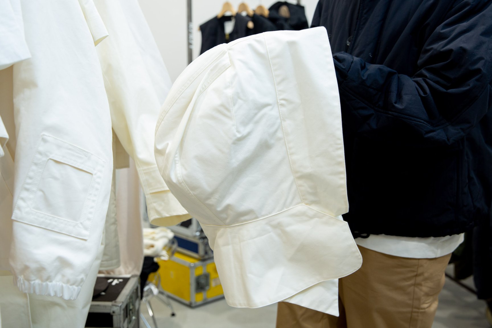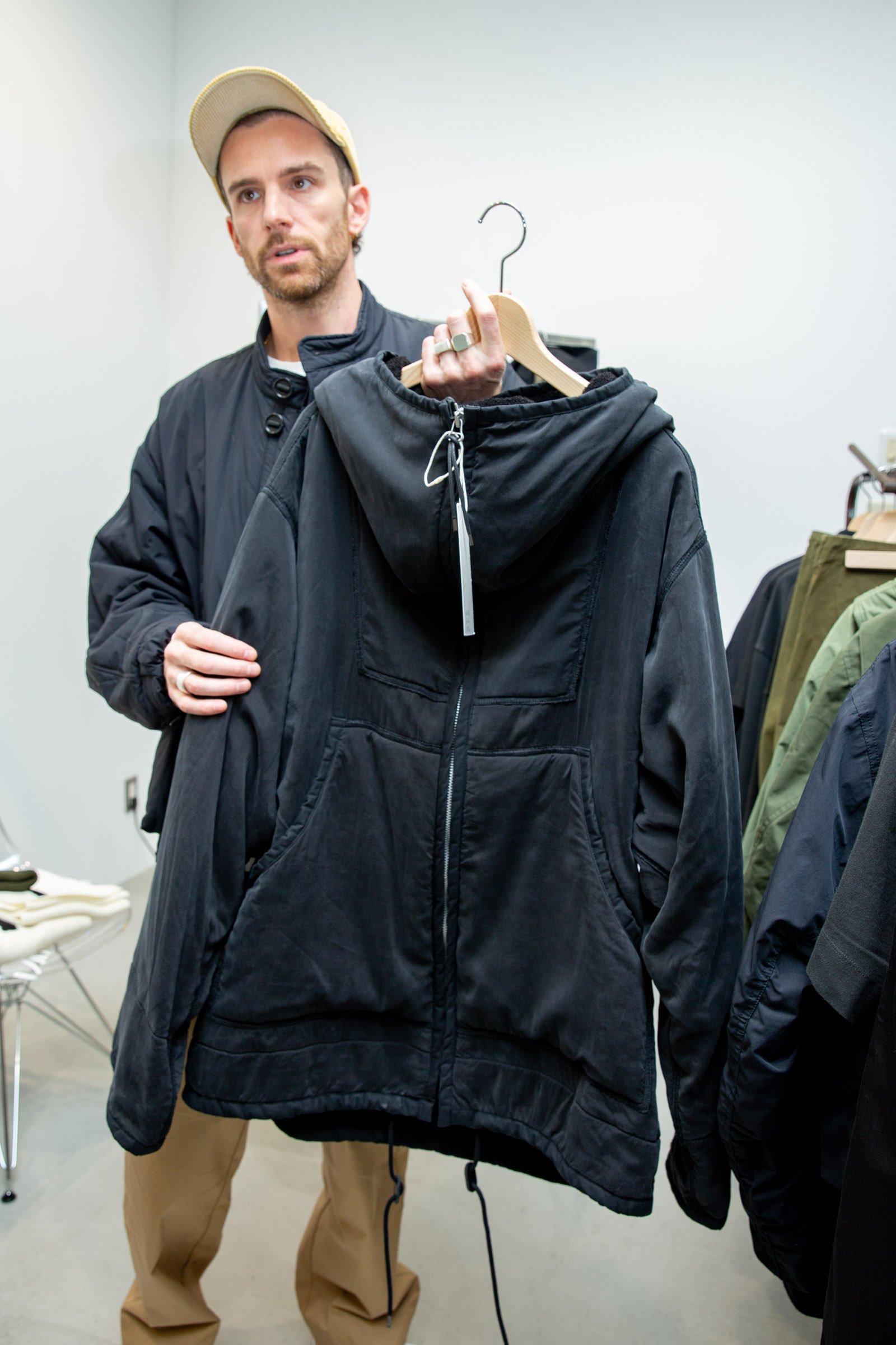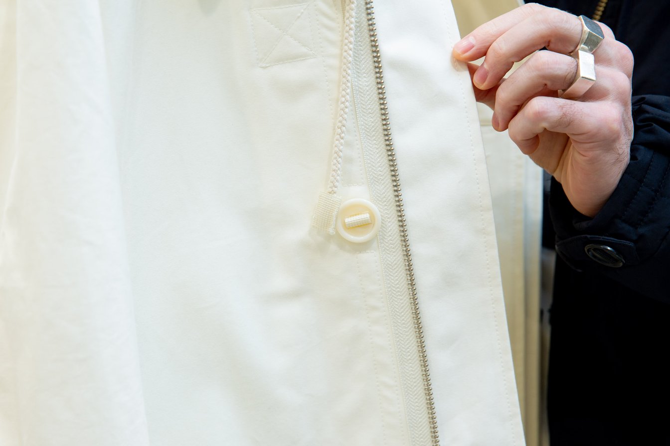 ボタンは全てパラシュートボタンで作りも頑丈に仕上げている。フードや襟を取り外しできたり、裾を折り返してボタンで留めることで丈を調整できたり、ストラップを肩にかけたり...計算したんだけど、ライナーやベストと合わせるとフルで50通りの着方ができるんだよ。色はエクリュとブラックの2色があるよ。