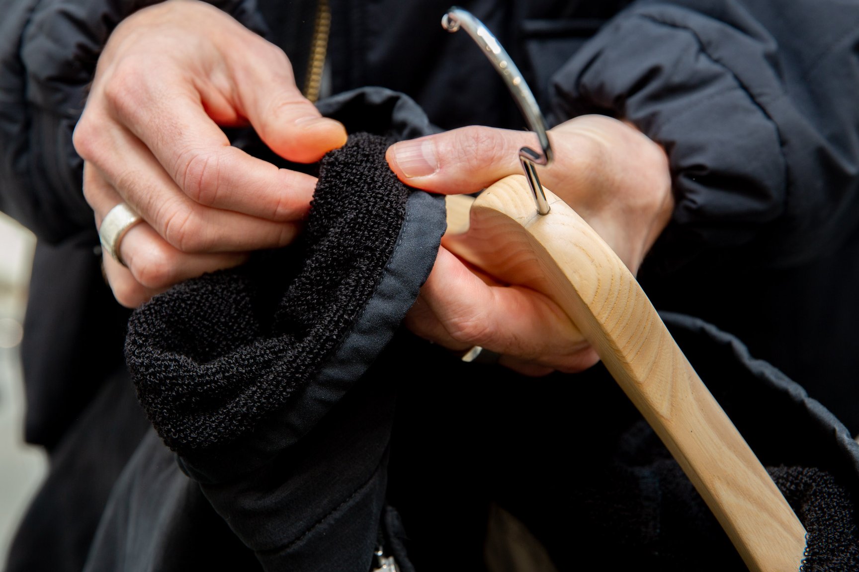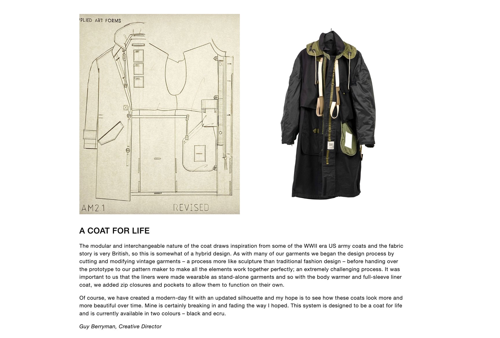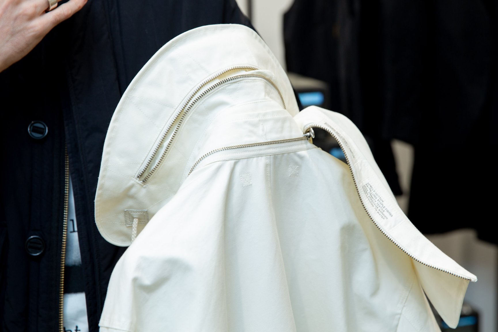 ボタンは全てパラシュートボタンで作りも頑丈に仕上げている。フードや襟を取り外しできたり、裾を折り返してボタンで留めることで丈を調整できたり、ストラップを肩にかけたり...計算したんだけど、ライナーやベストと合わせるとフルで50通りの着方ができるんだよ。色はエクリュとブラックの2色があるよ。