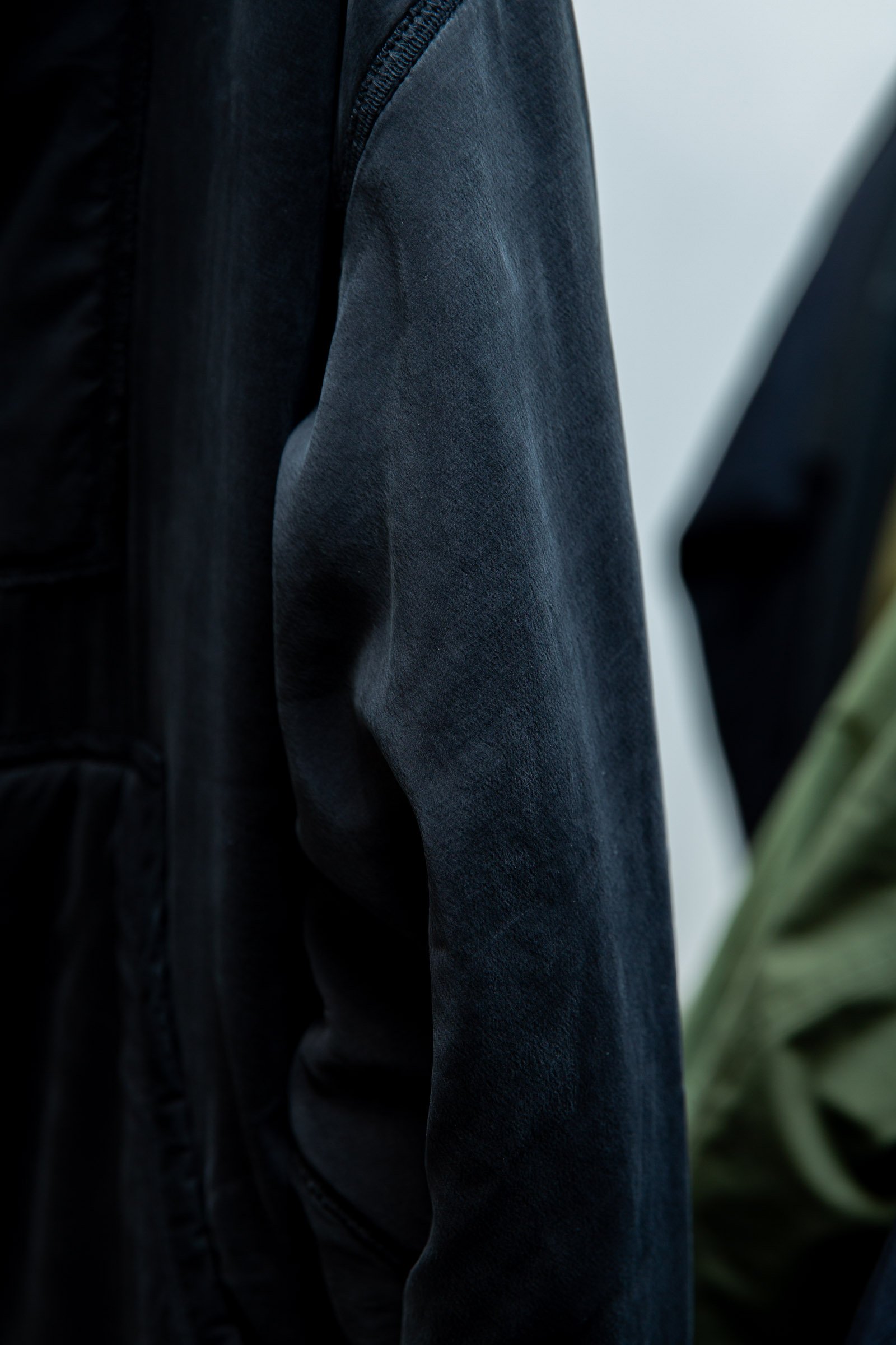 このフード付きジャケット「CM1-4」は、イングランド製の高級シルクにウォッシュをかけたジャケットで素材感が気に入ってる。シルクをウォッシュにかけると生地が縮むんだけど、それを計算してデザインしないといけないからすごく作るのが大変で。だけどウォッシュをかけると、鈍い光沢感が出て柔らかく絶妙な風合いに仕上がるんだ。
