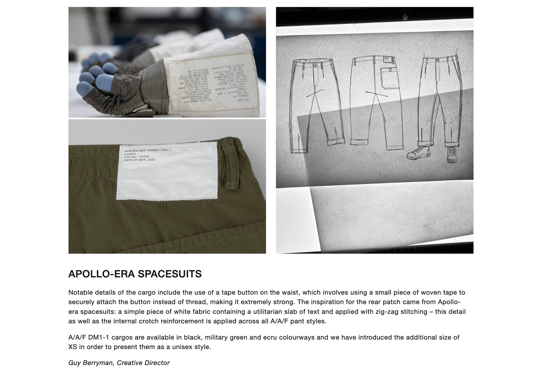 例えばこのパンツのバックタグのジグザグの縫い目は、ニール・アームストロングがアポロ11号で月面に立った時の宇宙服のスティッチから着想している。宇宙服って最も頑丈に作らないといけない特殊服の一つだけど、そういったディテールやストーリーが好きなんだ。飾り縫いではあるけど、隠れたディテールかな。作り手としてはアイテムの細かいところを伝えたいからテキストで説明するんだけど、すごく長くなっちゃって「誰が読むの?」って突っ込まれるんだよね。聞いてくれてありがとう(笑)。
