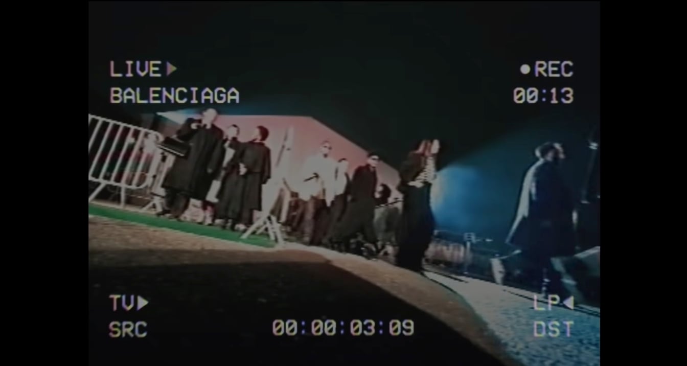 バレンシアガ2022年フォールコレクションの映像を手掛けたのは、「KIDS/キッズ」や「ガンモ」などで知られる映画監督のハーモニー・コリン(Harmony Korine)。ファッションショーの招待客が続々と入場するシーンから始まるが、低画質でノイズが走り、一昔前のVHSビデオを見ているように錯覚する。
