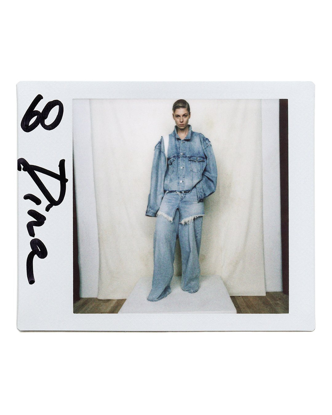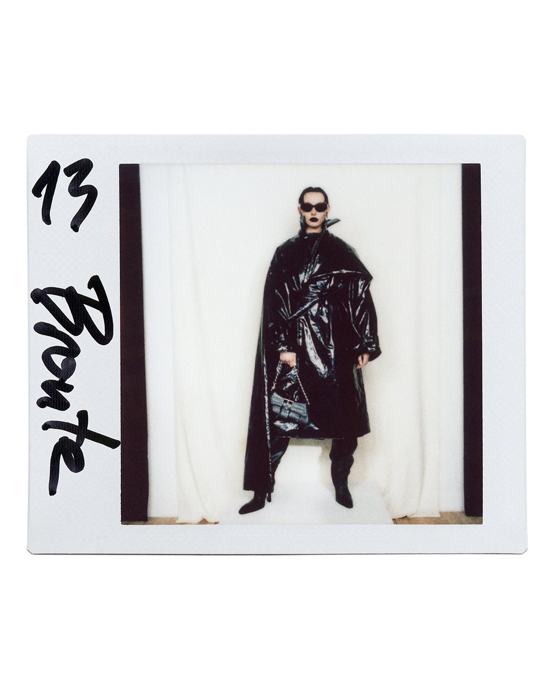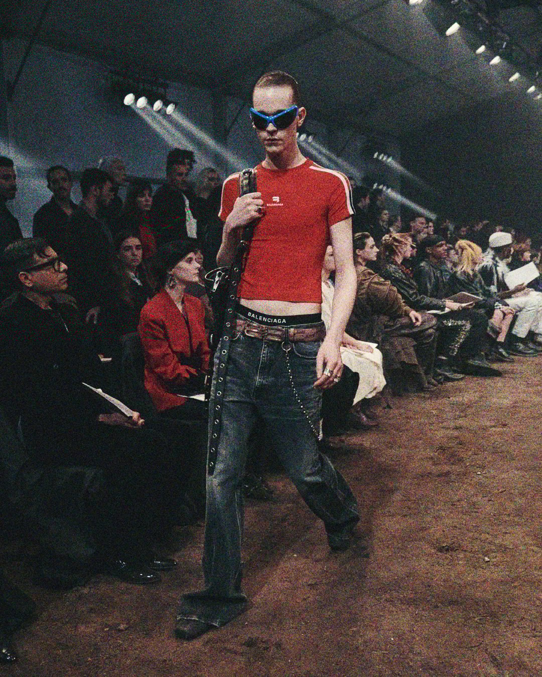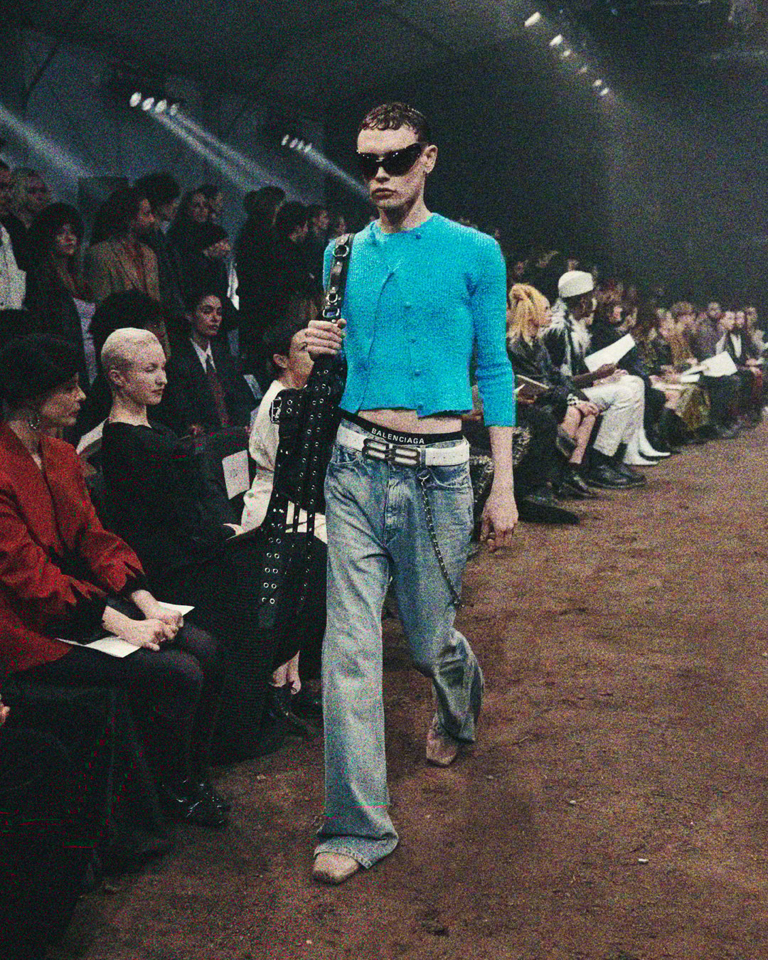 バスクジャケットやトラックスーツといったバレンシアガのシグネチャーを進化させ、アイコンアイテムはモダンで着心地を重視した服へと再考。パファージャケットの首元にはトラベルピローが取り付けられ、色落ちしたジーンズはミニスカートとサイハイブーツとしても着用できるようにリメイク。前後逆のジャケットやツイードドレスがユニークだ。DIY感覚の安全ピン、分解してつなぎ合わせる手法、チビTにアンダーウェアのウエストを覗かせたローライズパンツといった、90年代を連想させるディテールやスタイルも登場した。