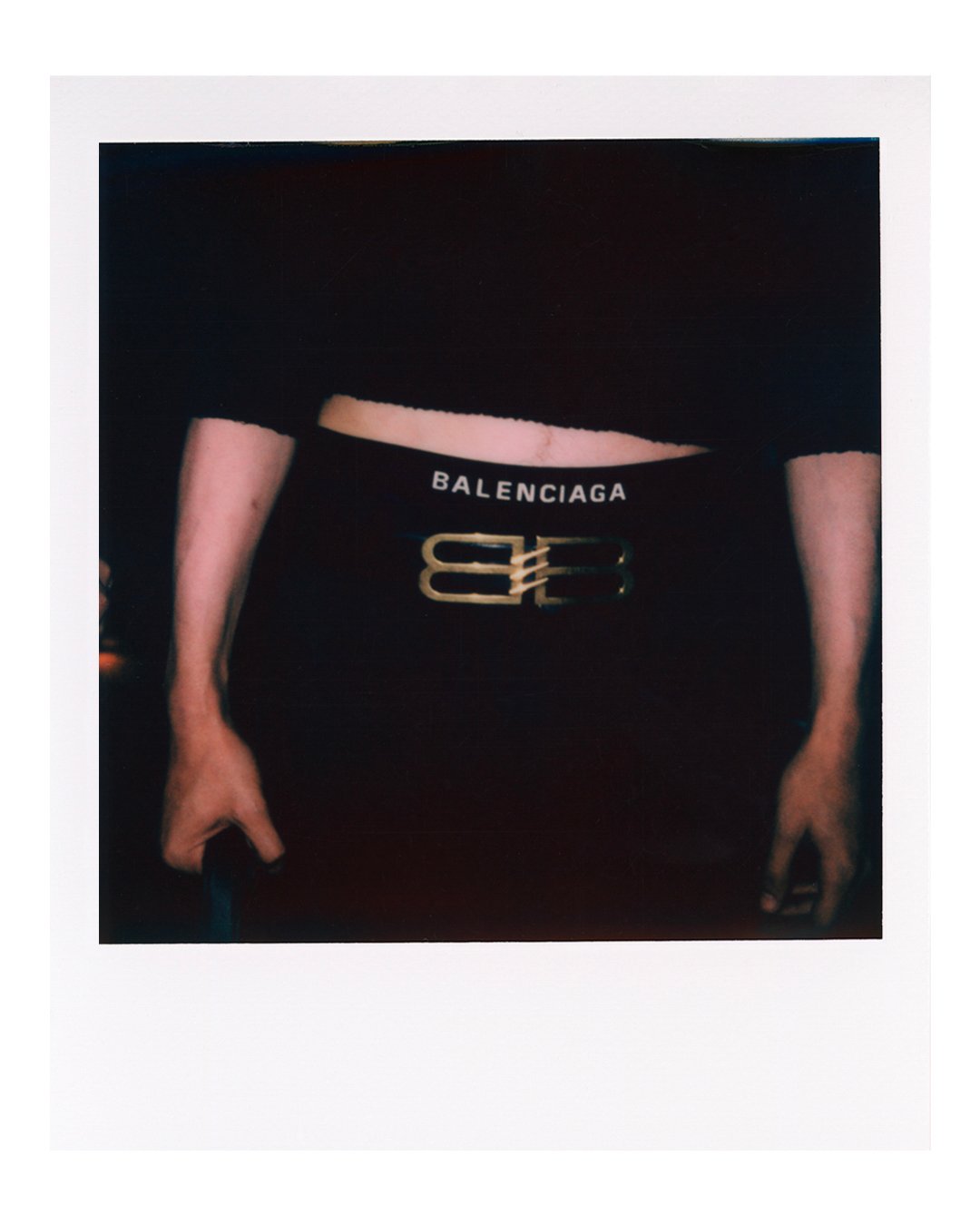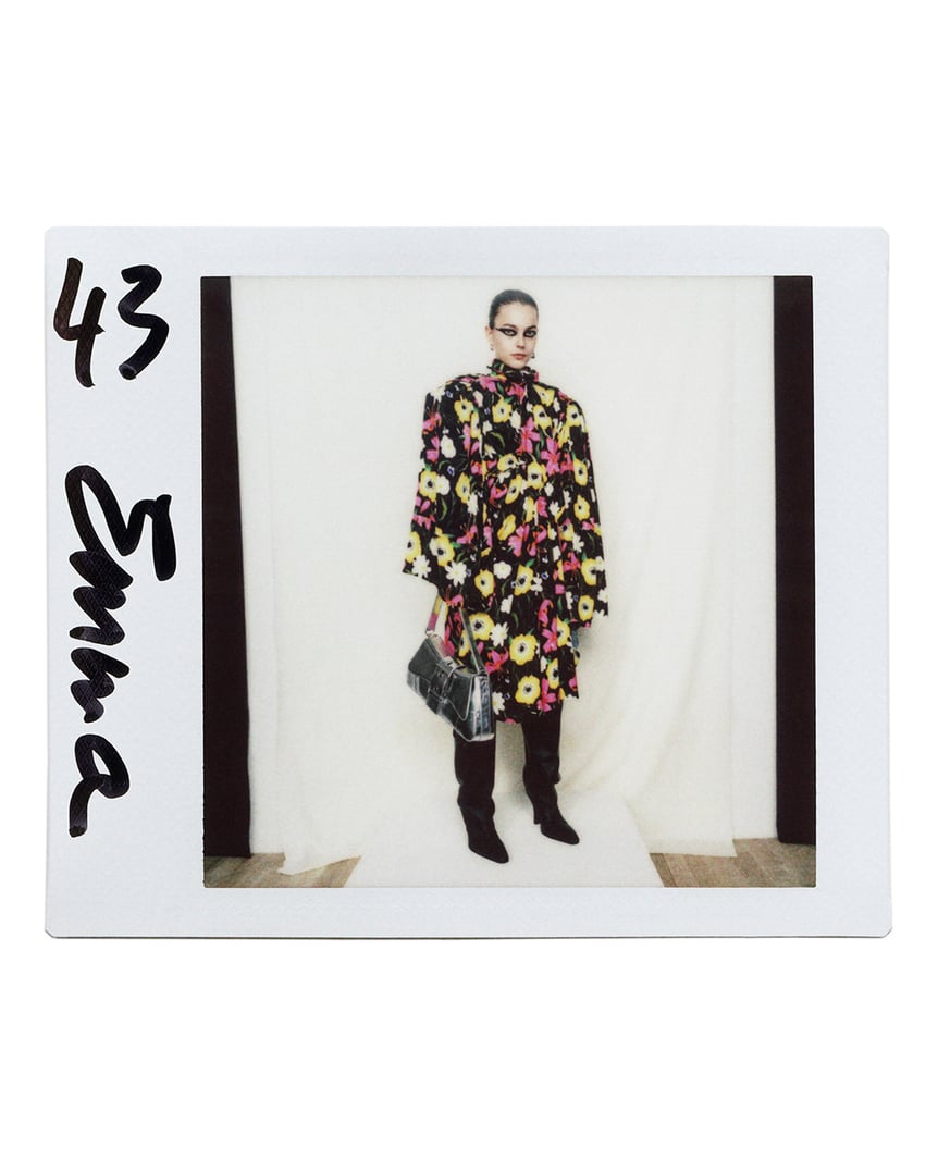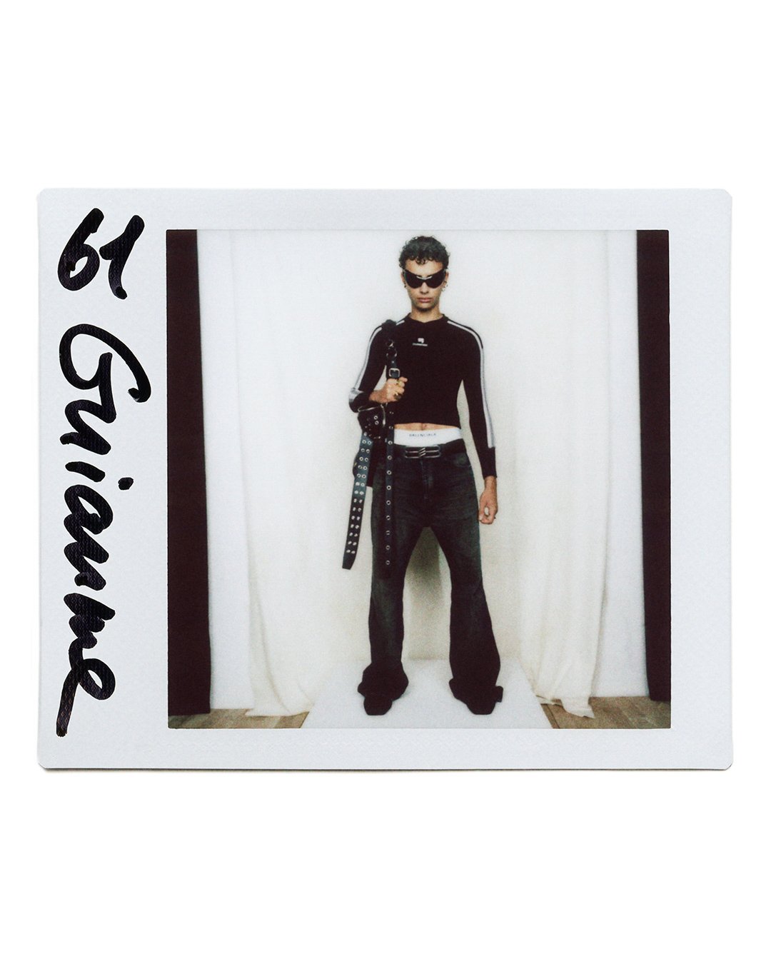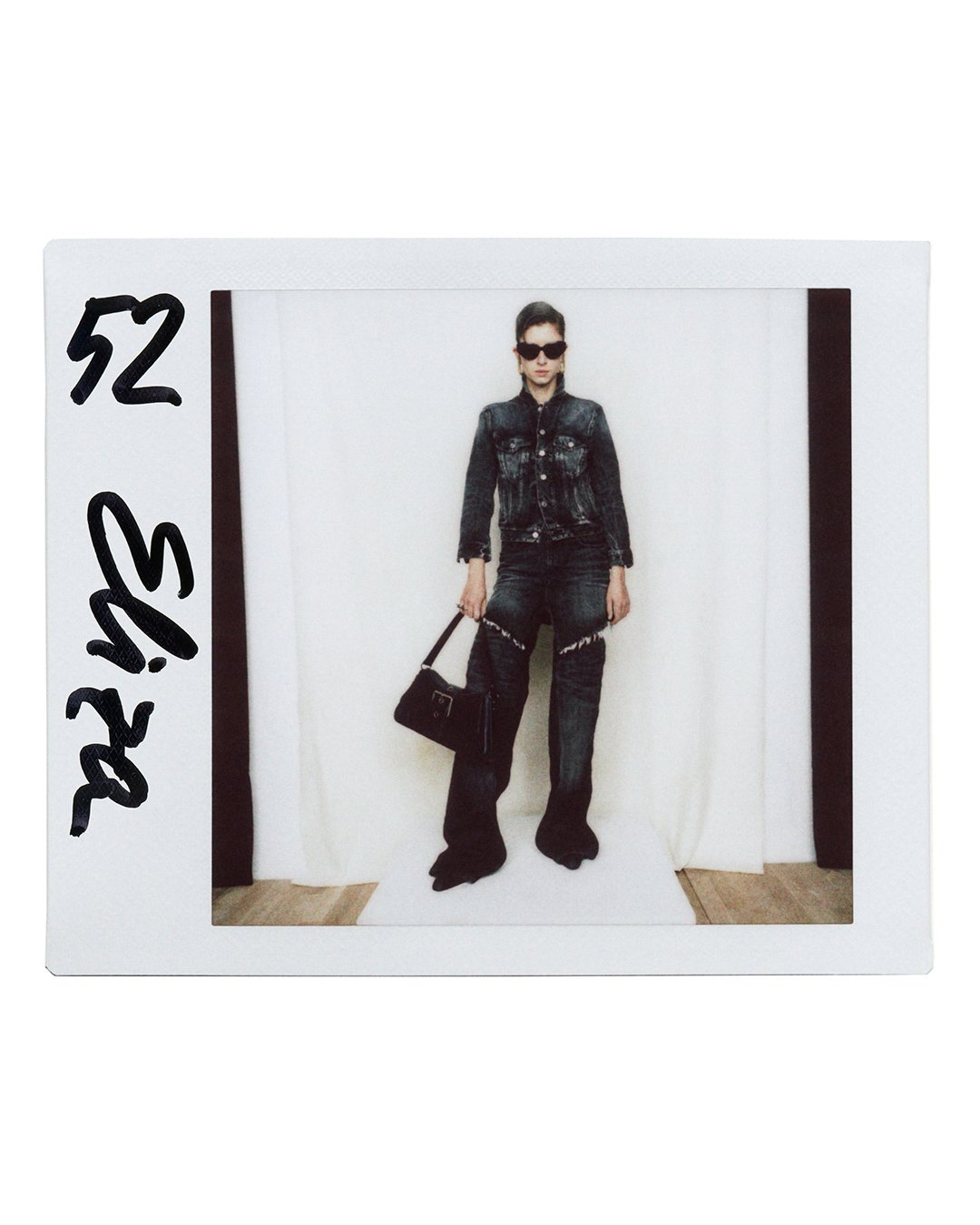 バスクジャケットやトラックスーツといったバレンシアガのシグネチャーを進化させ、アイコンアイテムはモダンで着心地を重視した服へと再考。パファージャケットの首元にはトラベルピローが取り付けられ、色落ちしたジーンズはミニスカートとサイハイブーツとしても着用できるようにリメイク。前後逆のジャケットやツイードドレスがユニークだ。DIY感覚の安全ピン、分解してつなぎ合わせる手法、チビTにアンダーウェアのウエストを覗かせたローライズパンツといった、90年代を連想させるディテールやスタイルも登場した。