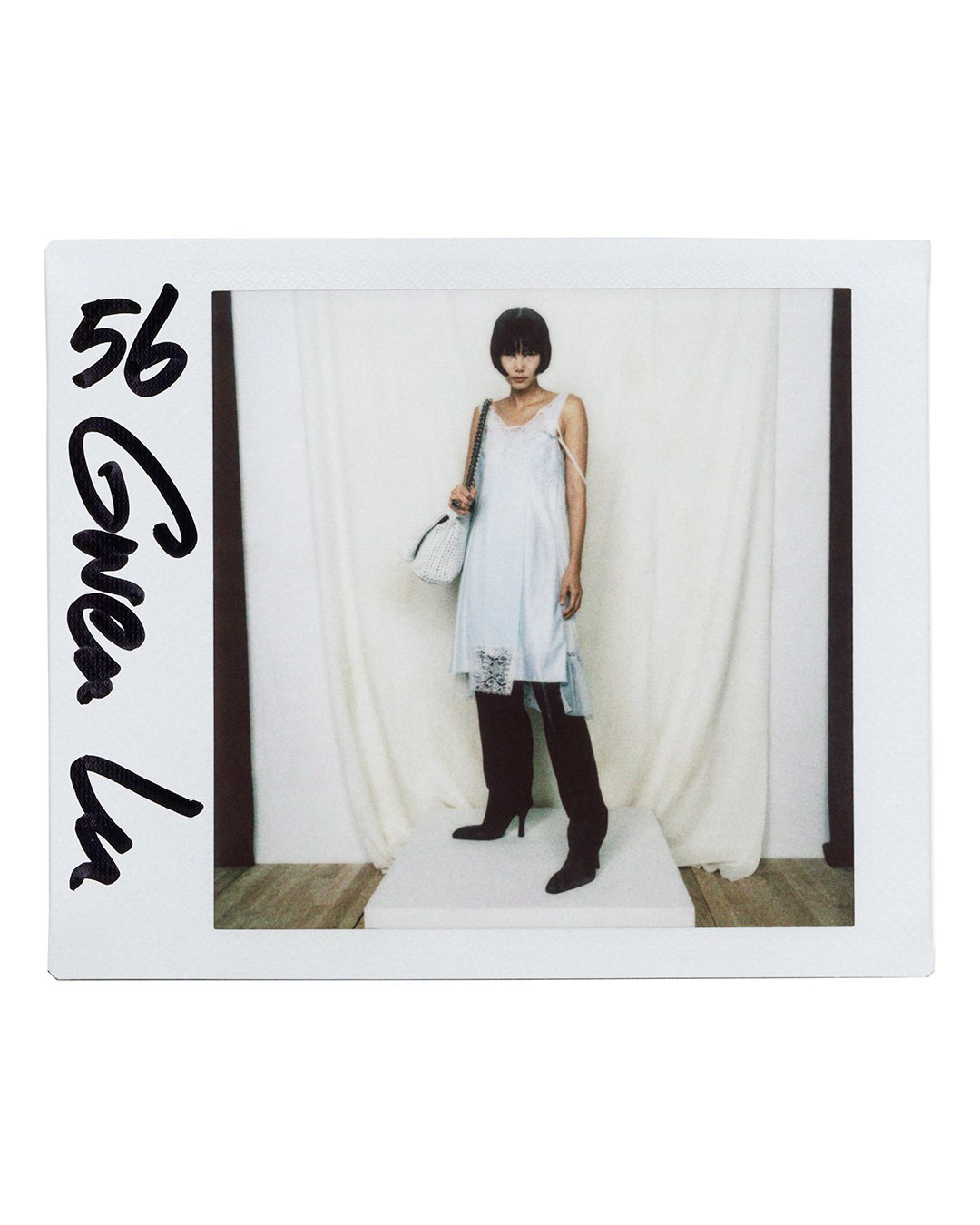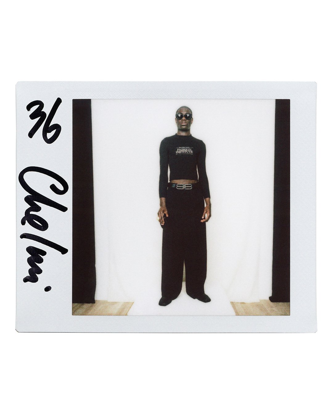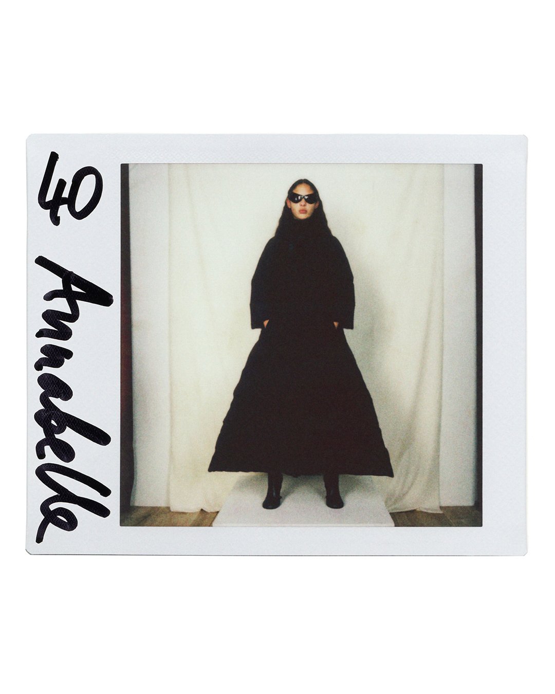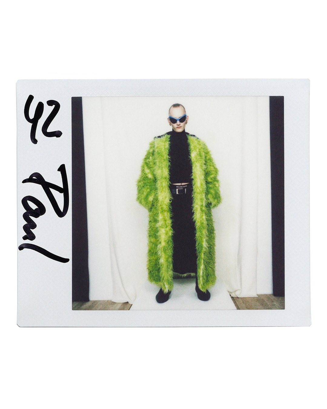 バスクジャケットやトラックスーツといったバレンシアガのシグネチャーを進化させ、アイコンアイテムはモダンで着心地を重視した服へと再考。パファージャケットの首元にはトラベルピローが取り付けられ、色落ちしたジーンズはミニスカートとサイハイブーツとしても着用できるようにリメイク。前後逆のジャケットやツイードドレスがユニークだ。DIY感覚の安全ピン、分解してつなぎ合わせる手法、チビTにアンダーウェアのウエストを覗かせたローライズパンツといった、90年代を連想させるディテールやスタイルも登場した。