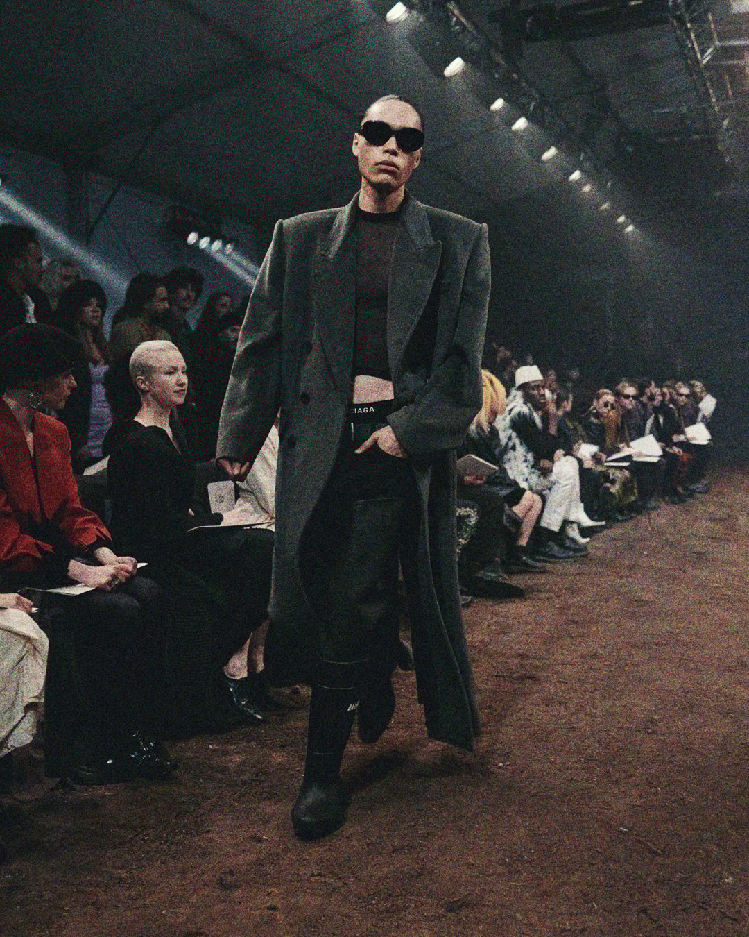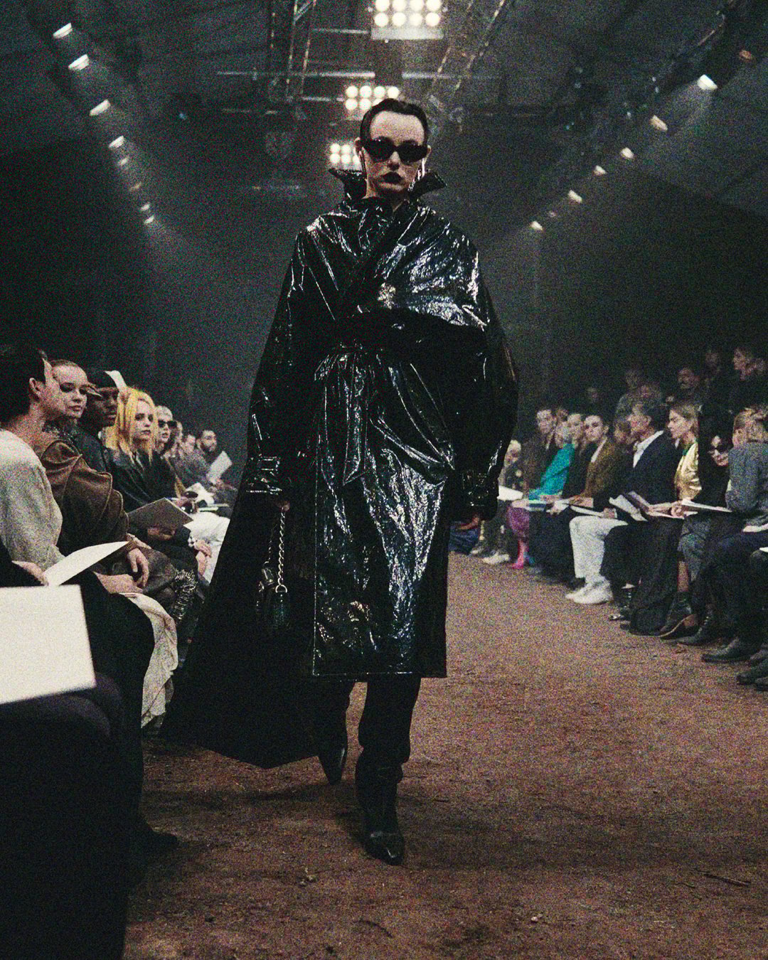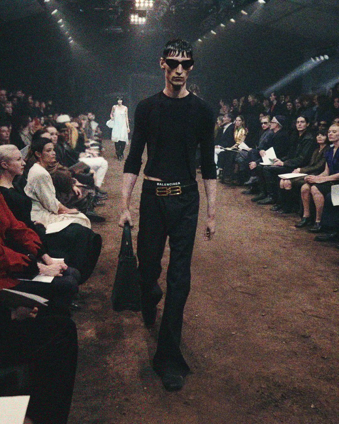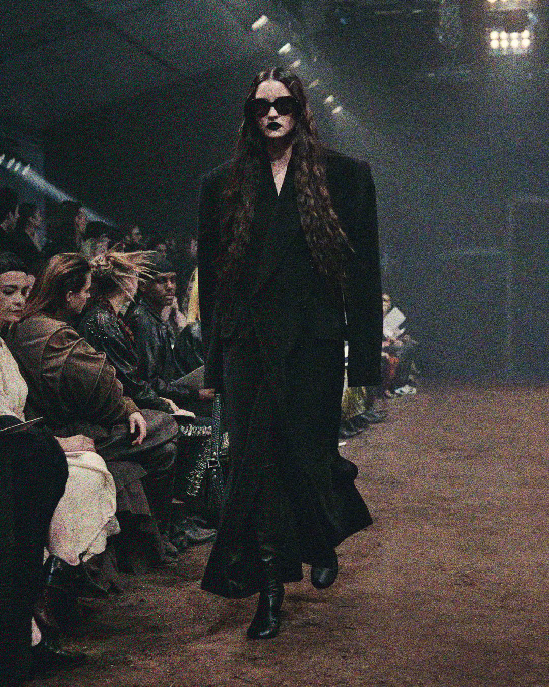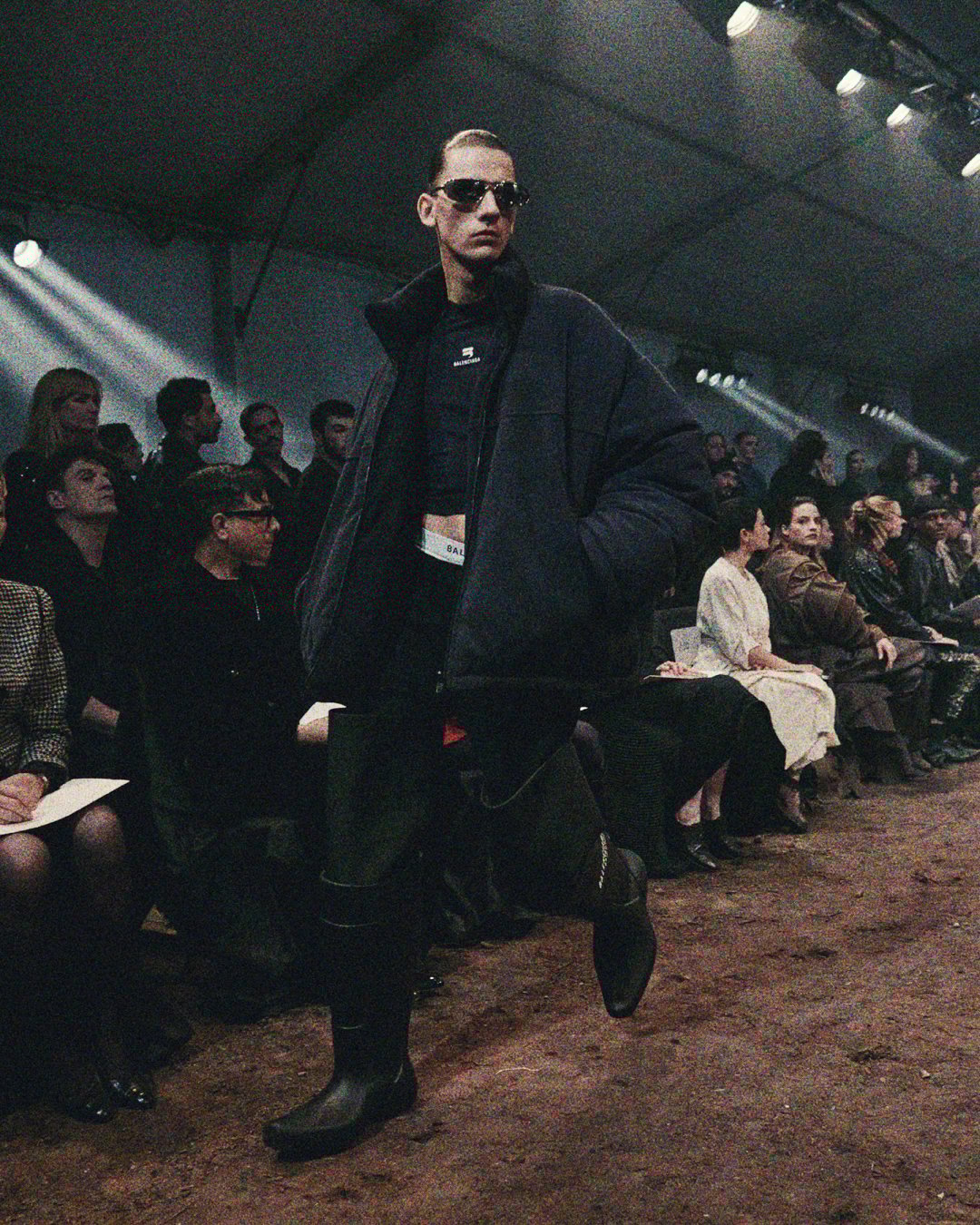 バレンシアガのショーの常連モデル、エリザ・ダグラス(Eliza Douglas)によるブラック一色のファーストルックで特徴的なのは、パンツとブーツが合体したパンタブーツ。トップスはグローブ付きで、首から下の肌を全て覆うような仕立てとなっている。その後に続くルックもブラックがベースで、肩幅が目立つビッグサイズもあれば極端にタイトなフォルムも。過剰なシルエットは、レイバーとポストグランジを解釈したという。