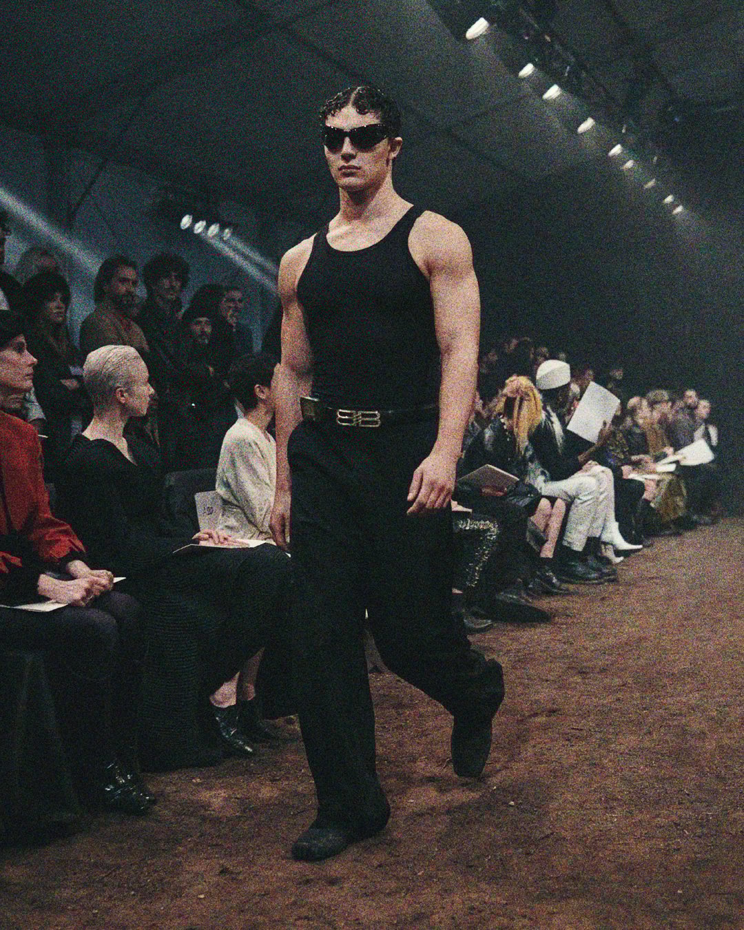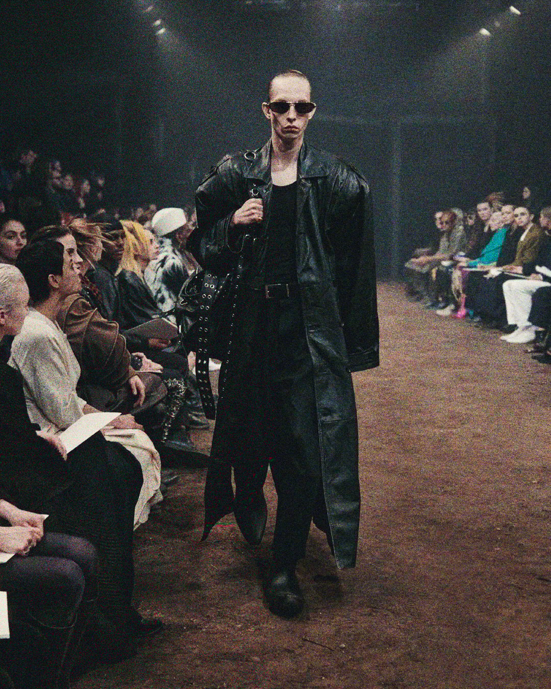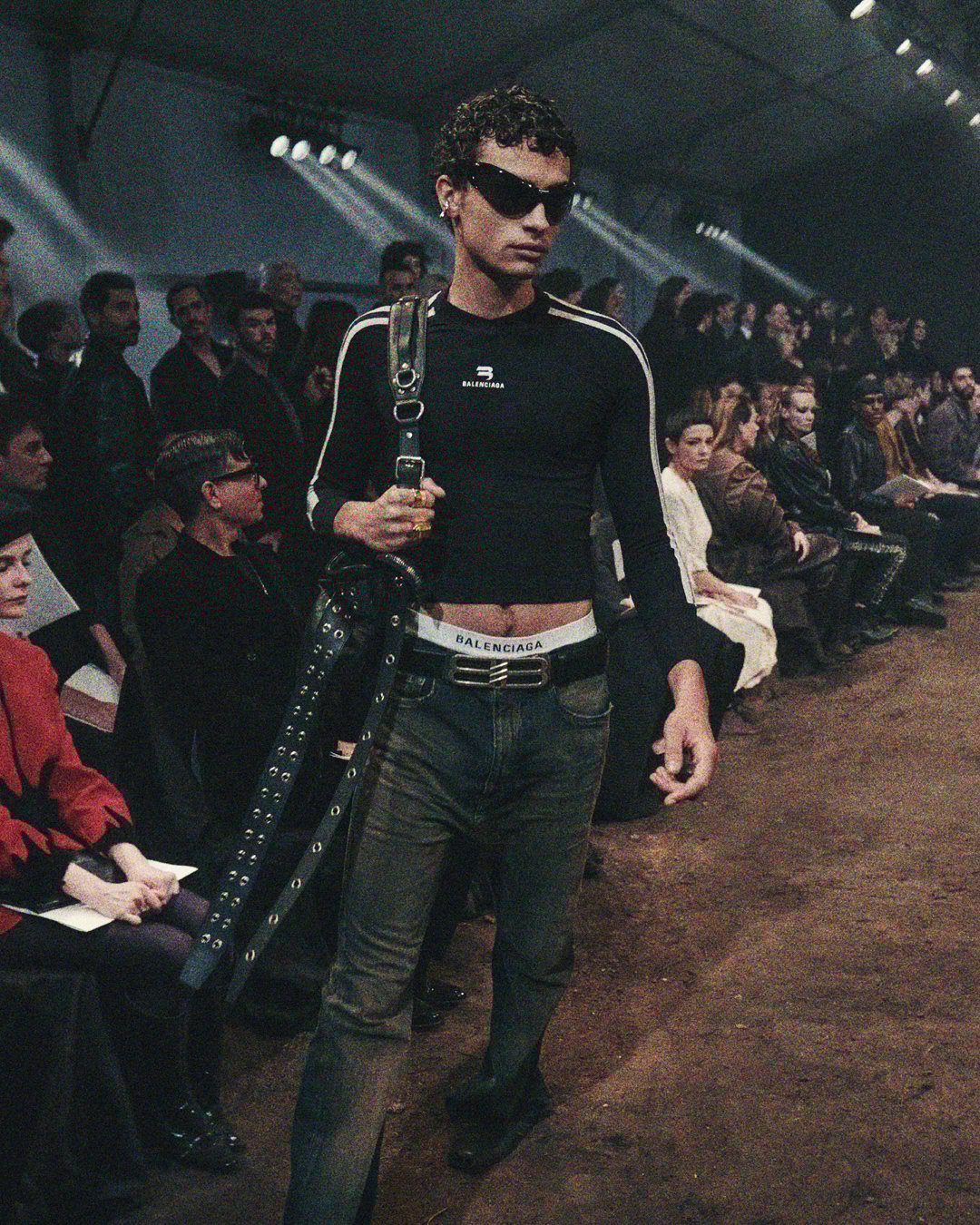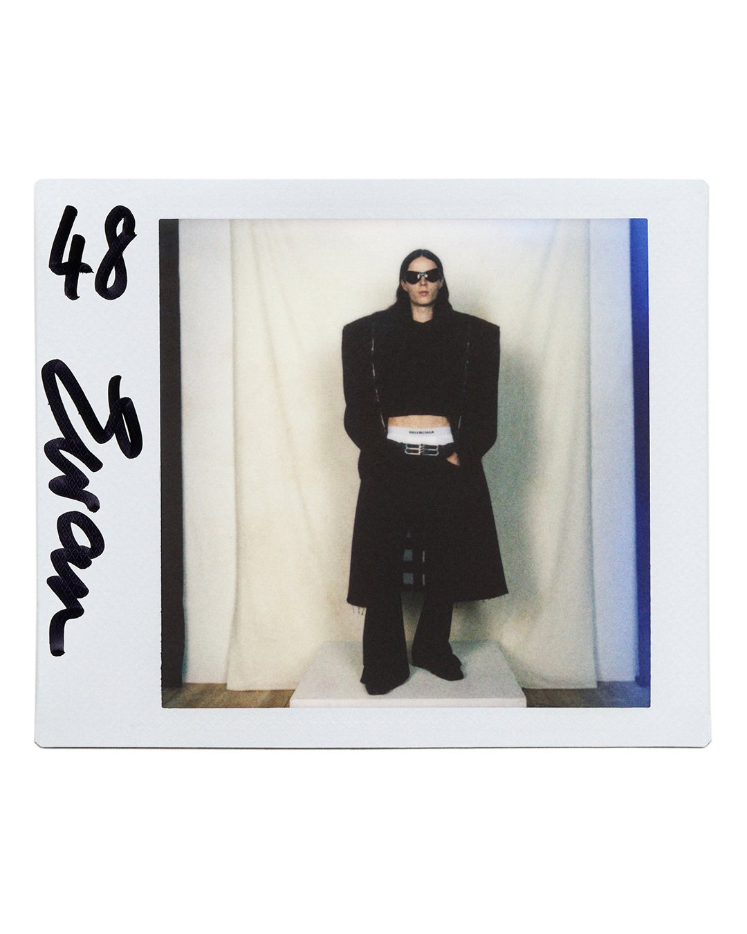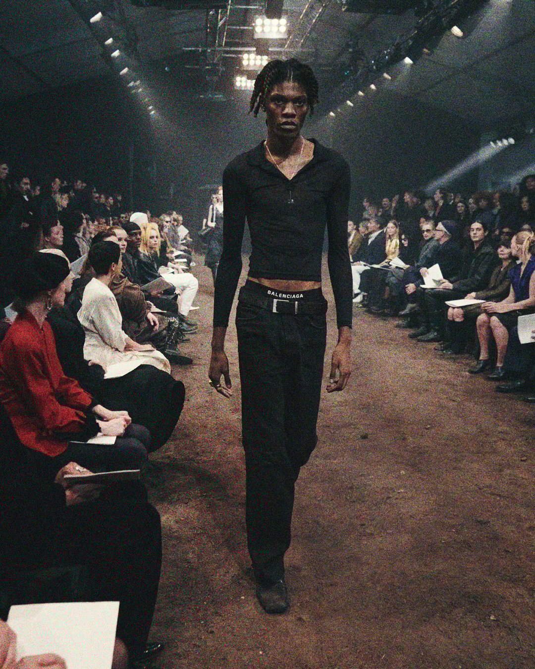 バレンシアガのショーの常連モデル、エリザ・ダグラス(Eliza Douglas)によるブラック一色のファーストルックで特徴的なのは、パンツとブーツが合体したパンタブーツ。トップスはグローブ付きで、首から下の肌を全て覆うような仕立てとなっている。その後に続くルックもブラックがベースで、肩幅が目立つビッグサイズもあれば極端にタイトなフォルムも。過剰なシルエットは、レイバーとポストグランジを解釈したという。