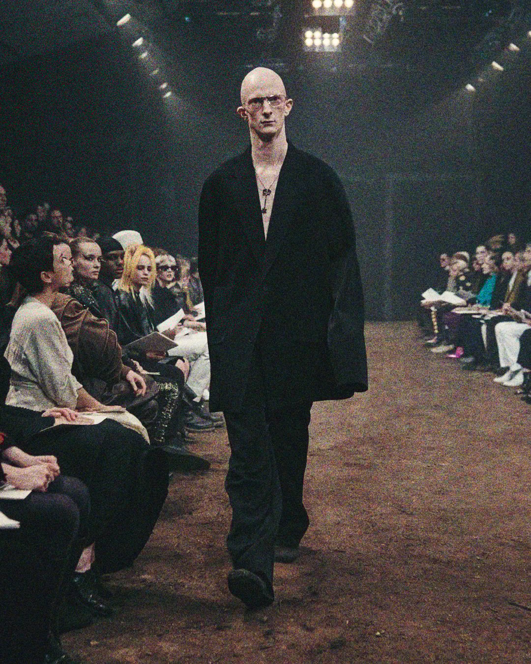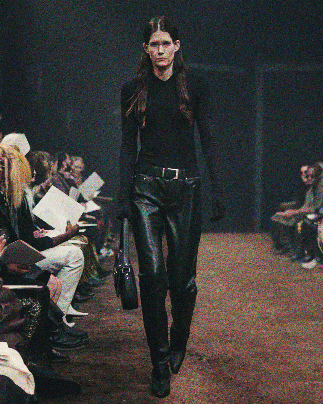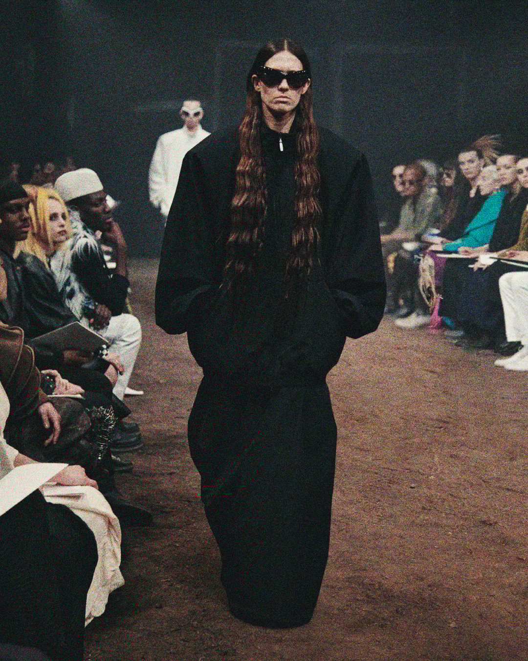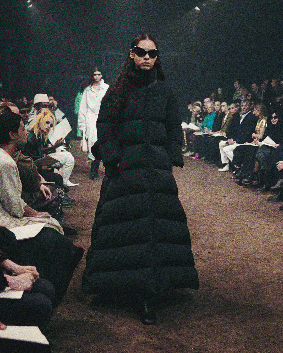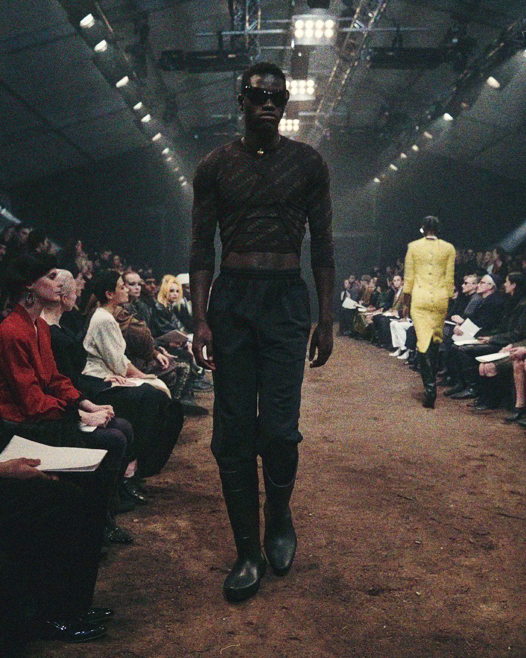 バレンシアガのショーの常連モデル、エリザ・ダグラス(Eliza Douglas)によるブラック一色のファーストルックで特徴的なのは、パンツとブーツが合体したパンタブーツ。トップスはグローブ付きで、首から下の肌を全て覆うような仕立てとなっている。その後に続くルックもブラックがベースで、肩幅が目立つビッグサイズもあれば極端にタイトなフォルムも。過剰なシルエットは、レイバーとポストグランジを解釈したという。
