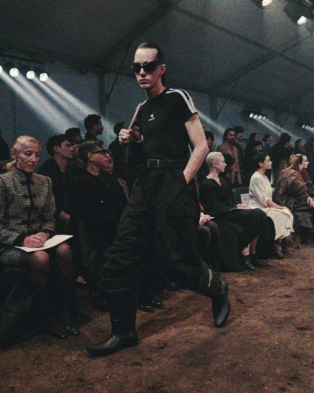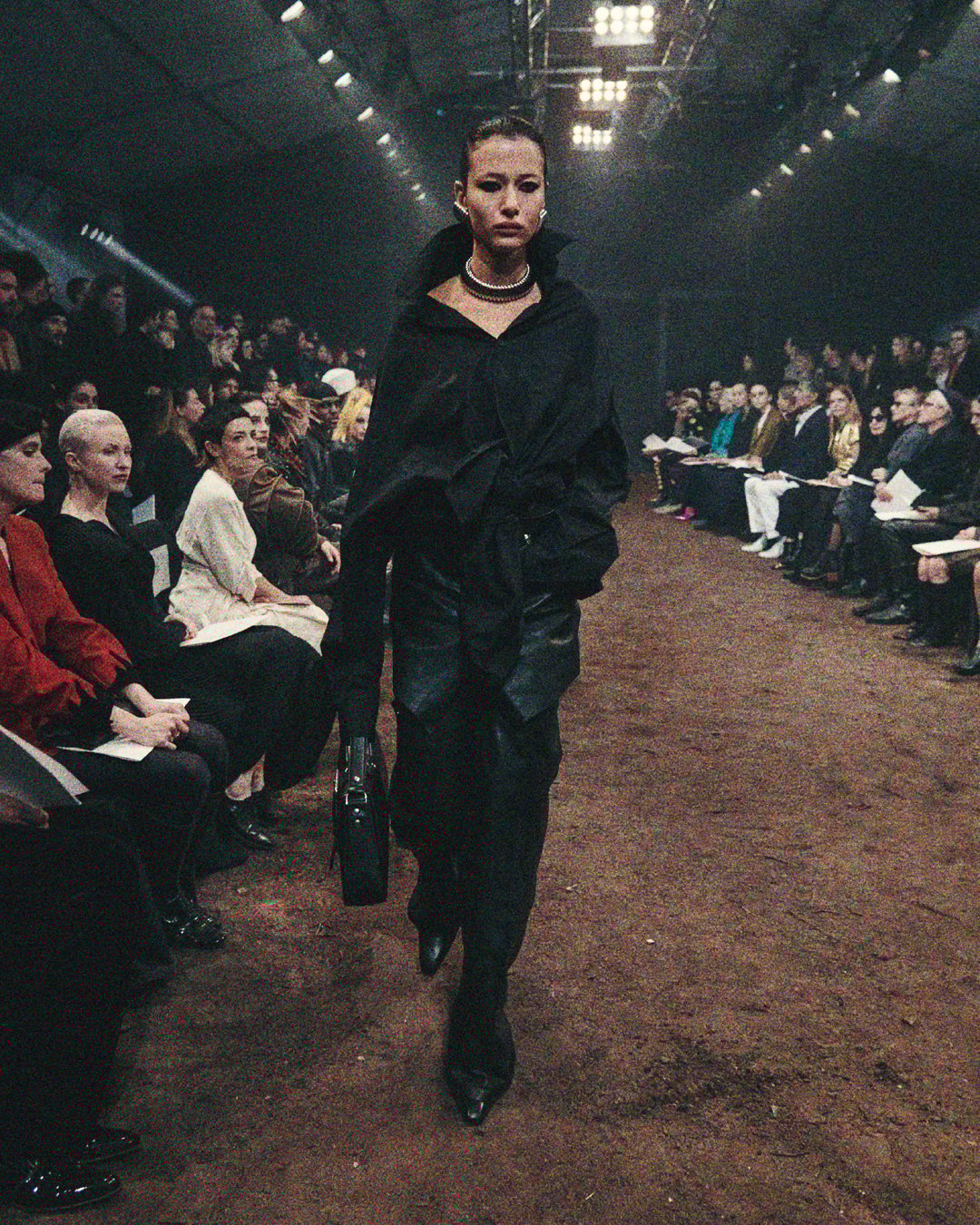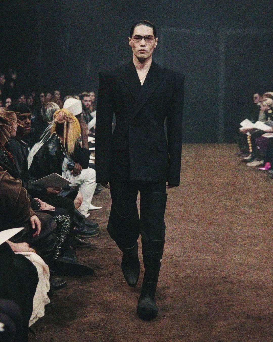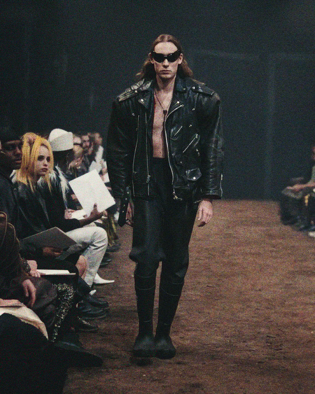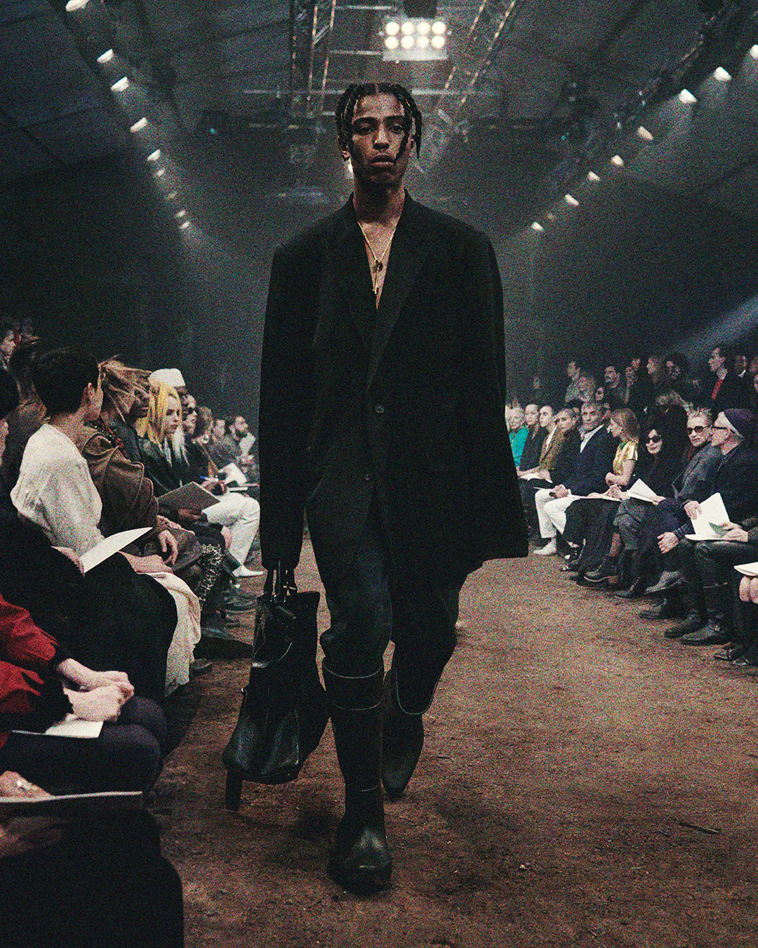 バレンシアガのショーの常連モデル、エリザ・ダグラス(Eliza Douglas)によるブラック一色のファーストルックで特徴的なのは、パンツとブーツが合体したパンタブーツ。トップスはグローブ付きで、首から下の肌を全て覆うような仕立てとなっている。その後に続くルックもブラックがベースで、肩幅が目立つビッグサイズもあれば極端にタイトなフォルムも。過剰なシルエットは、レイバーとポストグランジを解釈したという。