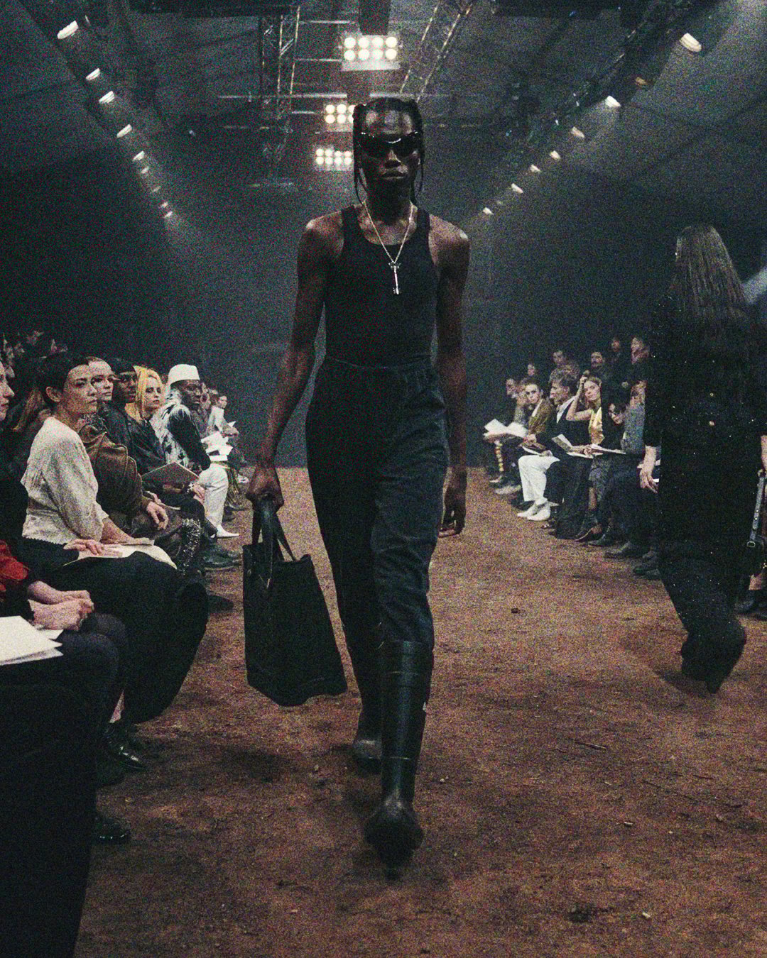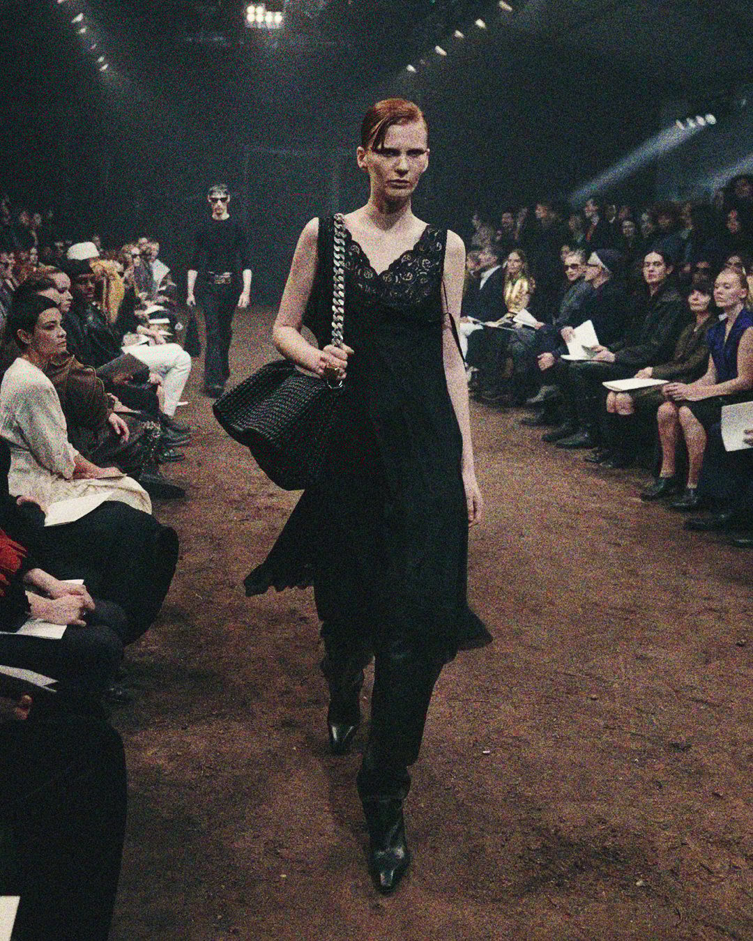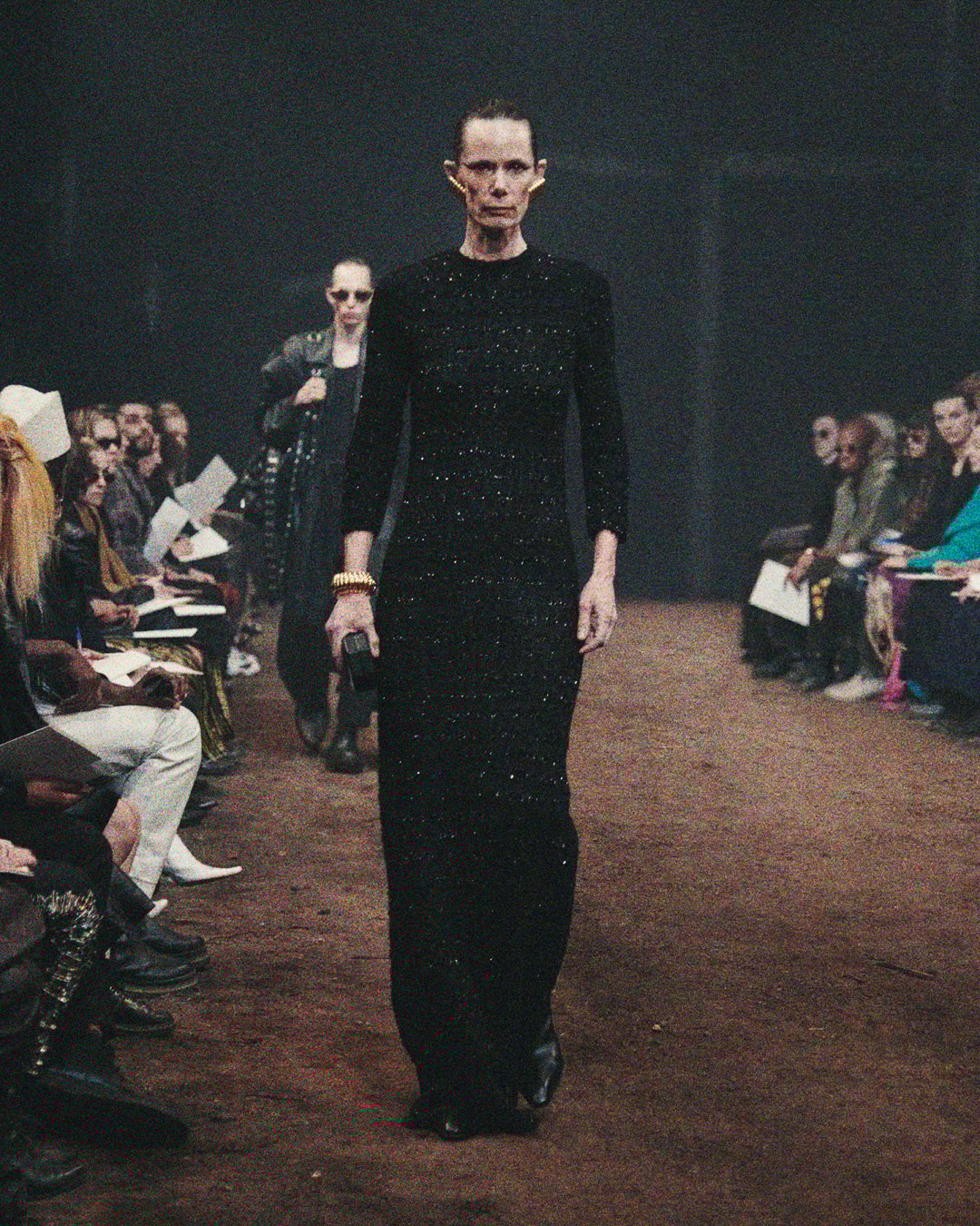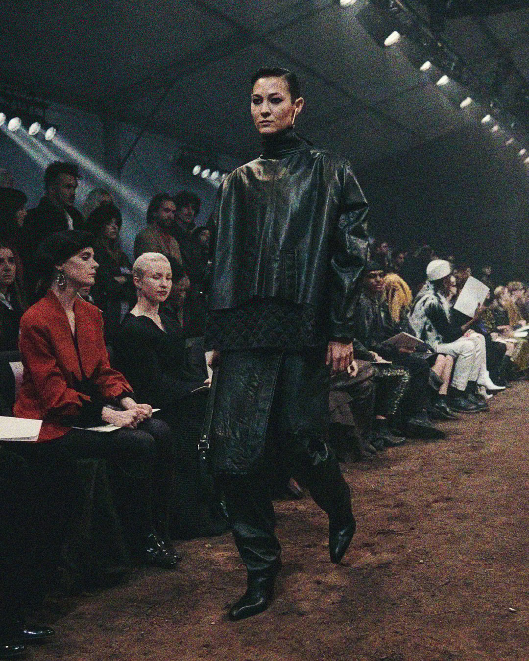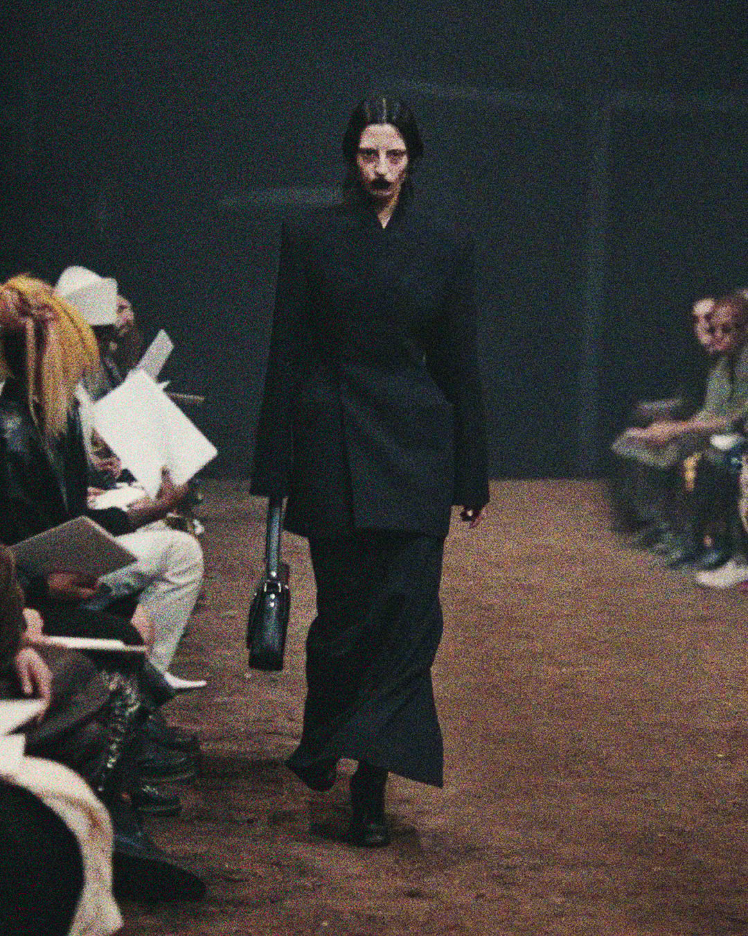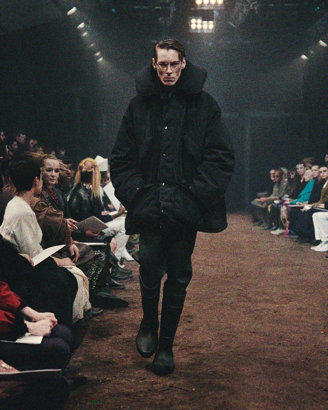 バレンシアガのショーの常連モデル、エリザ・ダグラス(Eliza Douglas)によるブラック一色のファーストルックで特徴的なのは、パンツとブーツが合体したパンタブーツ。トップスはグローブ付きで、首から下の肌を全て覆うような仕立てとなっている。その後に続くルックもブラックがベースで、肩幅が目立つビッグサイズもあれば極端にタイトなフォルムも。過剰なシルエットは、レイバーとポストグランジを解釈したという。