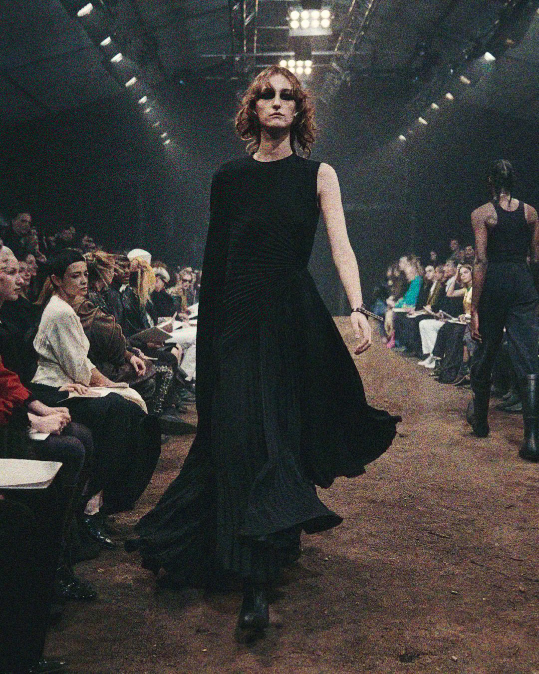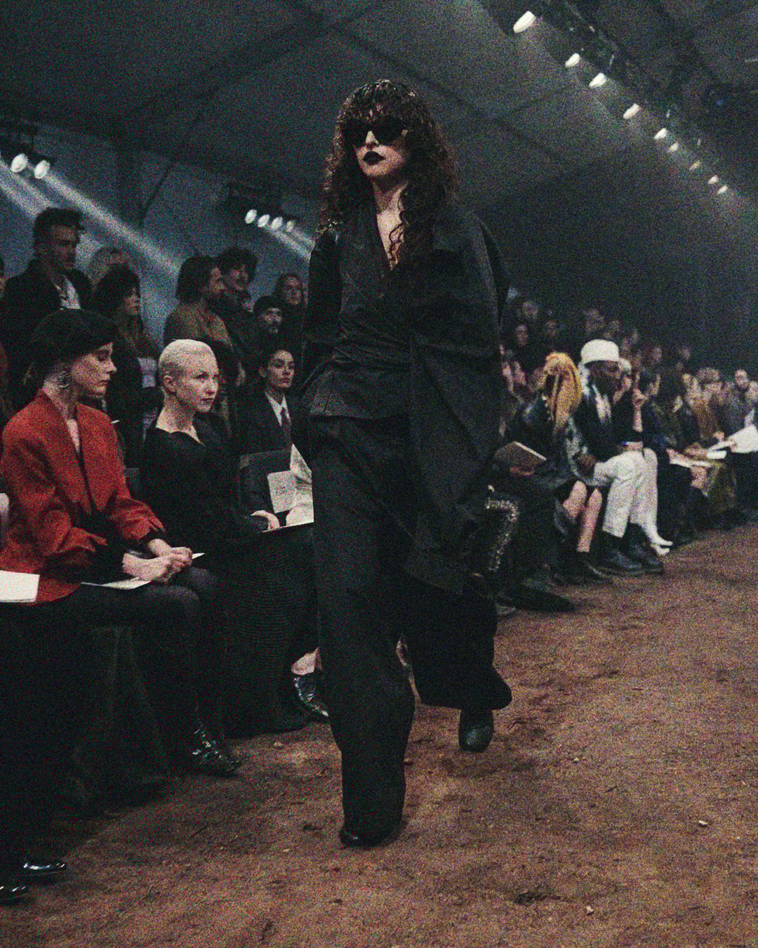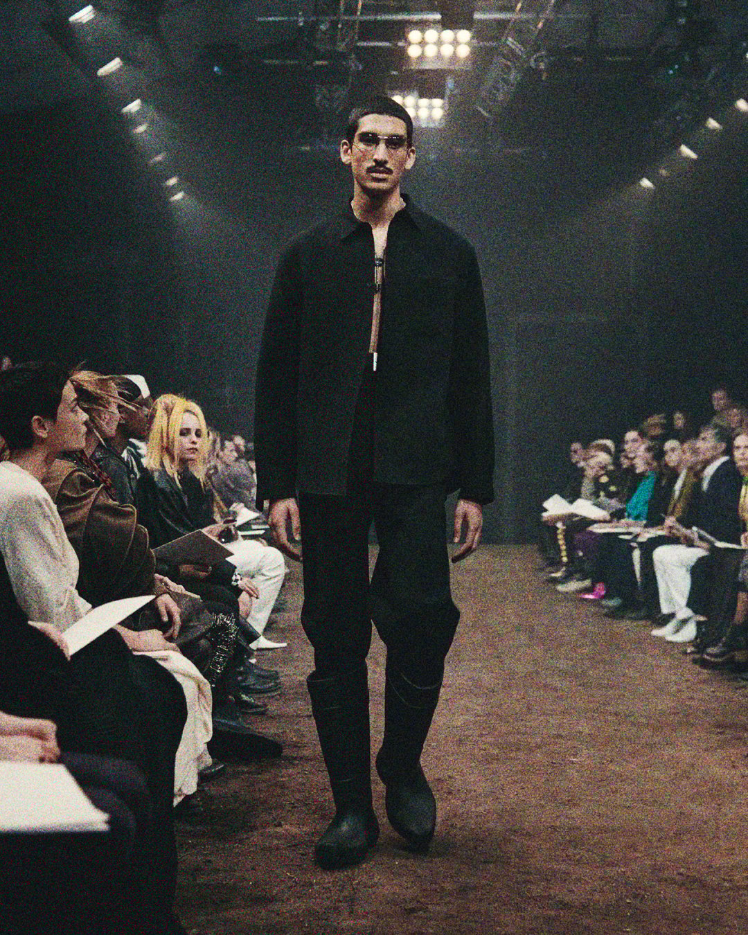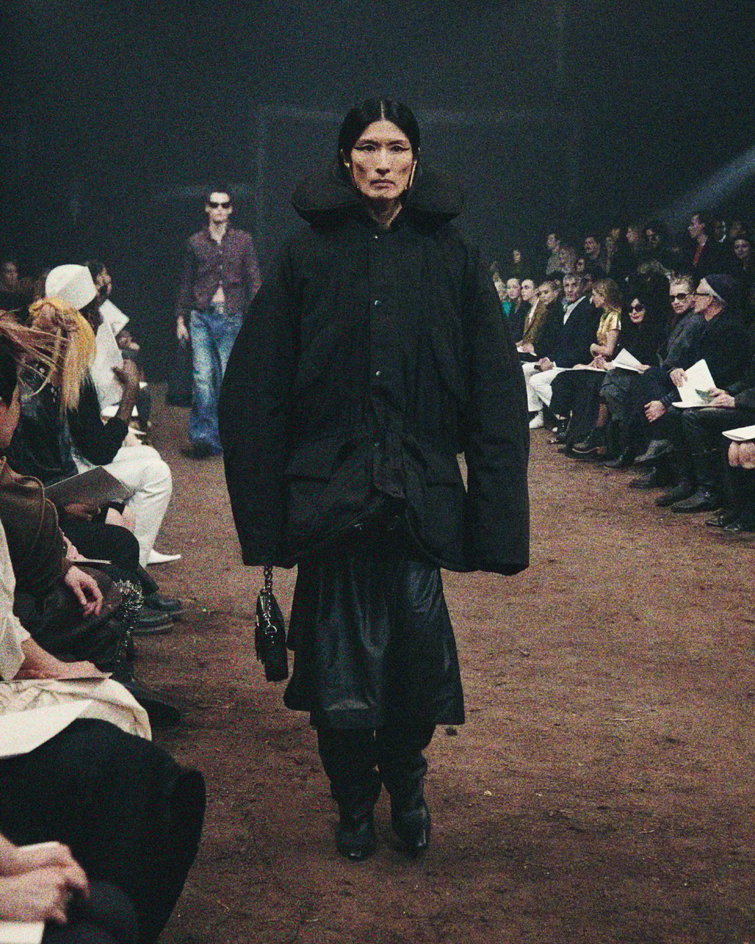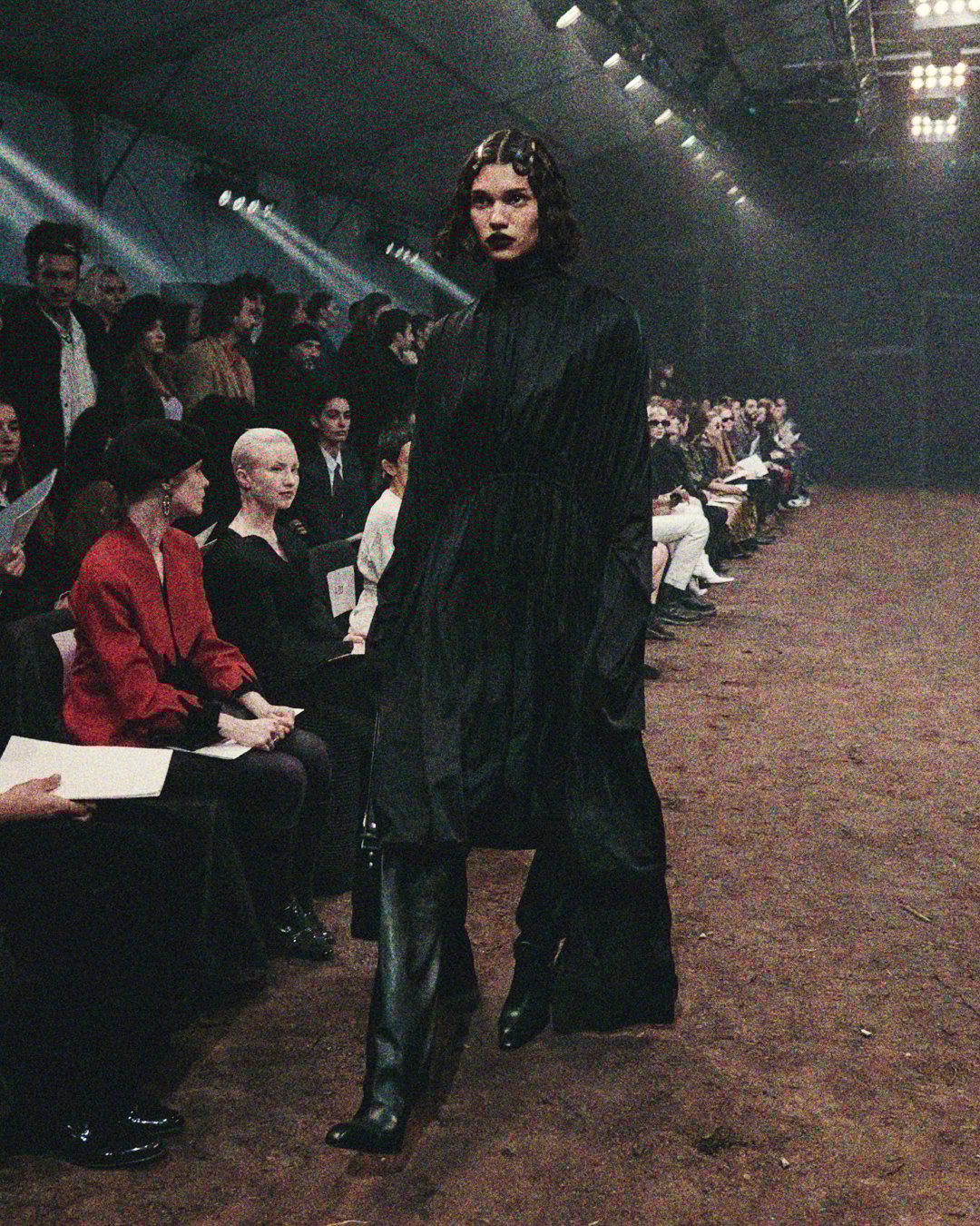 バレンシアガのショーの常連モデル、エリザ・ダグラス(Eliza Douglas)によるブラック一色のファーストルックで特徴的なのは、パンツとブーツが合体したパンタブーツ。トップスはグローブ付きで、首から下の肌を全て覆うような仕立てとなっている。その後に続くルックもブラックがベースで、肩幅が目立つビッグサイズもあれば極端にタイトなフォルムも。過剰なシルエットは、レイバーとポストグランジを解釈したという。