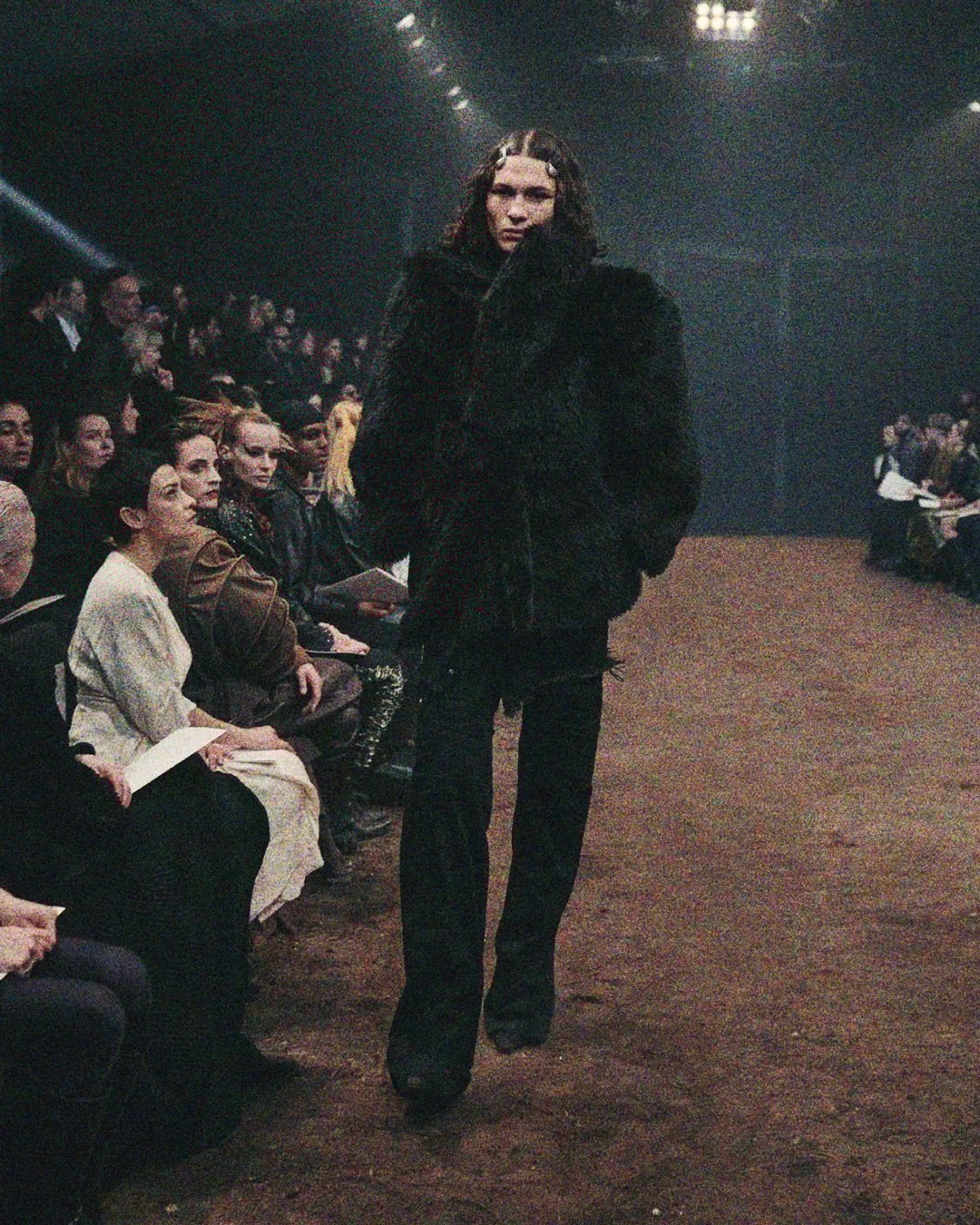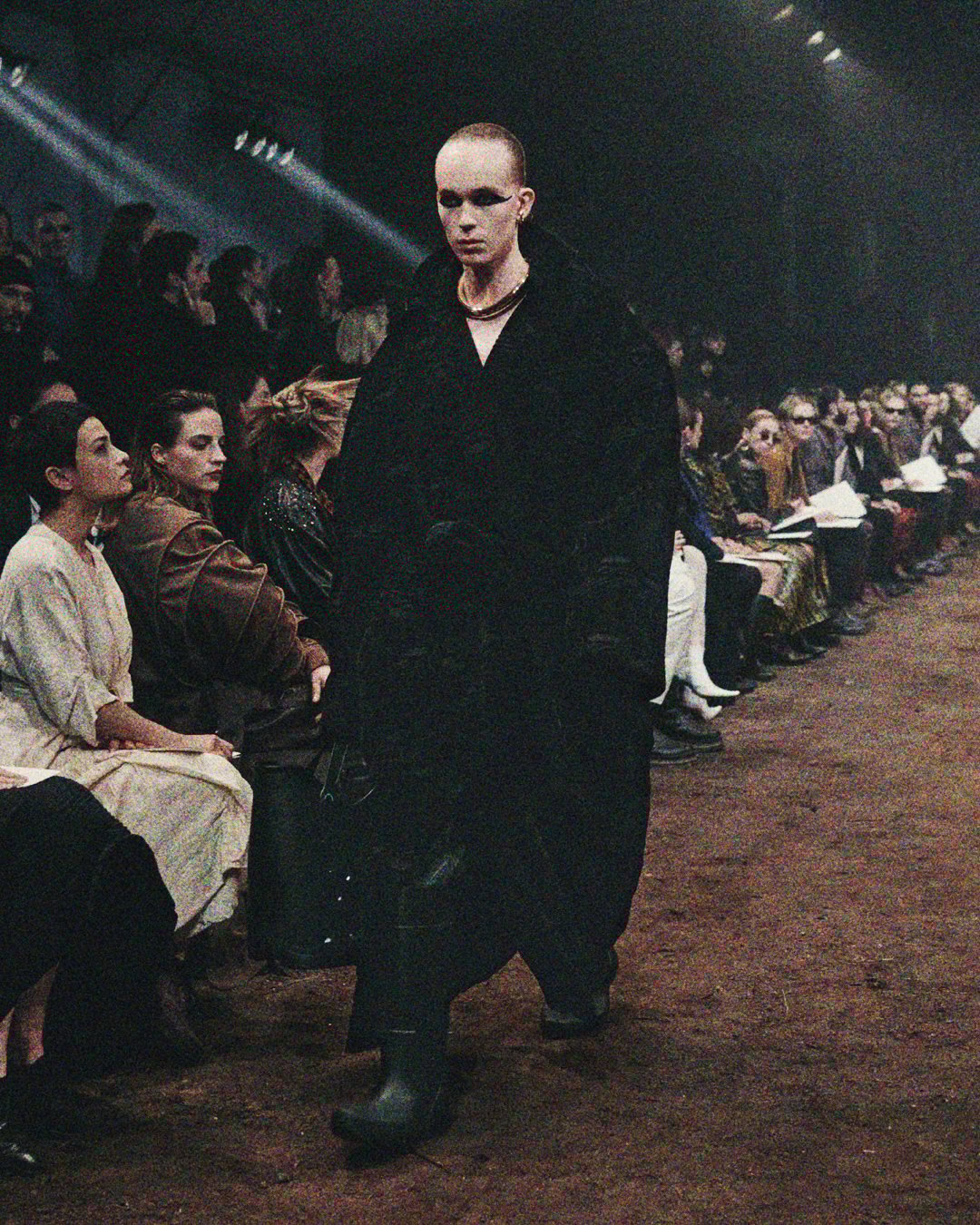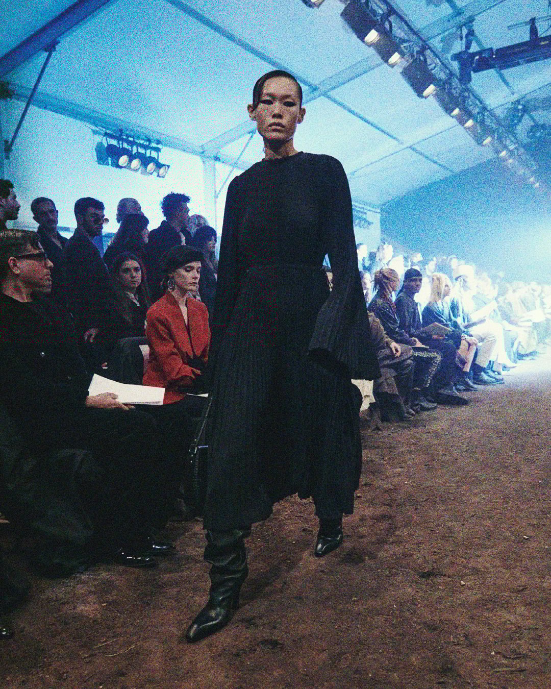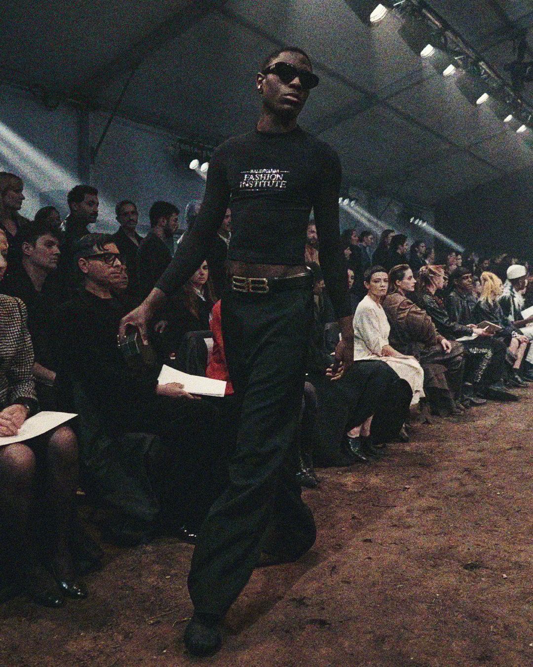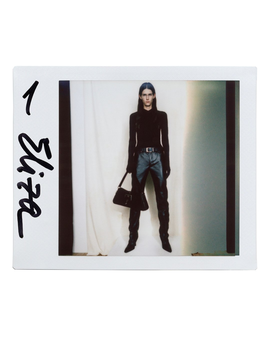 バレンシアガのショーの常連モデル、エリザ・ダグラス(Eliza Douglas)によるブラック一色のファーストルックで特徴的なのは、パンツとブーツが合体したパンタブーツ。トップスはグローブ付きで、首から下の肌を全て覆うような仕立てとなっている。その後に続くルックもブラックがベースで、肩幅が目立つビッグサイズもあれば極端にタイトなフォルムも。過剰なシルエットは、レイバーとポストグランジを解釈したという。