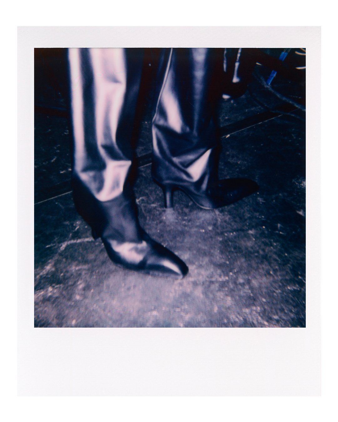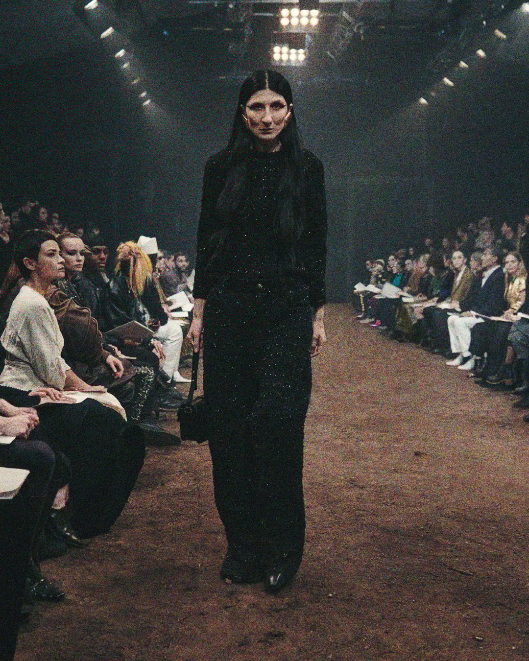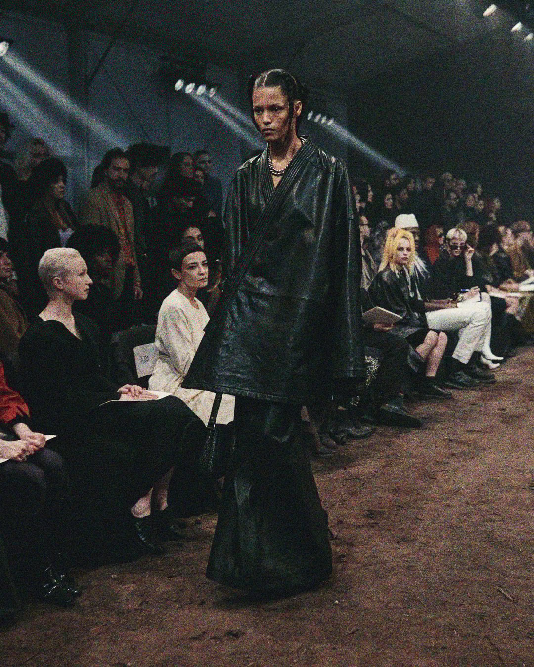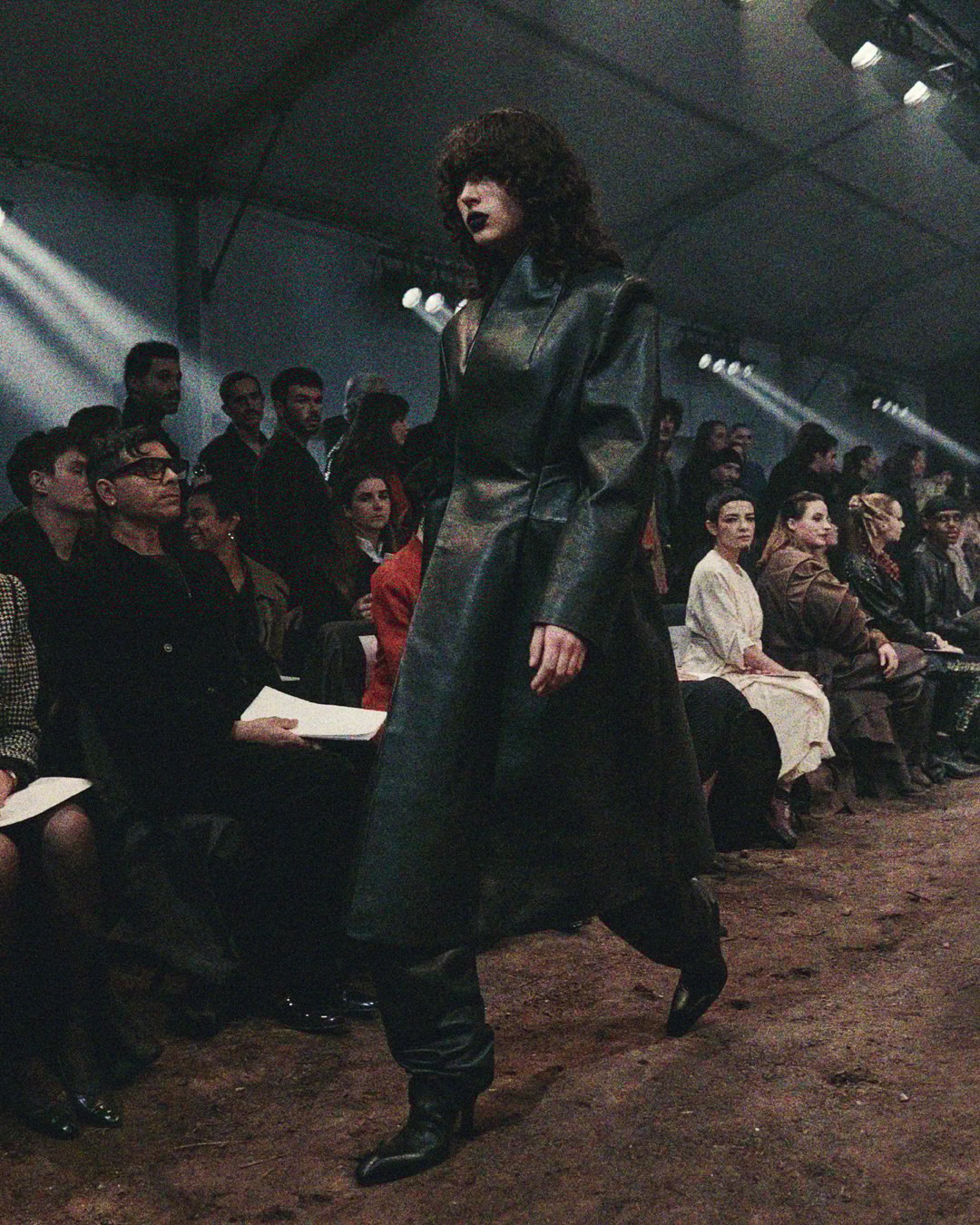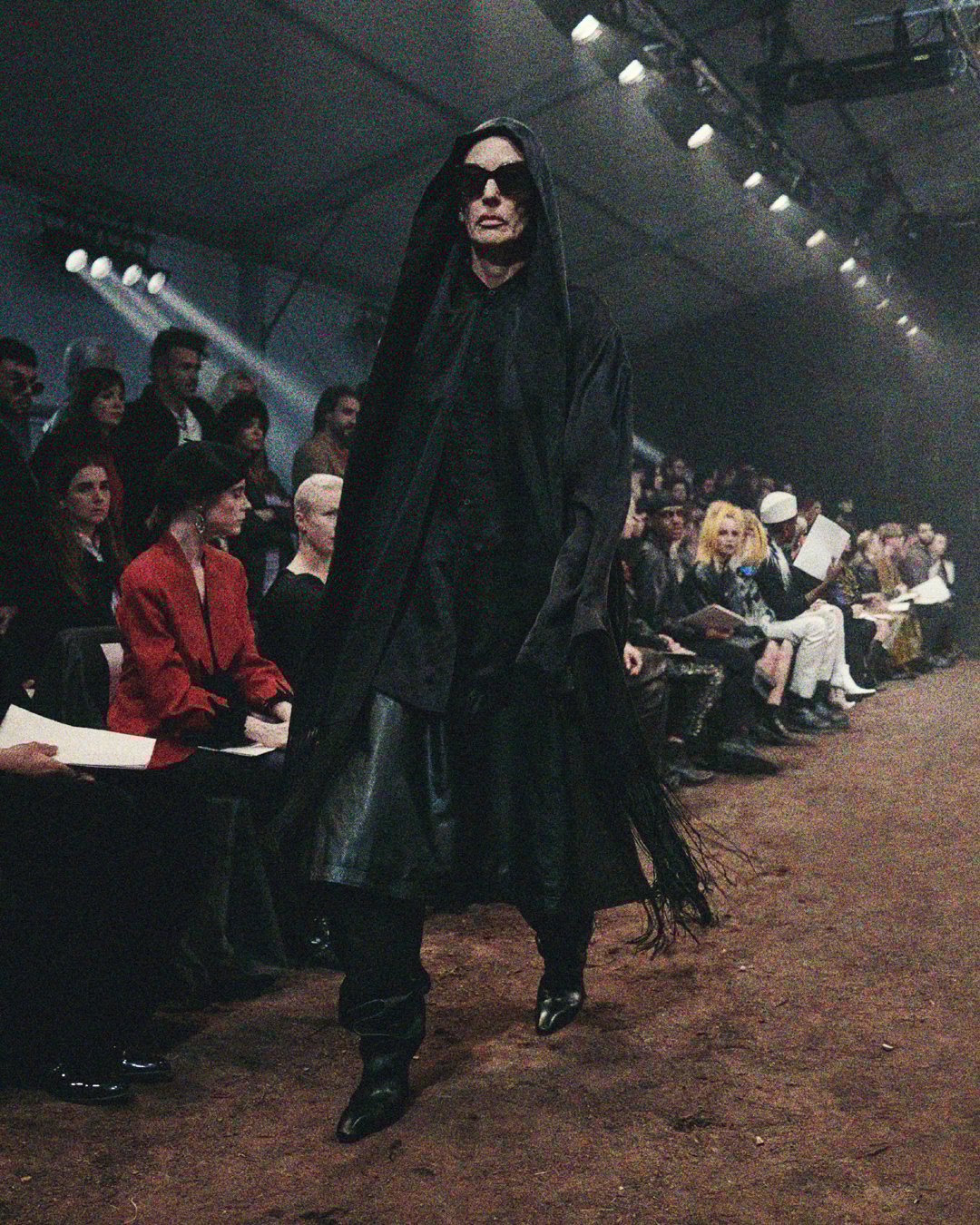 バレンシアガのショーの常連モデル、エリザ・ダグラス(Eliza Douglas)によるブラック一色のファーストルックで特徴的なのは、パンツとブーツが合体したパンタブーツ。トップスはグローブ付きで、首から下の肌を全て覆うような仕立てとなっている。その後に続くルックもブラックがベースで、肩幅が目立つビッグサイズもあれば極端にタイトなフォルムも。過剰なシルエットは、レイバーとポストグランジを解釈したという。