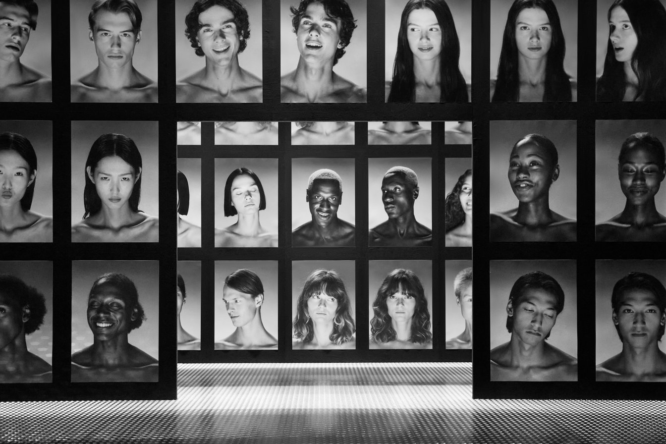 ショーの終盤、ビープ音と共に正面の壁が上がり、現れたのは全く同じ観客席、モデルのセット。まるで鏡越しに自分達の姿を見ているかのような光景が目の前に広がった。実際には、壁の向こう側にも同じ設計のランウェイが存在し同時にショーが行われており、計68組の双子が壁越しに対にウォーキングをしていたというからくり。「TWINSBURG」という今シーズンのコレクション名はゲストには事前に周知されており、過去に双子を起用したショー演出が頭によぎったファッション関係者も少なからずいたかもしれないが、意表をつく出来事にすぐには状況を理解できず、困惑した観客席からどよめきの声が漏れた。