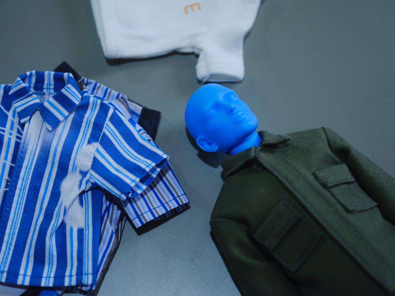 没個性という個性を持ったフィギュアを作りたいというイメージを当初から一貫して考えていたので、「のっぺらぼう」をいうのはフィギュアを設計する上で最も重要視したポイントです。 バービー人形のような「バービー」というキャラクターを前提とした着せ替え人形とはコンセプトが似ているようで全く違います。Helsドールは服のためのフィギュア。なので、フィギュアそれ自体に個性を持たないように考えました。ボディカラーが青とグレーなのも、キャラクター性から距離を取るため。人間らしい肌の色をラインナップしていないことも、同じ考えによるものです。