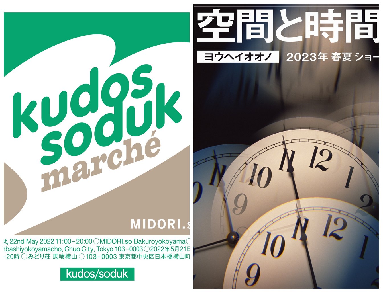 左)「ヨウヘイオオノ」2023年春夏コレクションで発表された出口が手掛けたグラフィックデザイン 右)「クードス」/「スドーク」2023年春夏コレクションで発表された出口が手掛けたグラフィックデザイン