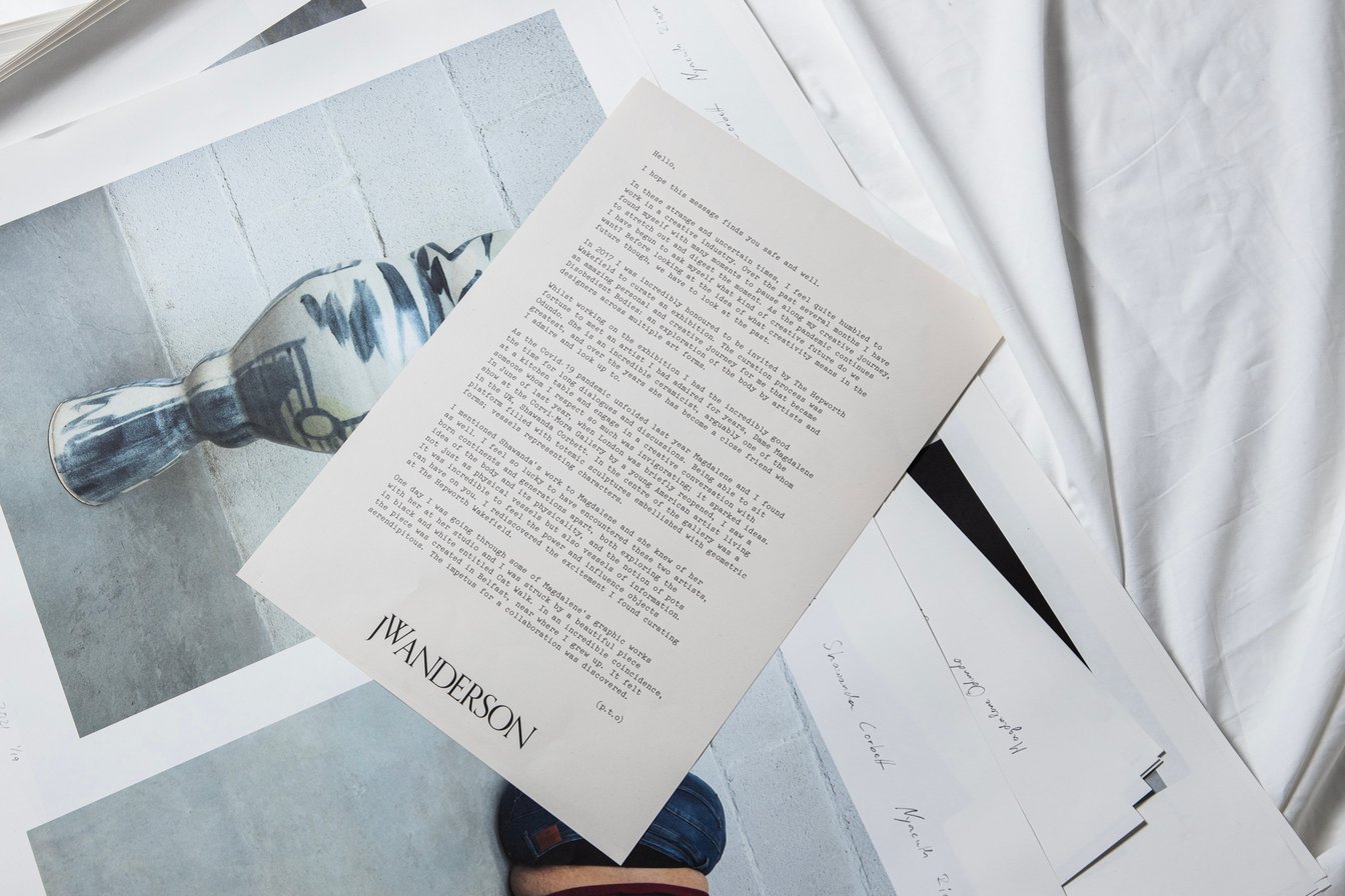 JW アンダーソン2021年秋冬ウィメンズのコレクション発表の前日、編集部に巨大な筒状の箱が届いた。今回も「collection in a box」の形式で、中に入っていたのは両面印刷された19枚のB1サイズのポスター。裏面までびっしりと文字が詰まったジョナサンからのパーソナルレターも添えられていた。