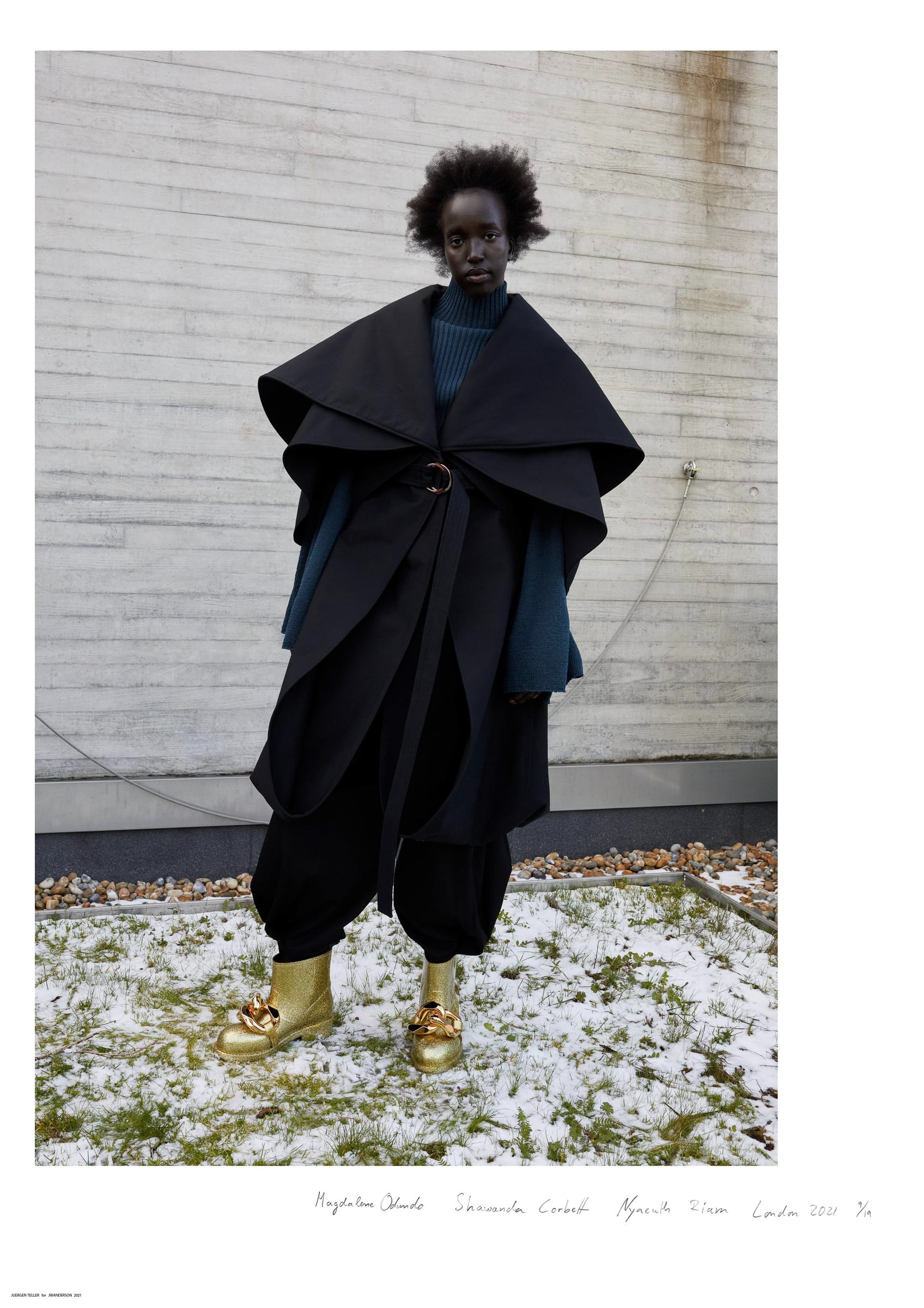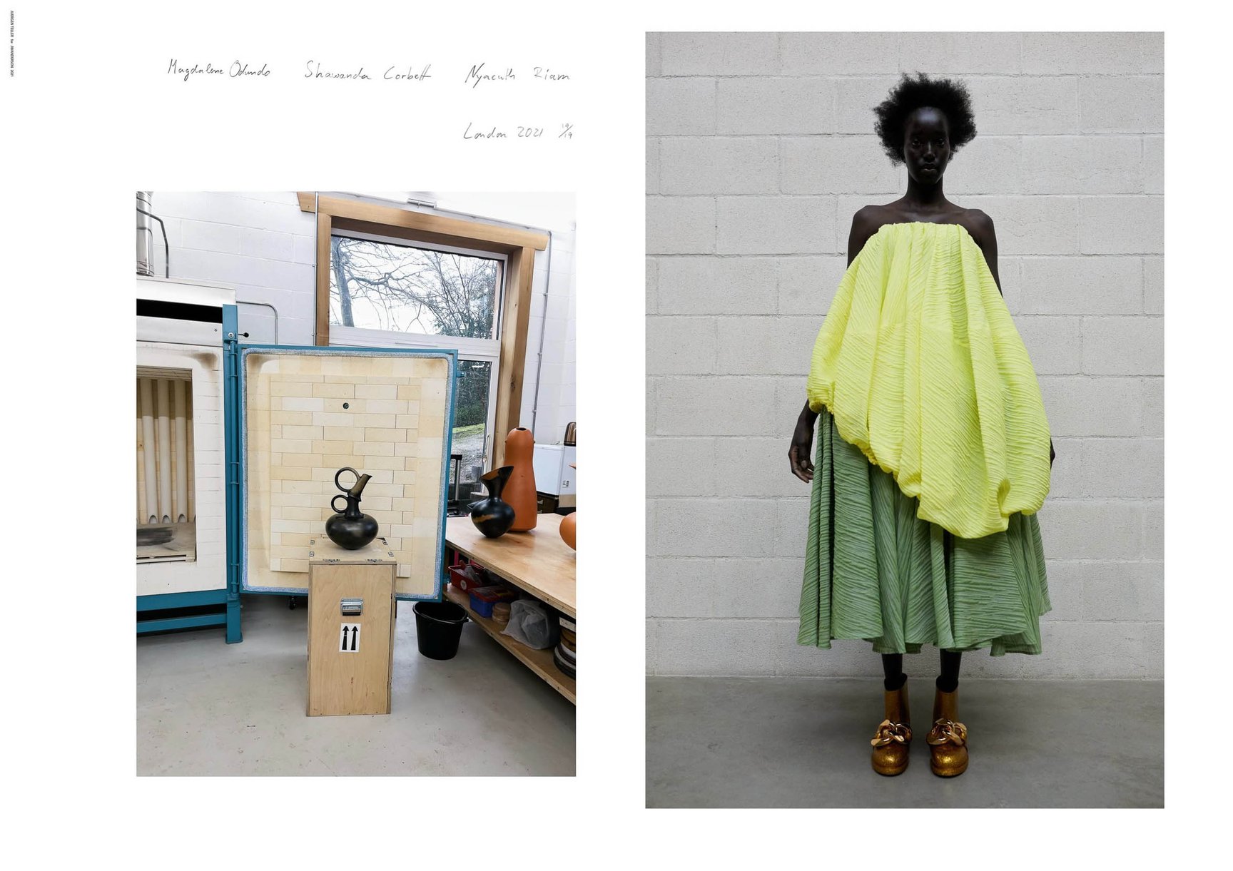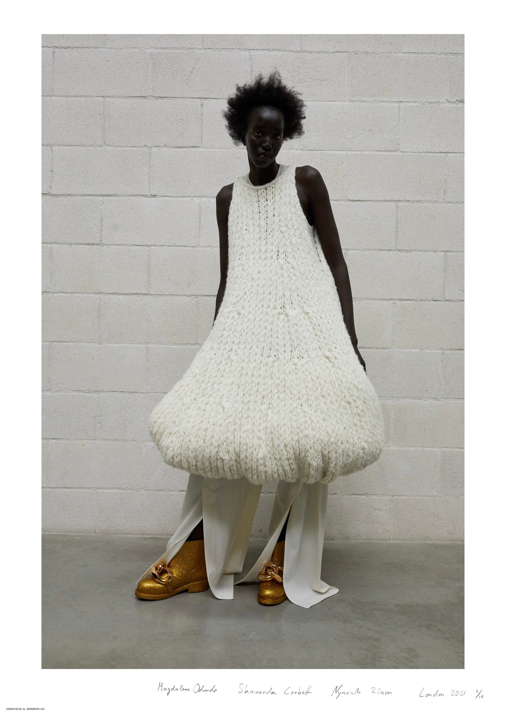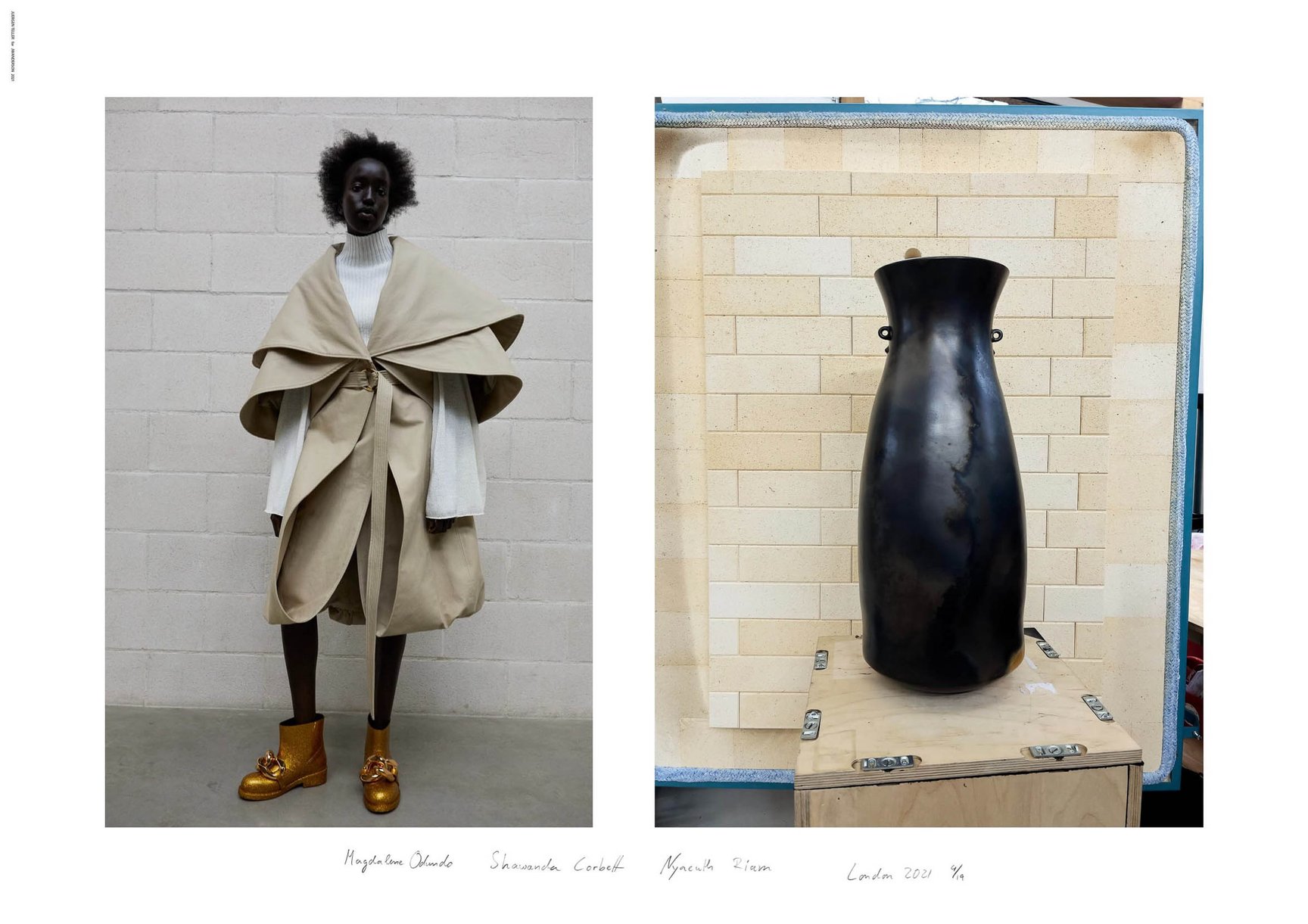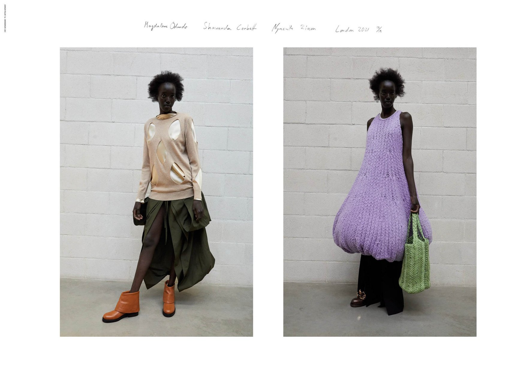 コレクションでは2人との対話や作品を通して体と曲線の関係性を模索。玉ねぎのようなシルエットのボリューミーなニットドレスや、布の重なりがショルダーから前見頃にかけて美しい曲線を描くケープコート、薬玉のように巨大なボンボンのバッグなど実験的なフォルムのピースが並ぶ。それらはユルゲン・テラー(Juergen Teller)によるフォトシューティングによって瞬間的に切り取られ、一つのプロジェクトとして完成する。発表直後、オンラインインタビューに応じたジョナサンは「デザイナーとしてのキャリアの上でも大いに影響を受け、僕自身も収集するほど好きな『陶器』という接点から2人にフォーカスしたかった。ファッションと陶器の関係性を通してボディを語るということを試みたんだ」と話す。