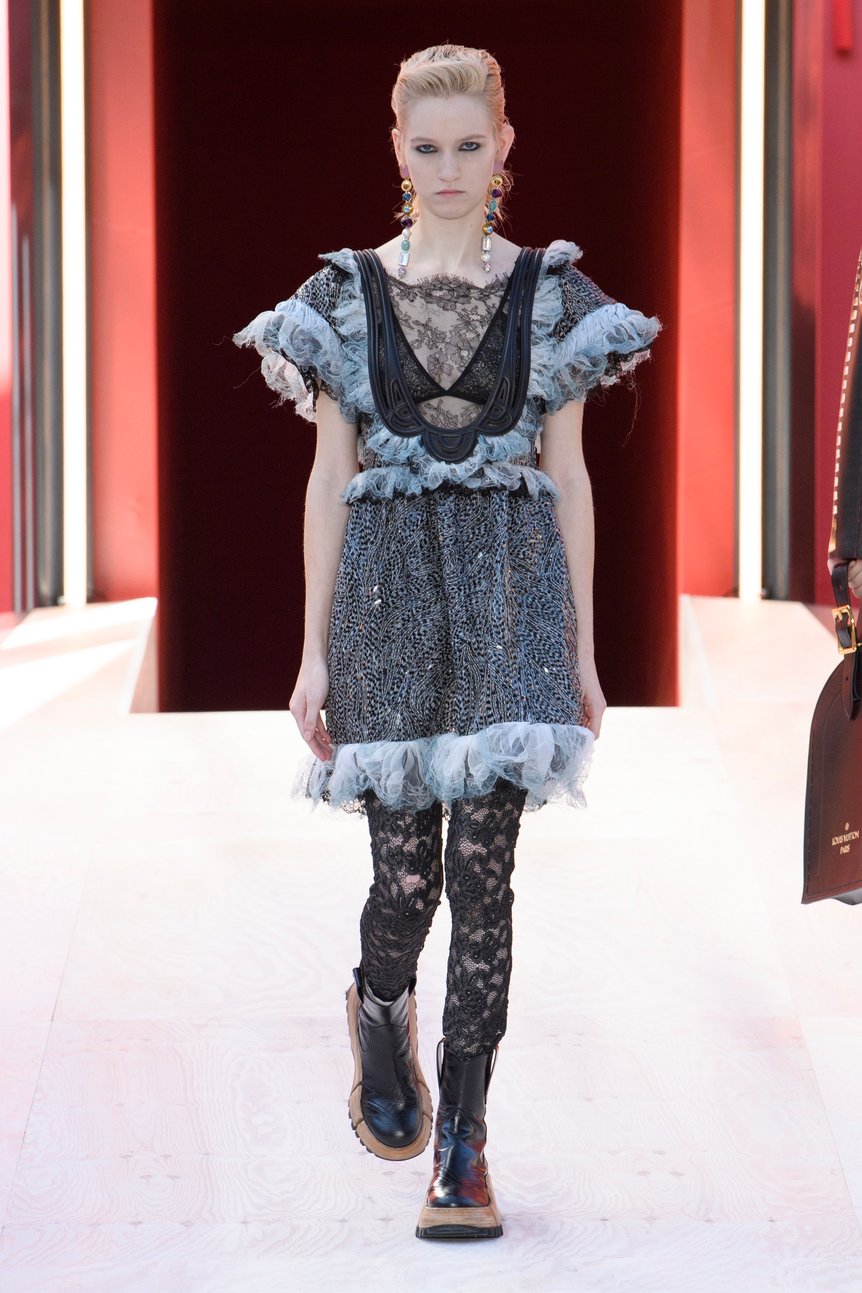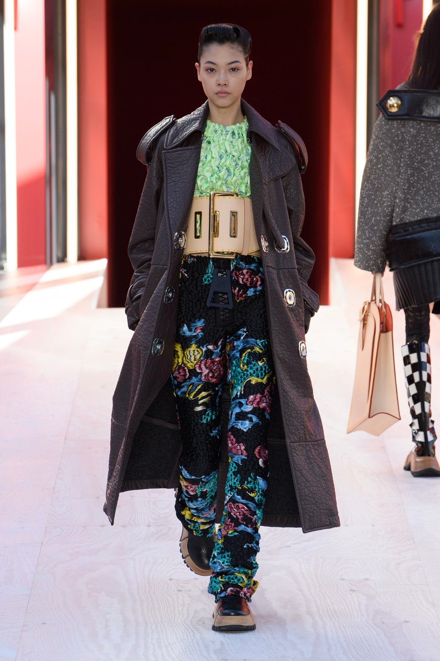 ファーストルックを務めたのは、メゾンのアンバサダーでもある女優のチョン・ホヨン。立体的な肩のパーツと巨大なジッパーが強いインパクトを与える。アーティスティックディレクターのニコラ・ジェスキエール(Nicolas Ghesquière)が目指したのは、限りなく大きいものと小さいものが溶け合うシルエット。比率を再解釈する試みとして、ユニークなバランスが提案された。