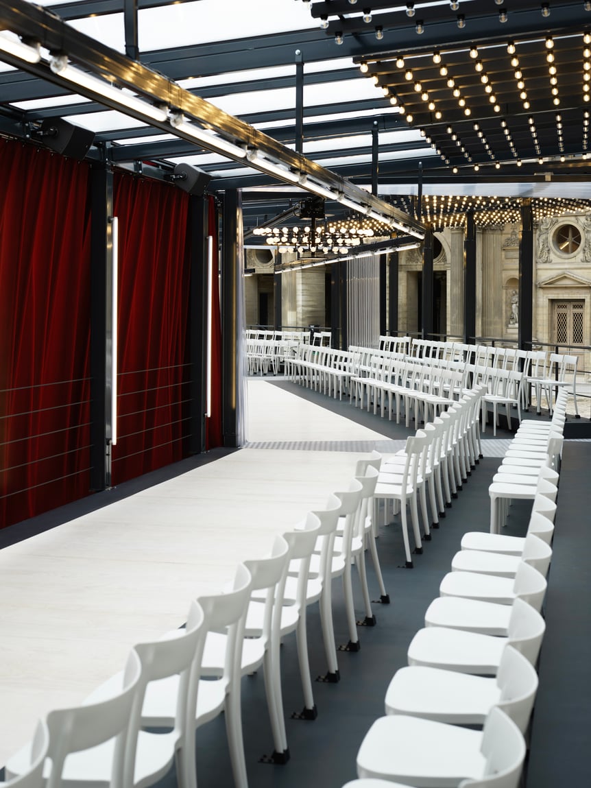 パリファッションウィークの最終日、「ルイ・ヴィトン(LOUIS VUITTON)」2023年春夏コレクションのショーがルーヴル美術館のクールカレ(中庭)で開催された。特設の会場は移動式遊園地の雰囲気で、形に配置された客席の中央には巨大なモンスターフラワーが無数の赤い花弁を広げている。ショーが始まると同時に客席の前のカーテンが開き、電球のシャンデリアや鏡が動き出して、不思議な世界へと誘う。登場した新作ルックもまた、小さな物を大きく、大きなものを小さく表現するなど、現実の感覚が歪むような刺激的なコレクションとなった。