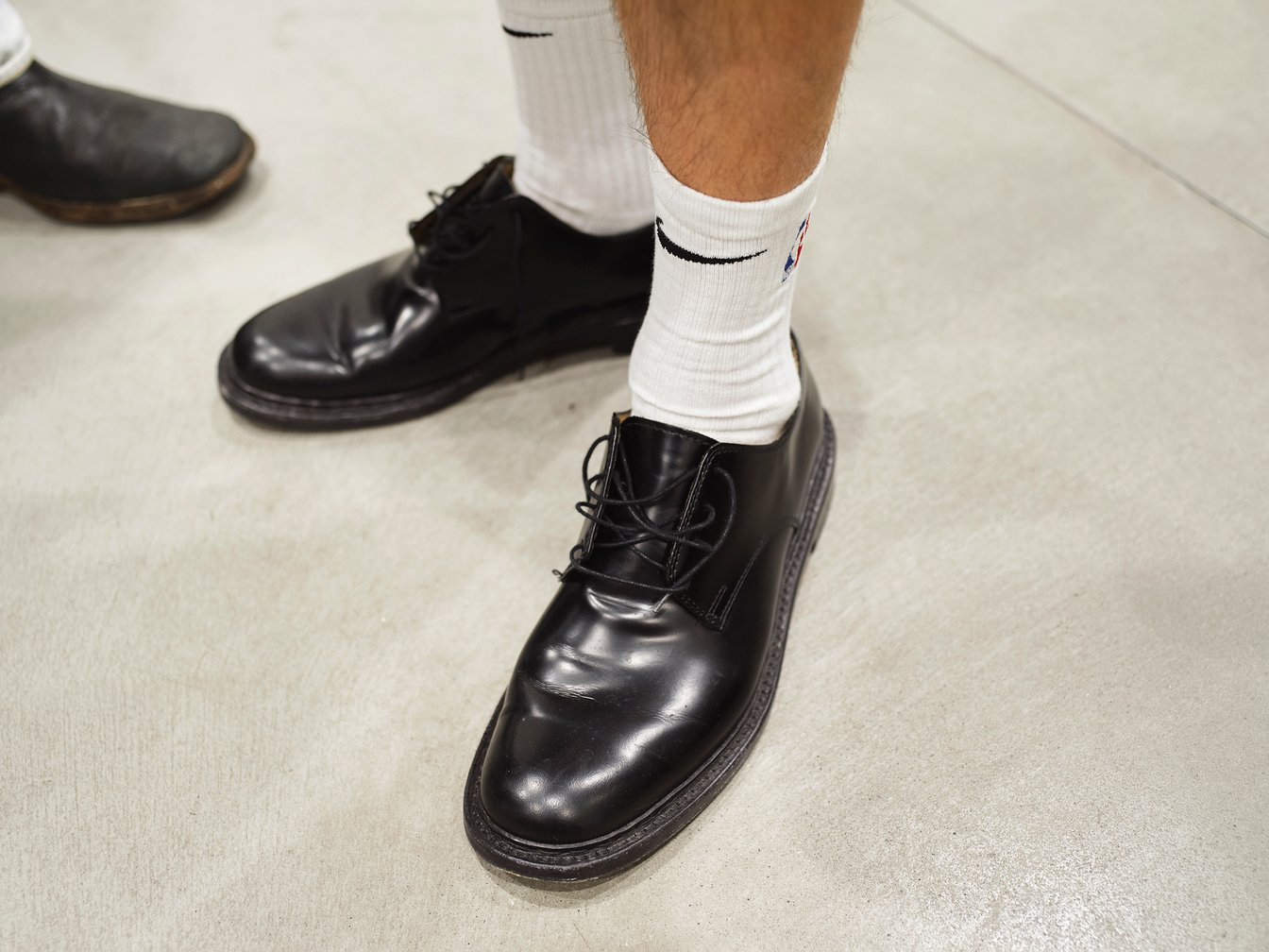 ヨックム・ハリンの足元。ナイキのNBAソックスと紐を結んでいない革靴をスタイリング
