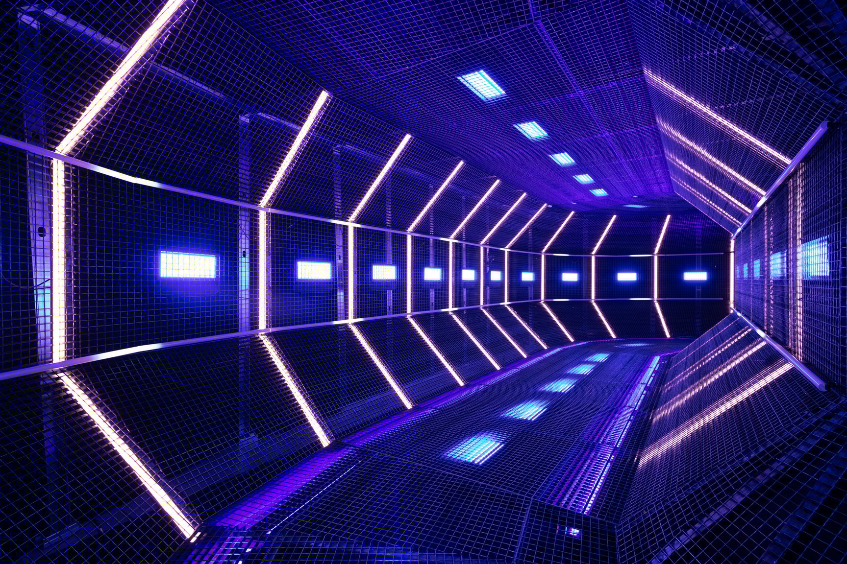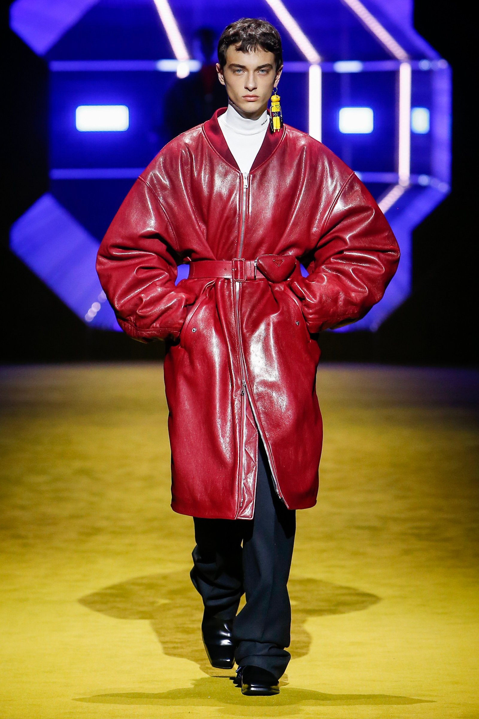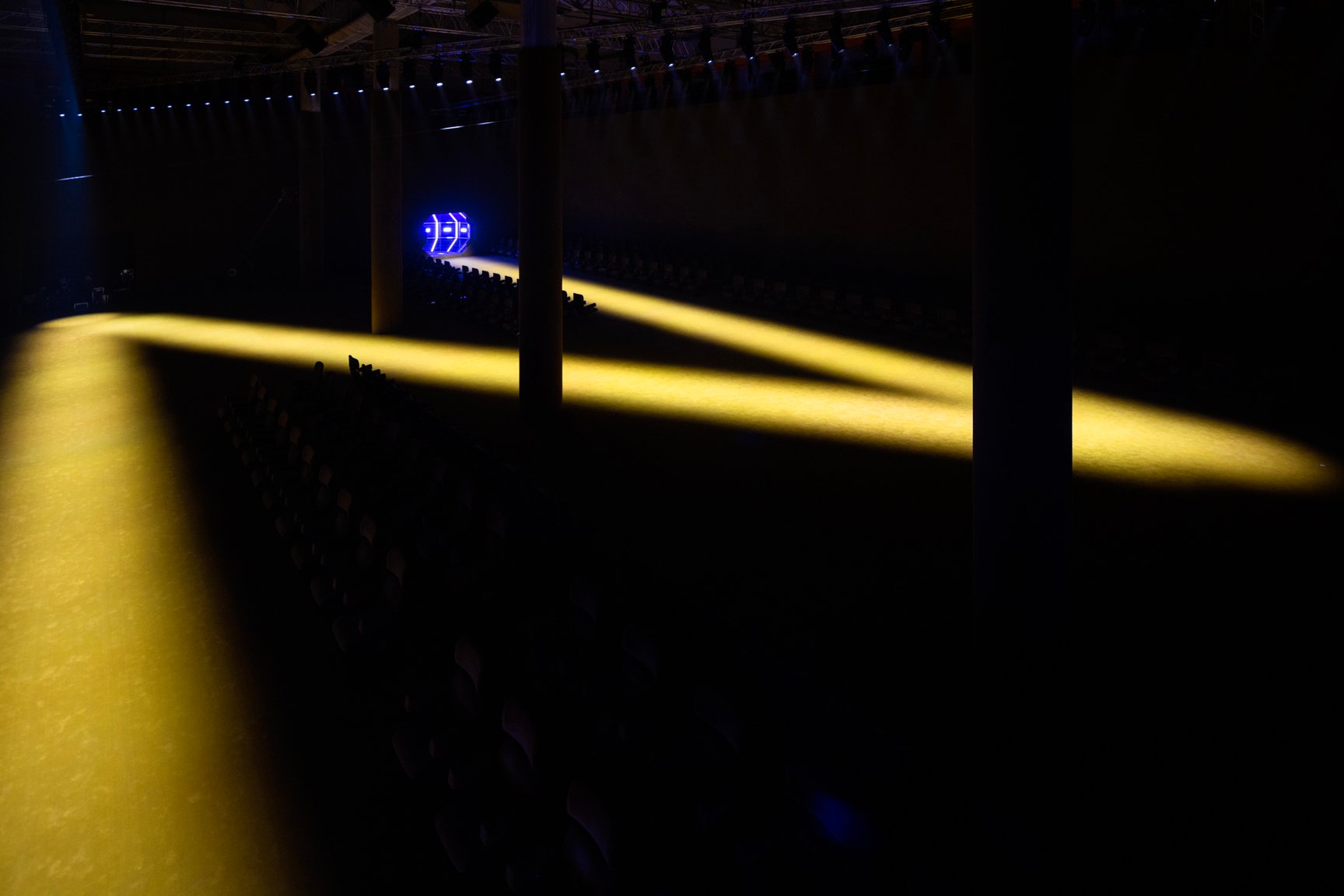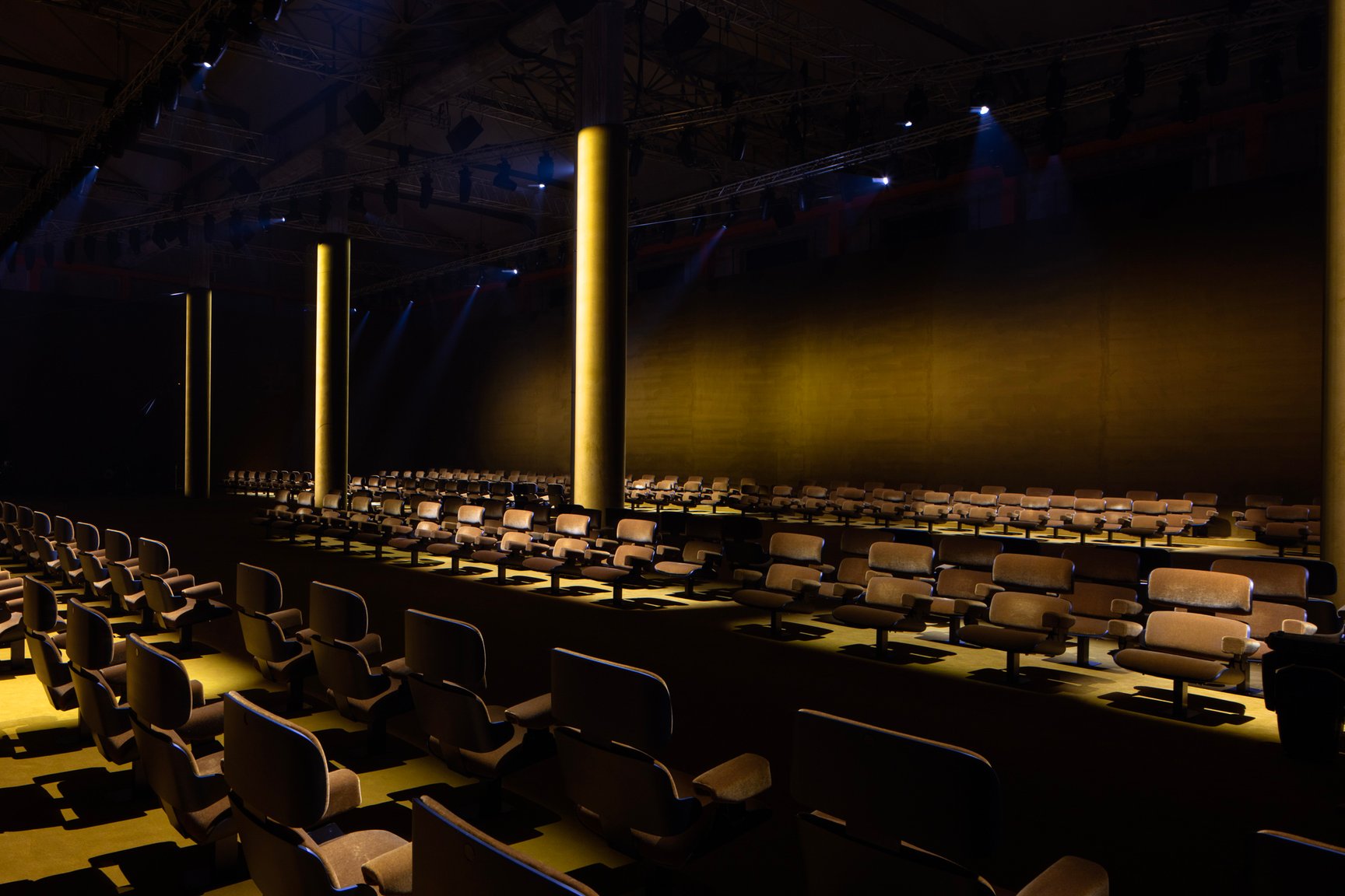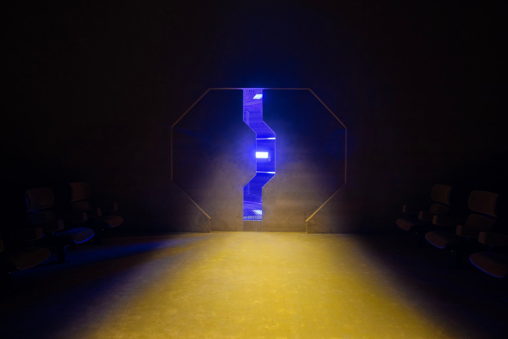 ショー会場は、プラダ財団の複合施設Deposito。ランウェイの一部にSF映画を連想させるセットが設置され、肘掛け付きの椅子が劇場の客席のように並べられた。空間装飾を手掛けたAMOは、アクションの舞台であり誇張された現実を表現する場としてDepositoを再考したという。