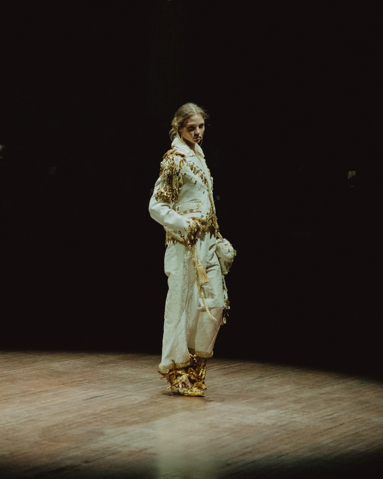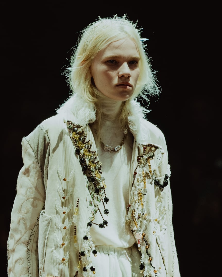 今回の2025-26年秋冬は、20年前のアプローチを引き継ぎながらも過去をなぞるのではなく、新しいコレクションとなっている。そう感じさせたのは、暗闇のランウェイに光を差すように登場したファーストルック。ゴールドの装飾が施された純白のセットアップで、ふくらみのある上質な素材をエフォートレスなシルエットに仕立てている。そして、後に続いたのはアンダーカバー流のリアルクローズだ。