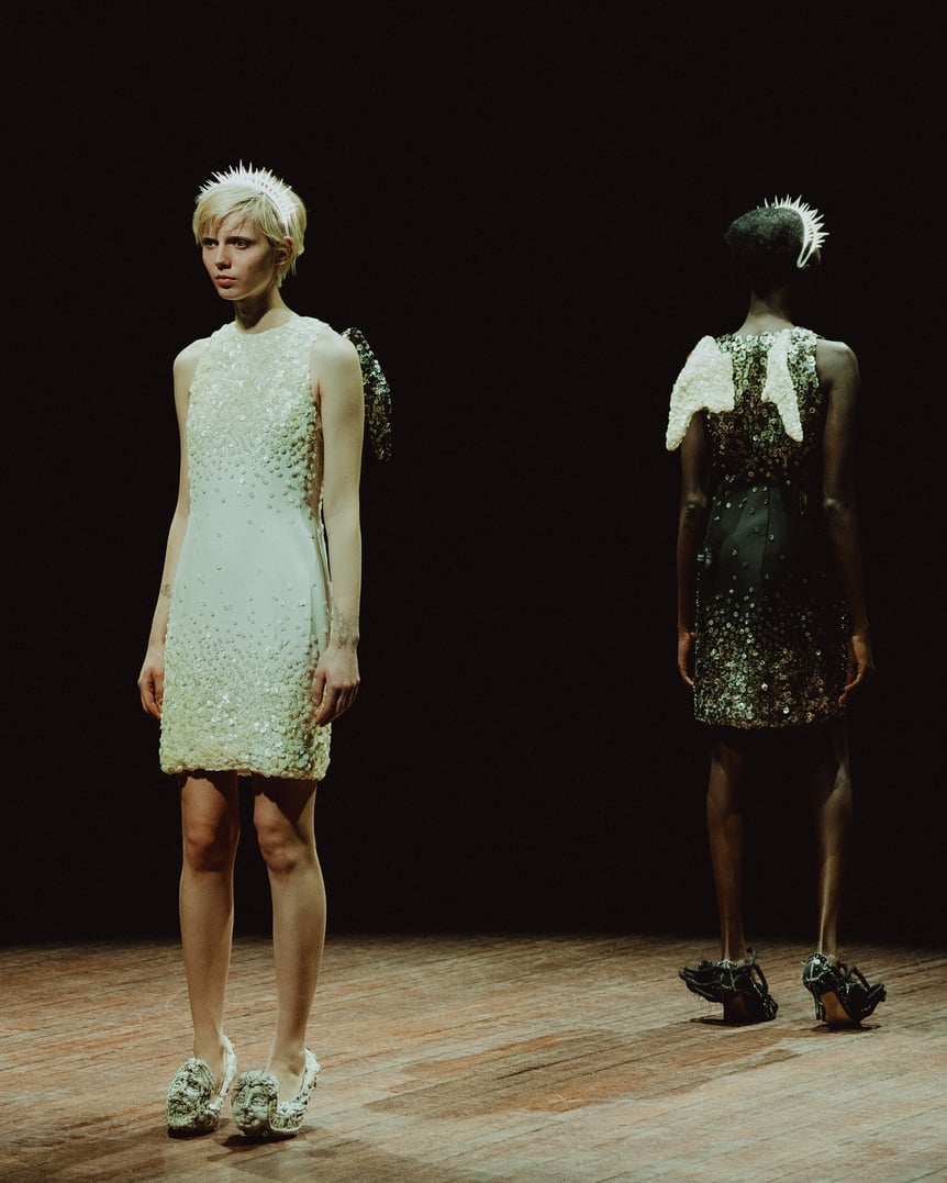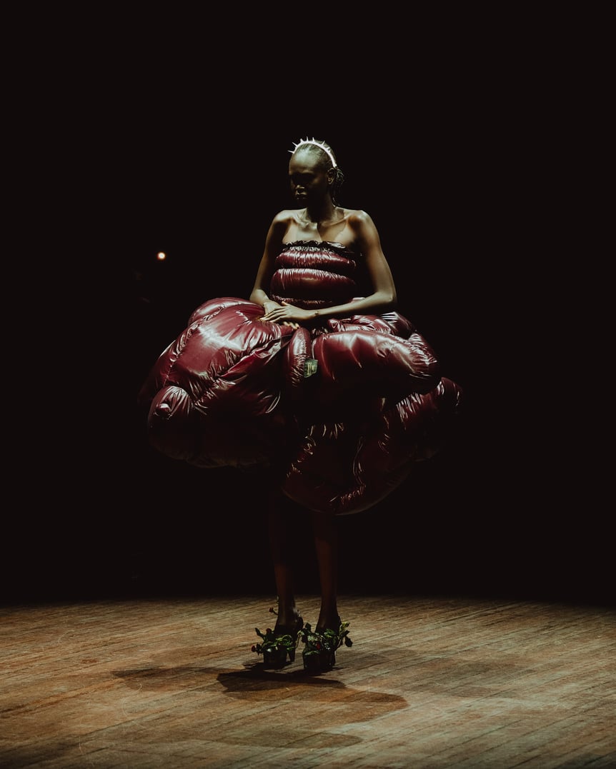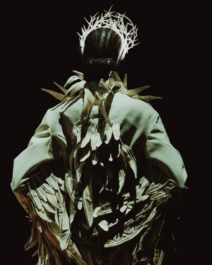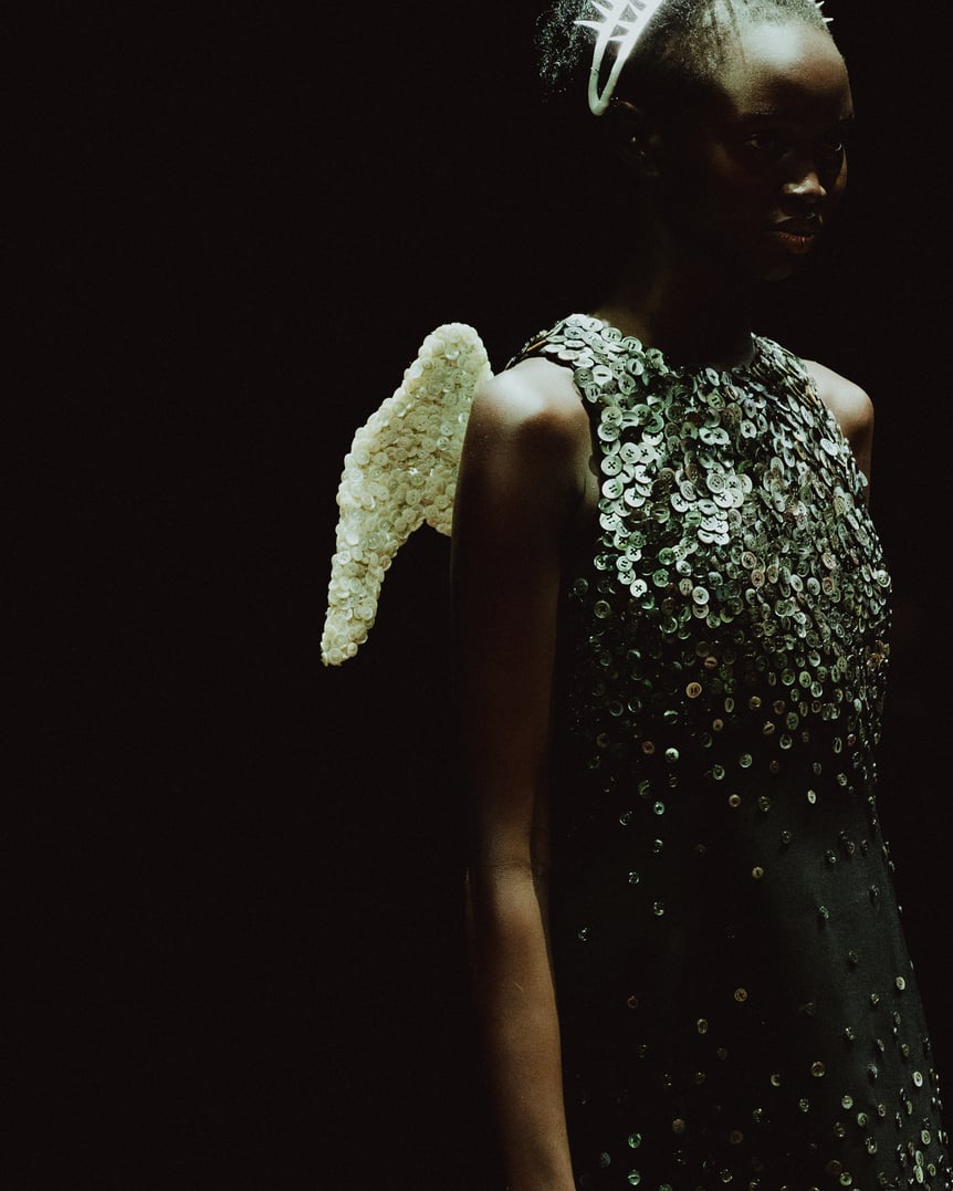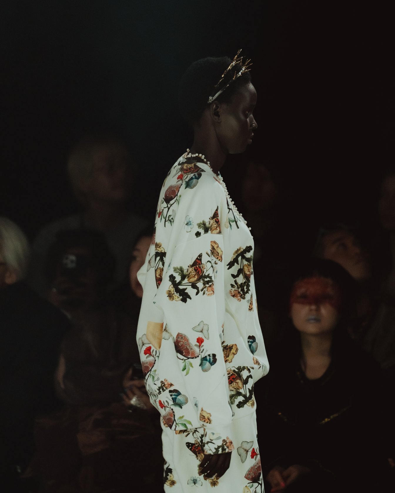 冬の日常着であるダウンジャケットをクリノリン風のドレスに仕立てた2体は、顔や手足のようなパーツが見え隠れし、歩くたびにふわふわと動いて生き物のよう。小さな羽と無数のボタンが刺繍された2体のドレス、そしてフェニックスのような羽根を持つ2体のセットアップは、ブライトサイドとダークサイドという二面性とともに「but beautiful」のテーマを体現し、ラストを飾った。