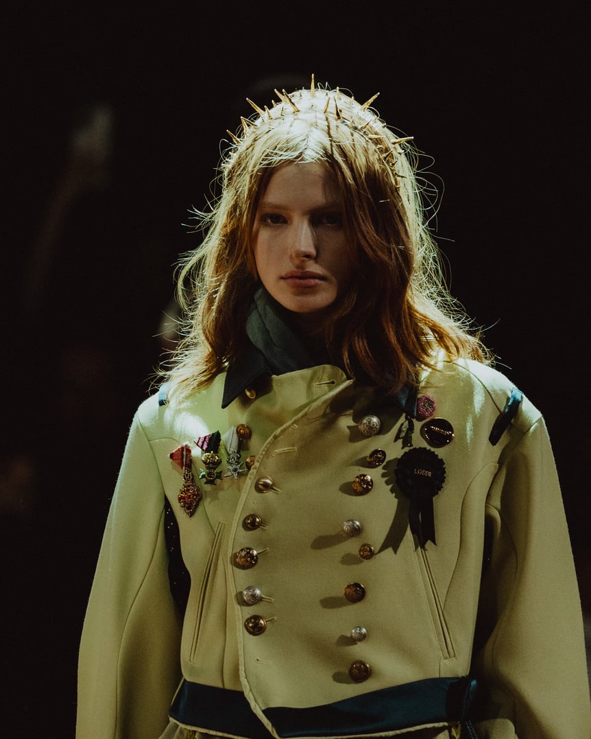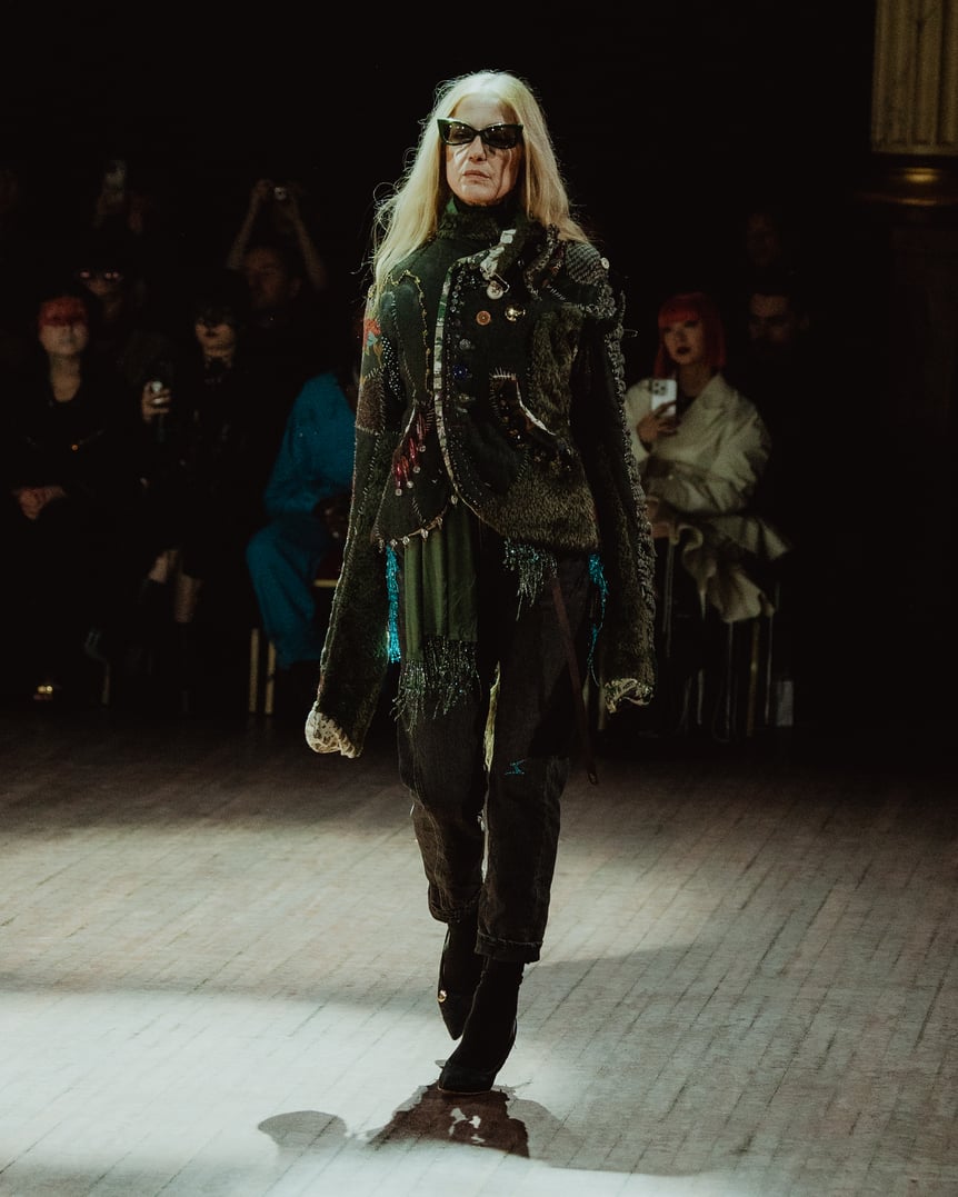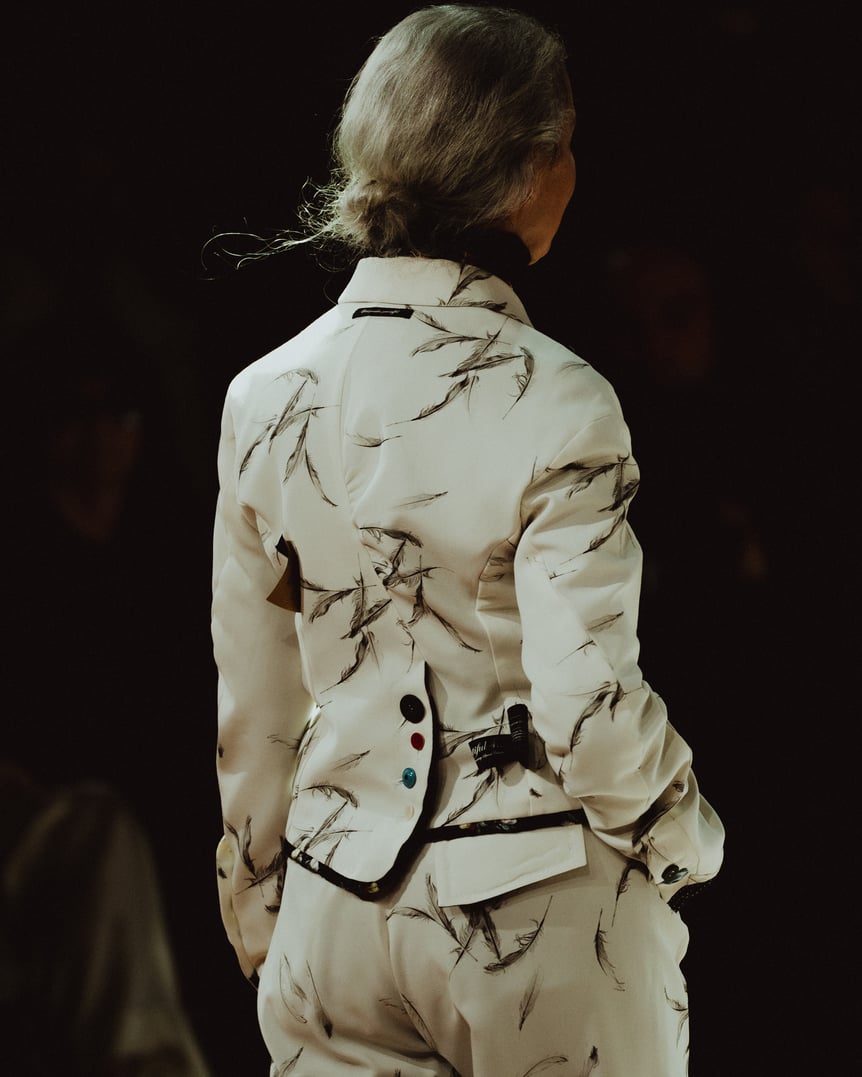 これまでにない試みとして、2004-05年秋冬のアーカイヴピースから3点が今回のショーで再登場。過去のルックを新作コレクションと同時に見せるという珍しい仕掛けだ。20年前のアイテムは時を経てもなお魅力を放ち、混沌としたランウェイで最新のクリエイションと混じり合っていた。グレイヘアのモデルも多く、唯一無二の個性をまとう服が自立した女性像とリンクする。