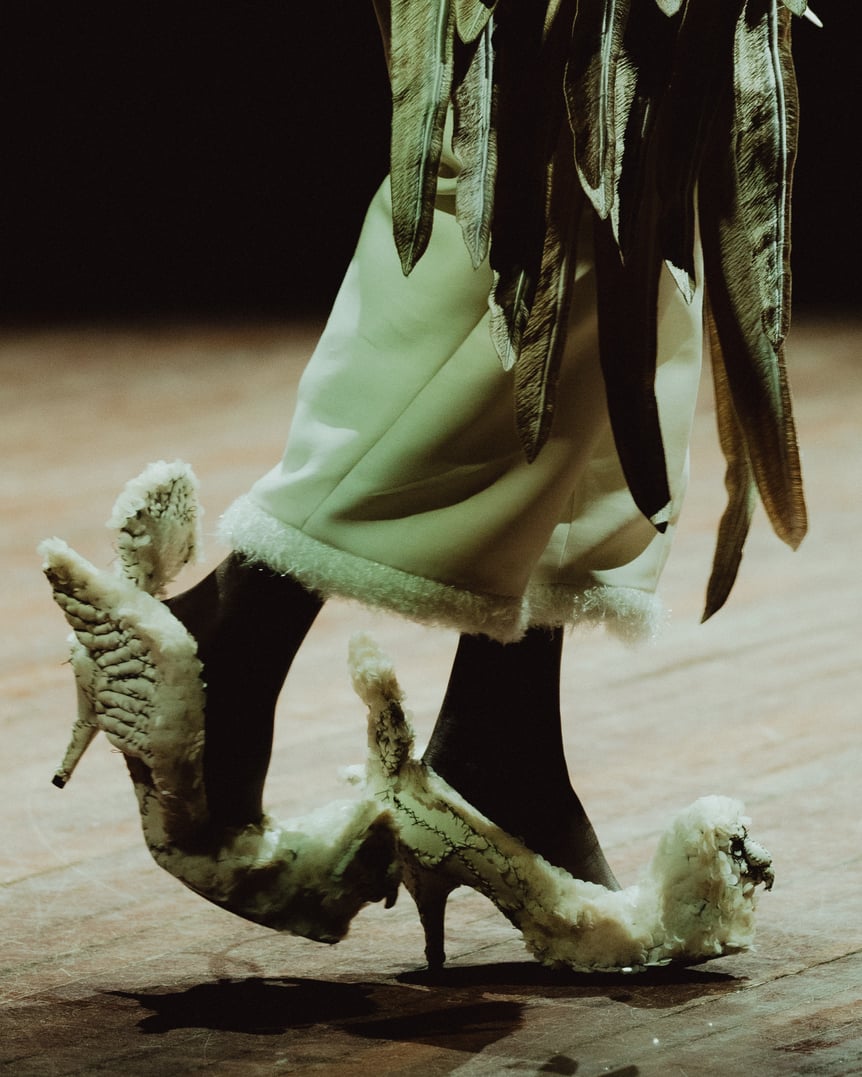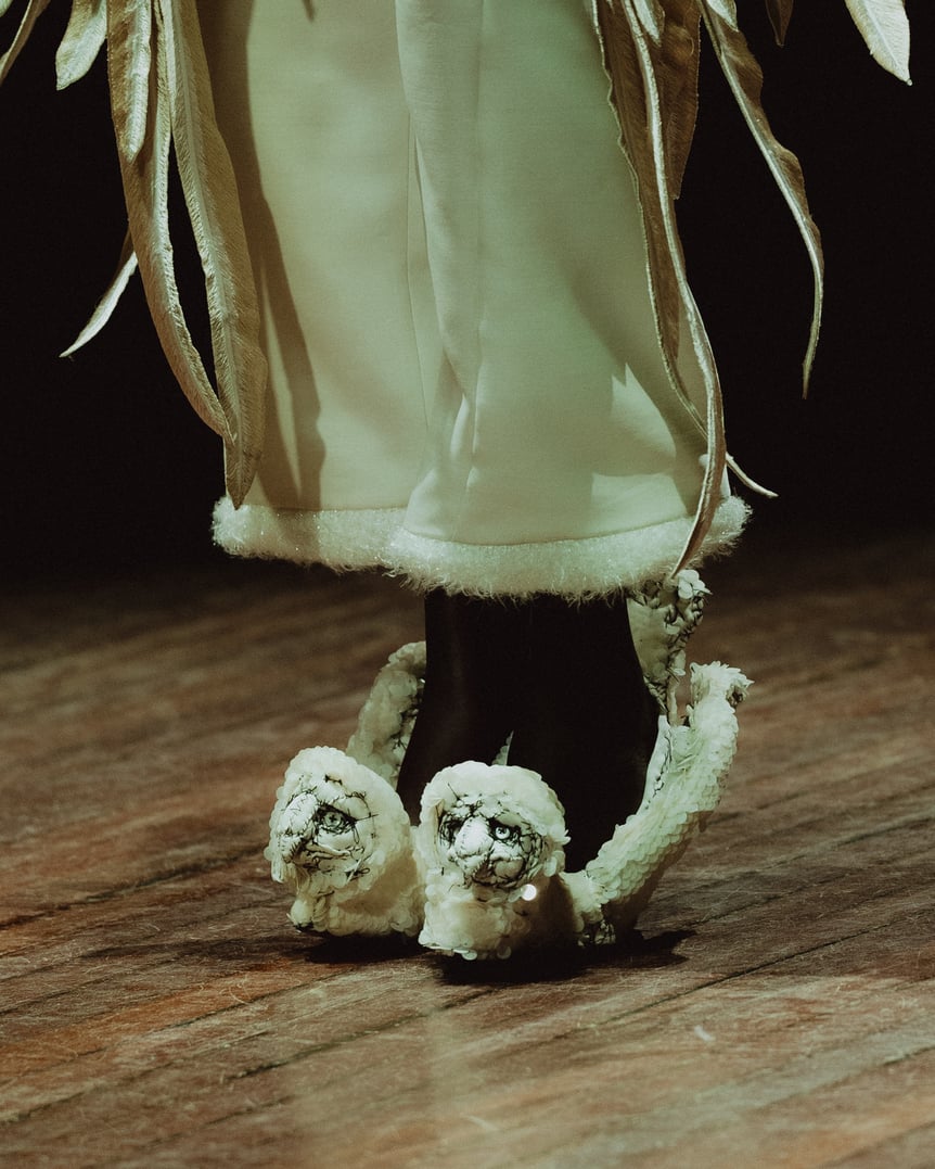 そして極め付けは、今回のためにアン・ヴァレリー・デュポン本人が制作したシューズ。「自由に作ってほしい」というオファーに対し、「想像以上の作品が上がってきた」という。手縫いによって命を吹き込まれたカラスや動物たちが、足の先まで存在感を与えた。