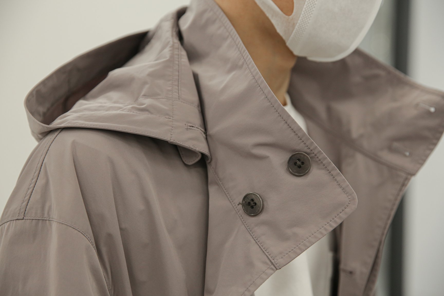 編集A:まずはオーバーサイズフーデッドロングコート。素材がポリエステル100%です。ジル・サンダーデザインのナイロンコートは定番ですよね?