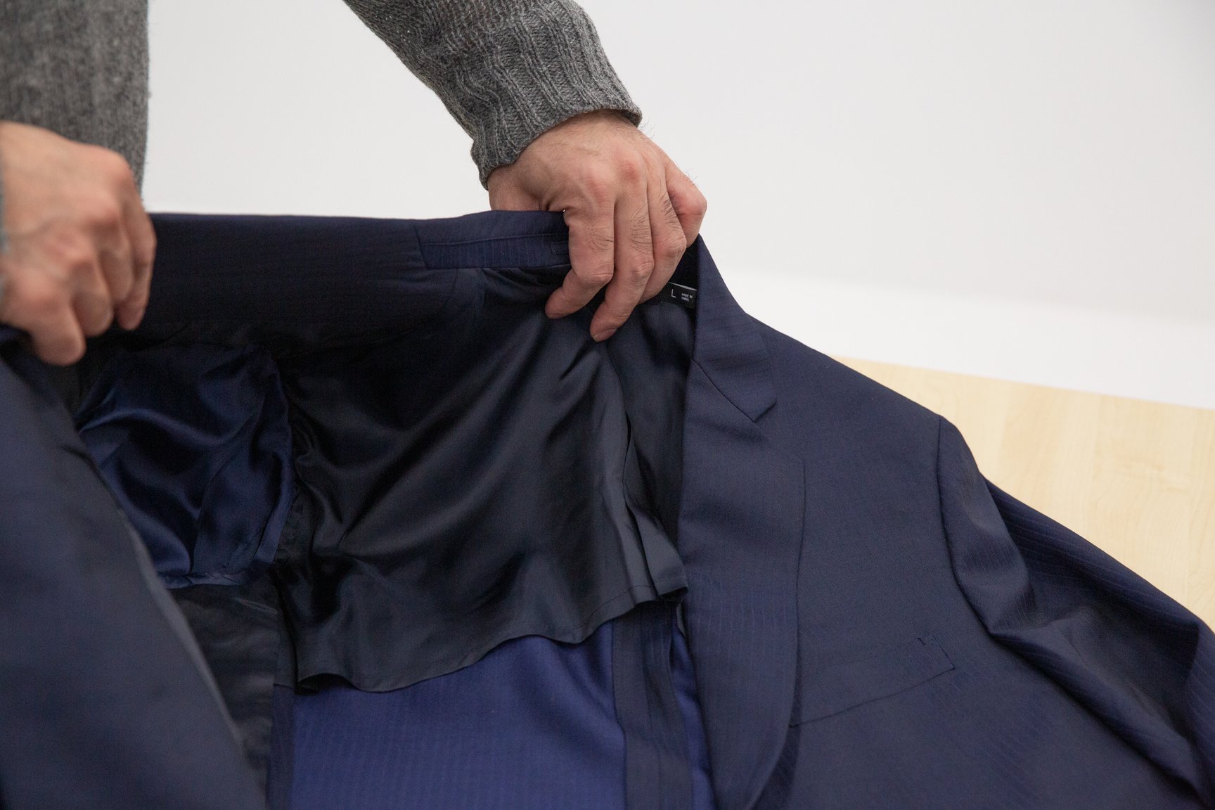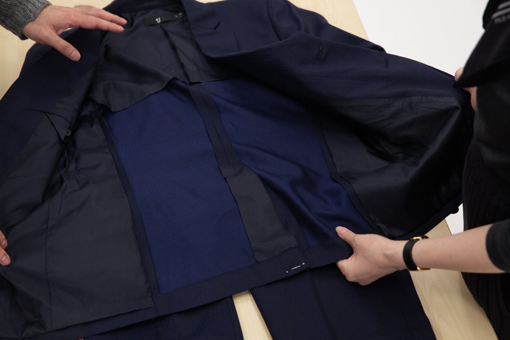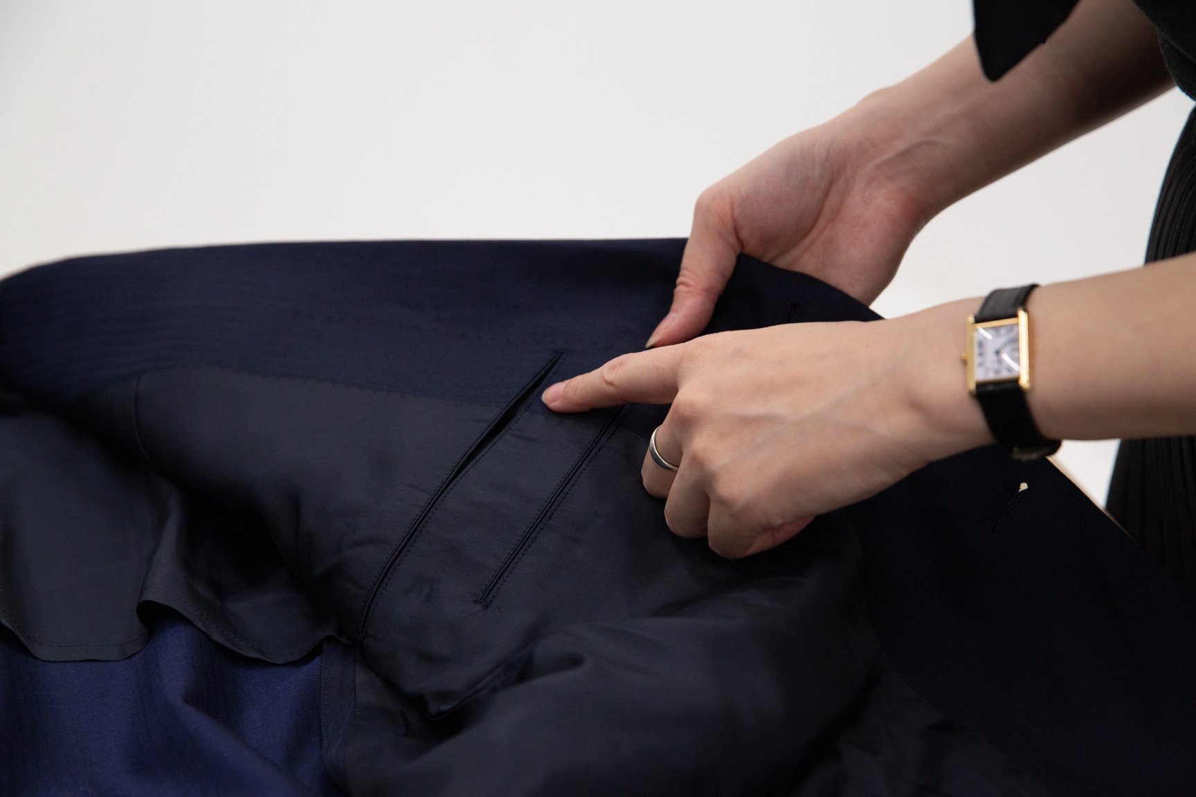 編集B:ジャケットの裏地は背抜き仕様。クラシックなスーツを踏襲している感じですね。シルエット的にはボックスに近い。春夏ということで軽さもポイントです。