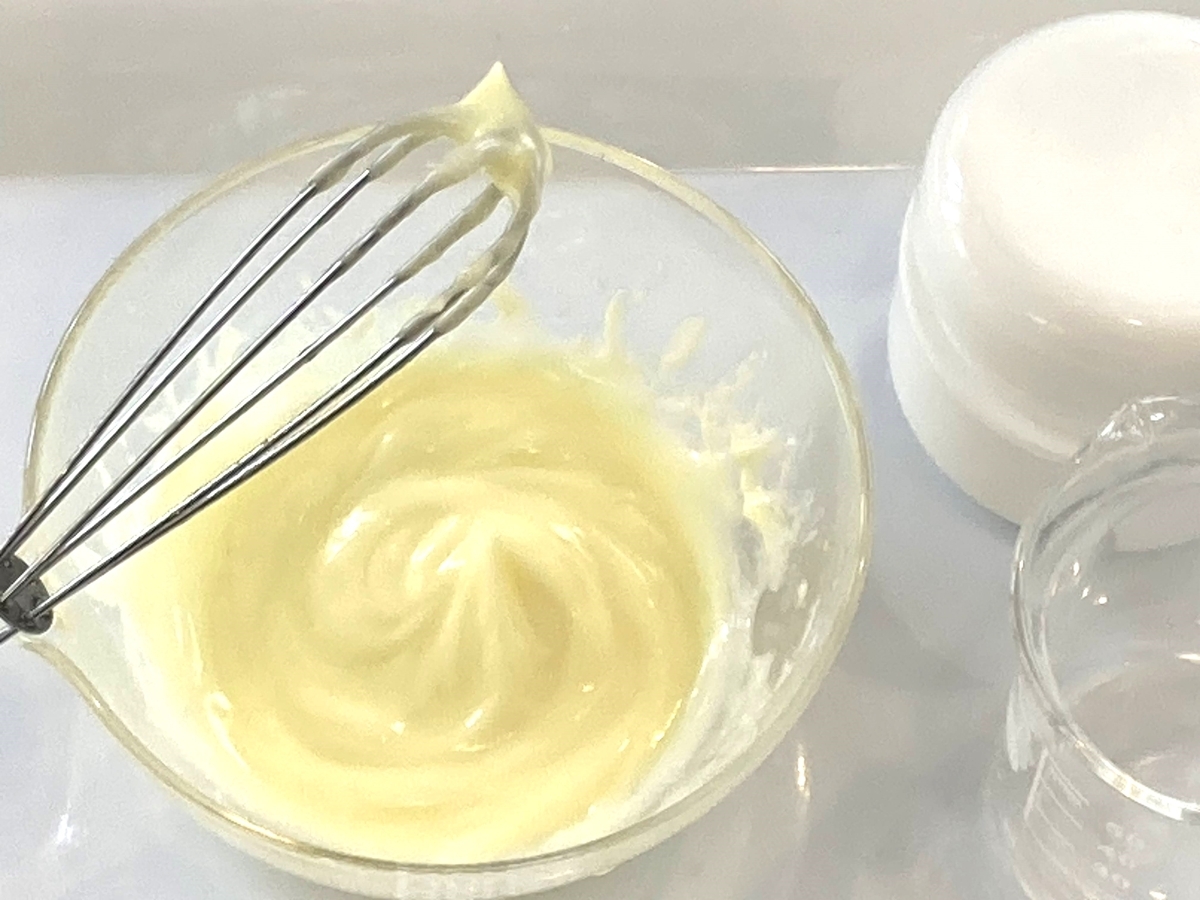 - 油溶性Aボウルに、水溶性Bボウルを少しずつ加え、乳化させて完成!