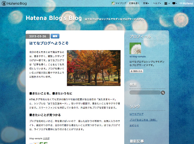 一見すると個性的なデザインですが、ブログ部分は読みやすいようすっきりまとめられています。幻想的なデザインのため、日常の記録はもちろん、創作などにも適しています。
