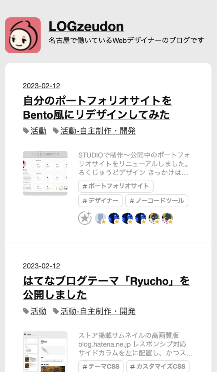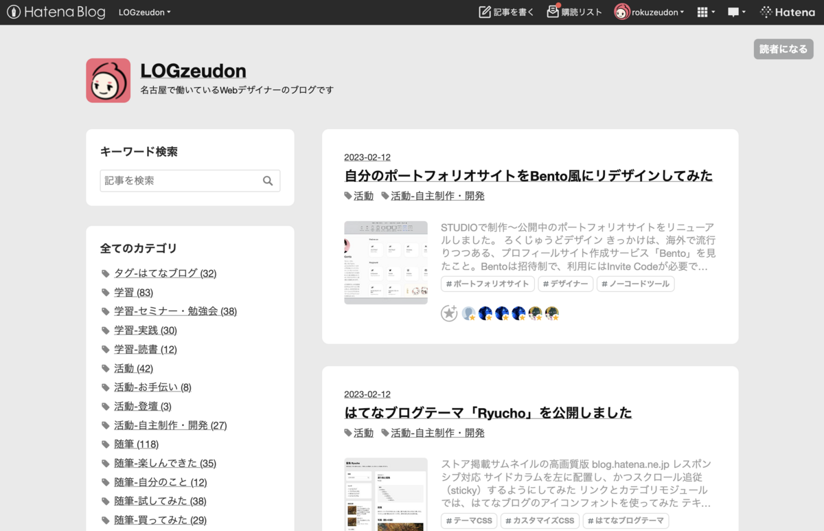 「Ryucho」はとてもベーシックです。角丸など調整はありますが、Hatena-Blog-Theme-Boilerplateをベースにして大きな手は加えていません。着手から公開まで1日もかかりませんでした。