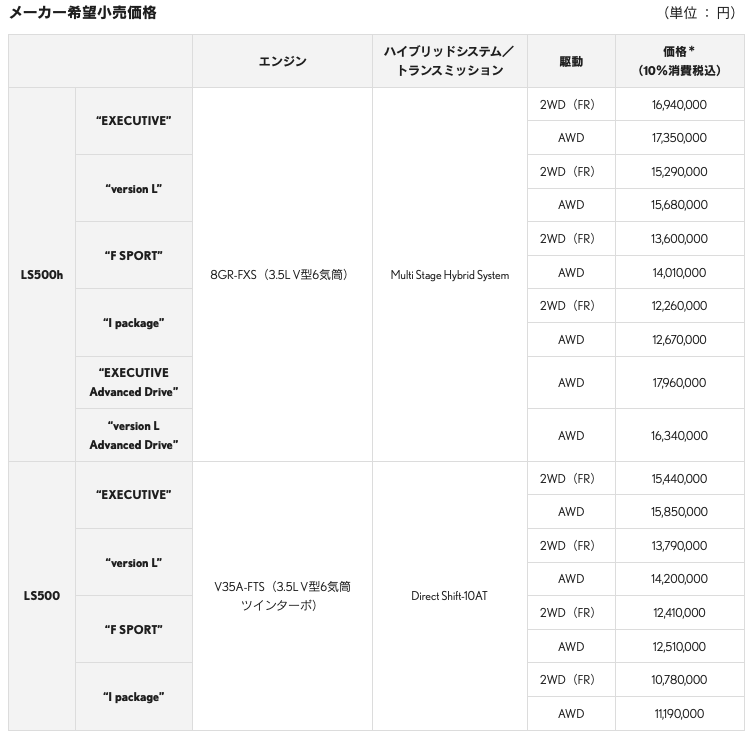 >>レクサス LS(ハイブリッド)のスペック詳細はこちら