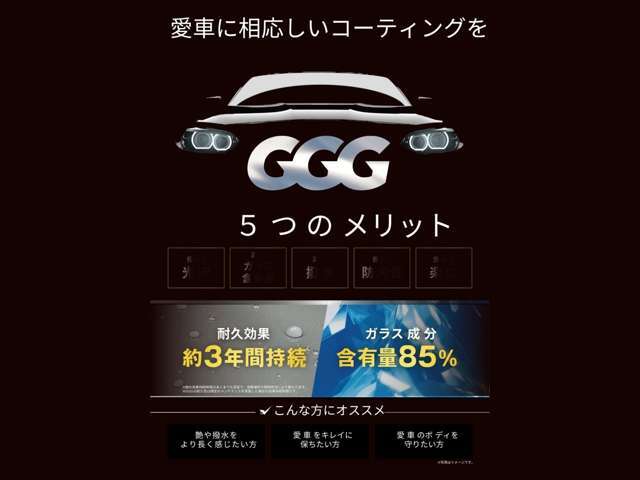 補足 | - | お好きな番号が選べます!※ご希望のナンバーによっては抽選になる場合があります。詳しくは店舗までお問い合わせ下さい。 | GGGの耐久年数は約3年! ガラス成分も85%と撥水、光沢、防汚力と美しいコンディションに保つことができます!! |