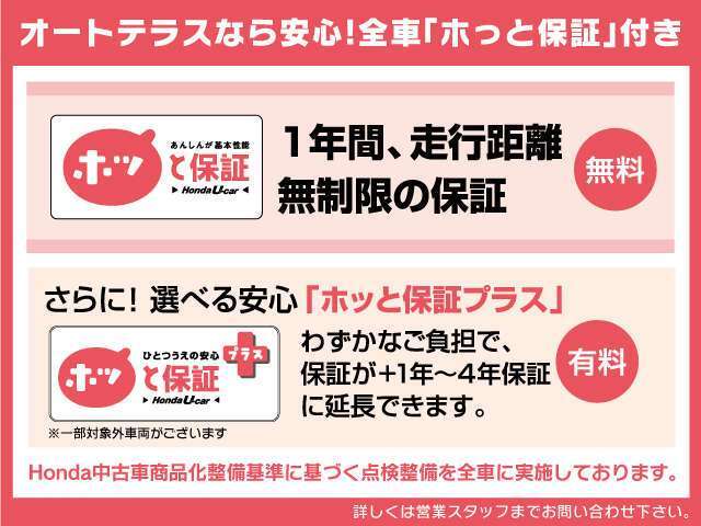 保証 | 保証付 詳細については、販売店にご確認ください。 保証期間:1年 保証距離:無制限 無料で2年間走行距離無制限保証!オプションで5年保証に変更可能!詳細は購入プラン(パック)を参照いただければ幸いです。ハイブリッド機構は初度登録から10年無料保証!全国ホンダディーラーで保証整備可能!※他県や最寄に弊社店舗がないお客様も全国のホンダディーラーで安全・安心の保証・整備を受けていただく為に、ご自宅の最寄りホンダディーラーへお客様・車両情報を登録させていただくことが販売の条件となります |